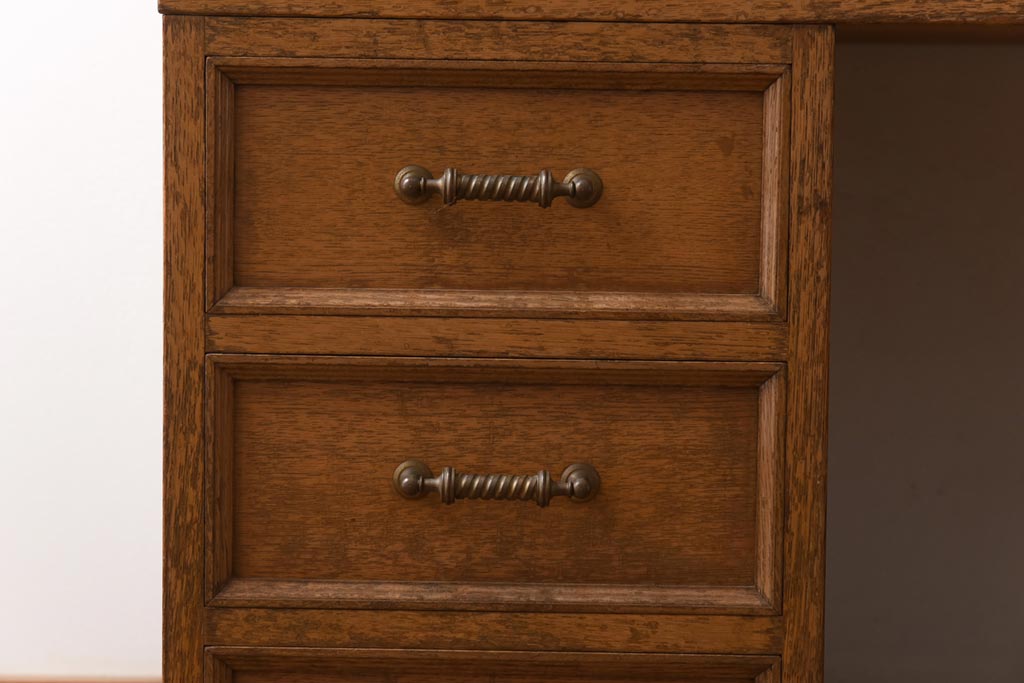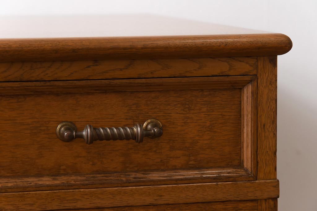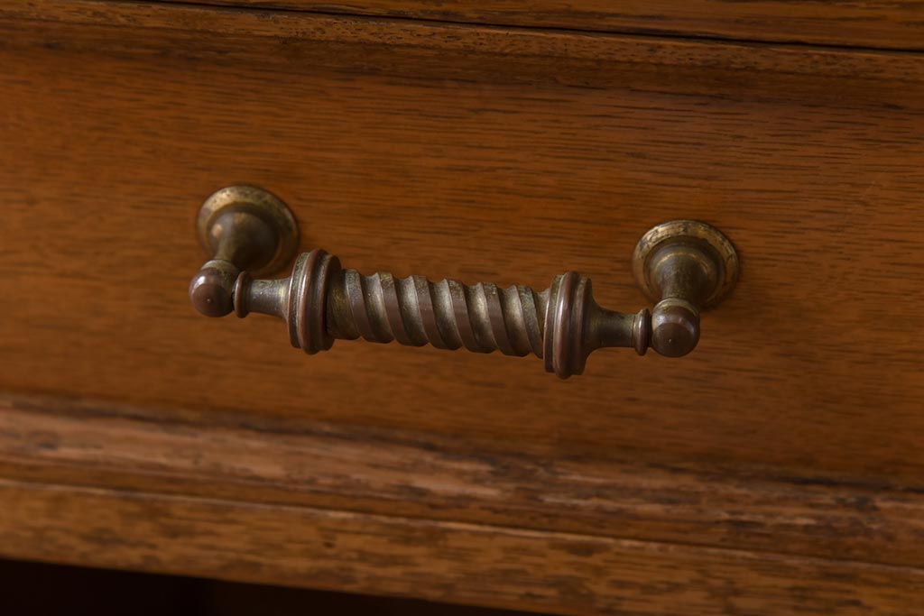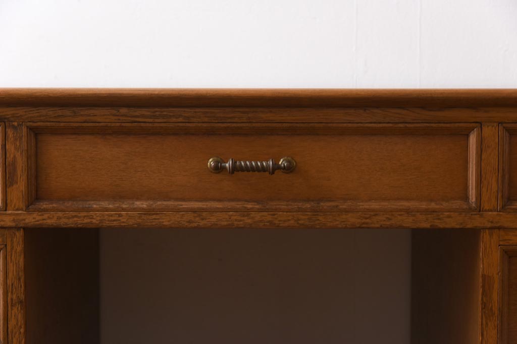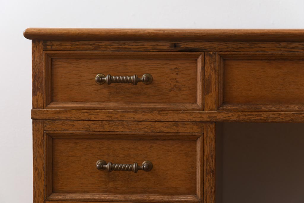 デスク> 片袖机・両袖机 > ビンテージ 神戸洋家具 組み立て式 凝った取っ手がシックな印象を与えるナラ材のワークデスク(両袖机、在宅ワーク、在宅用)