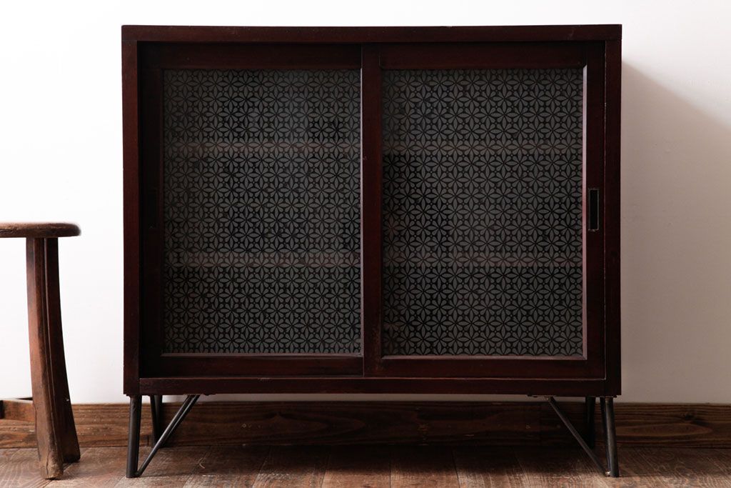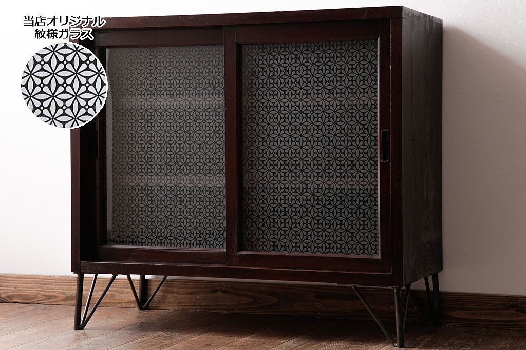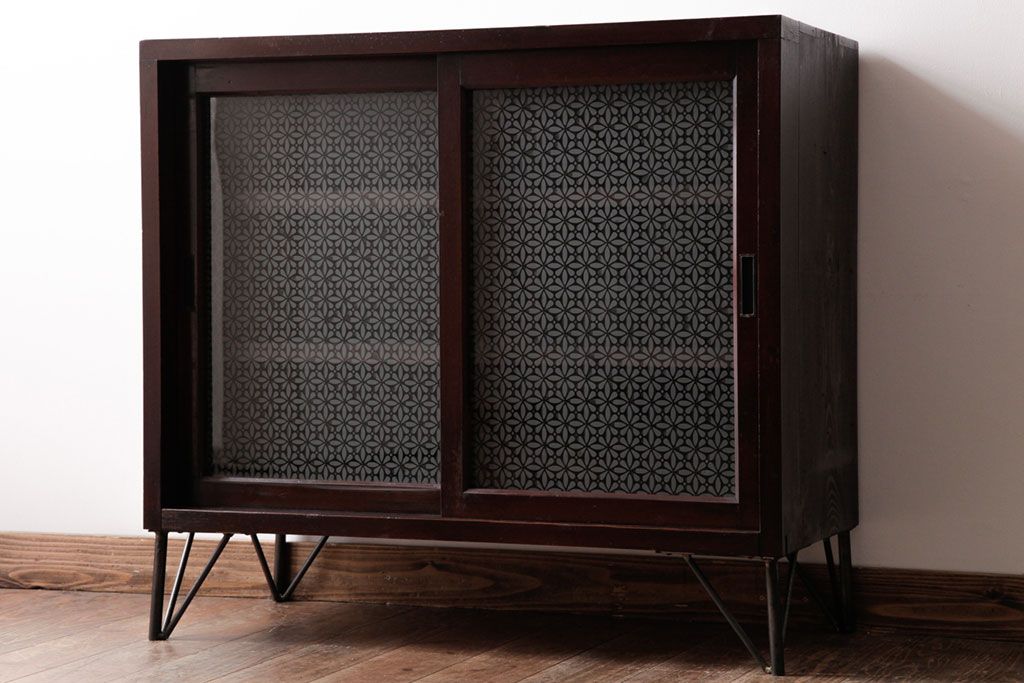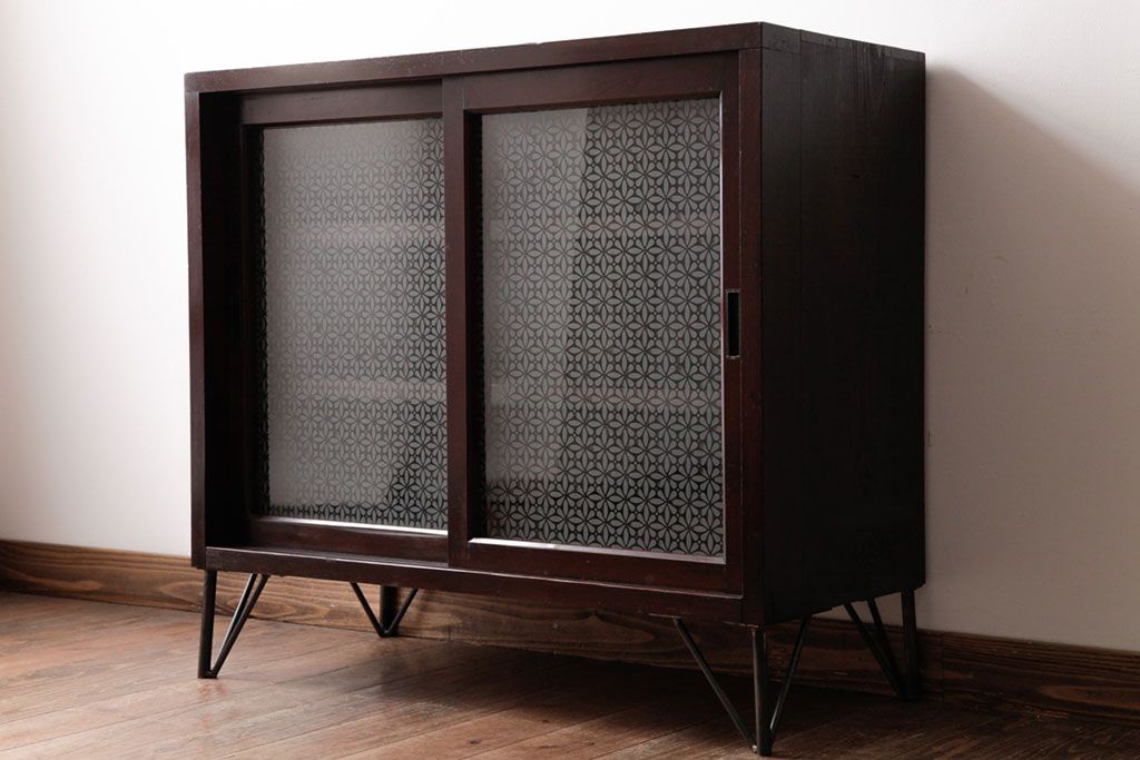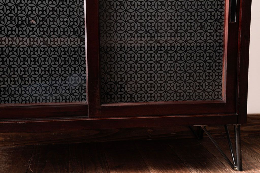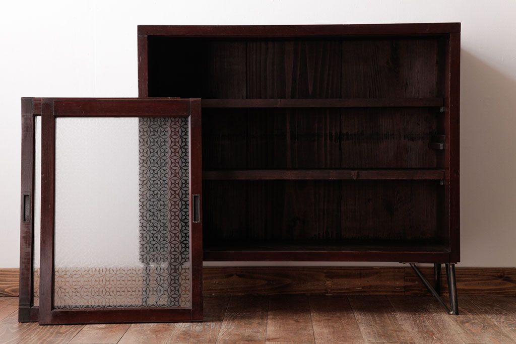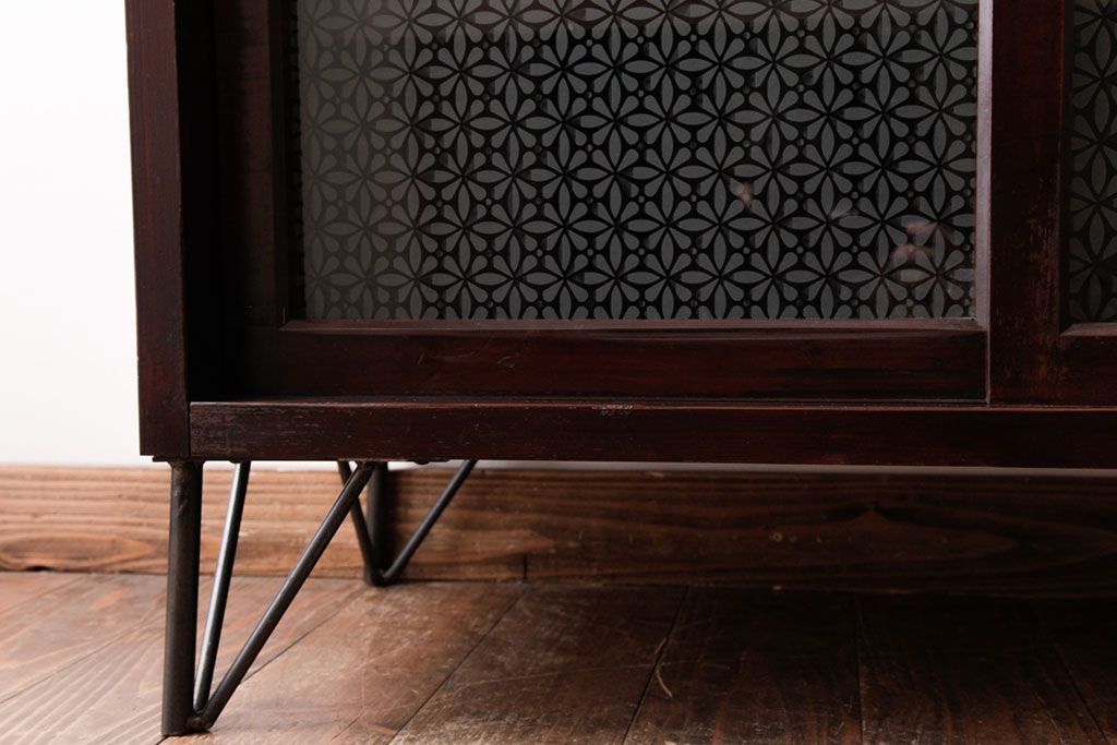 リメイク家具 オリジナル花ガラス入り 鉄脚付きがおしゃれな小振りな戸棚(収納棚、食器棚)