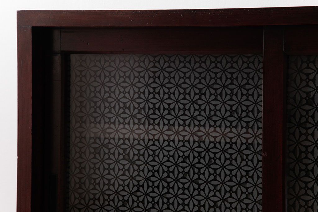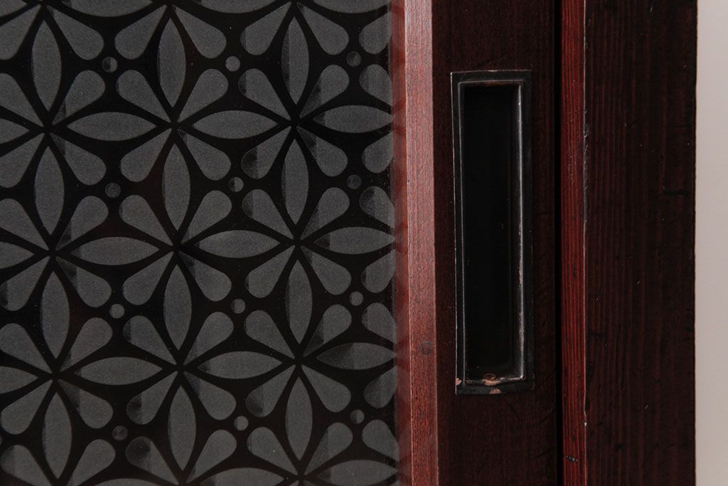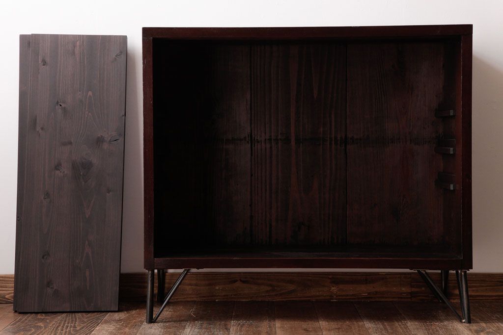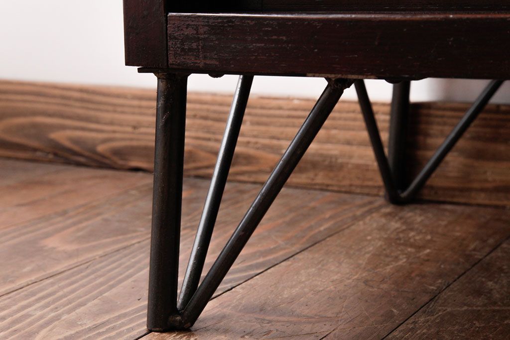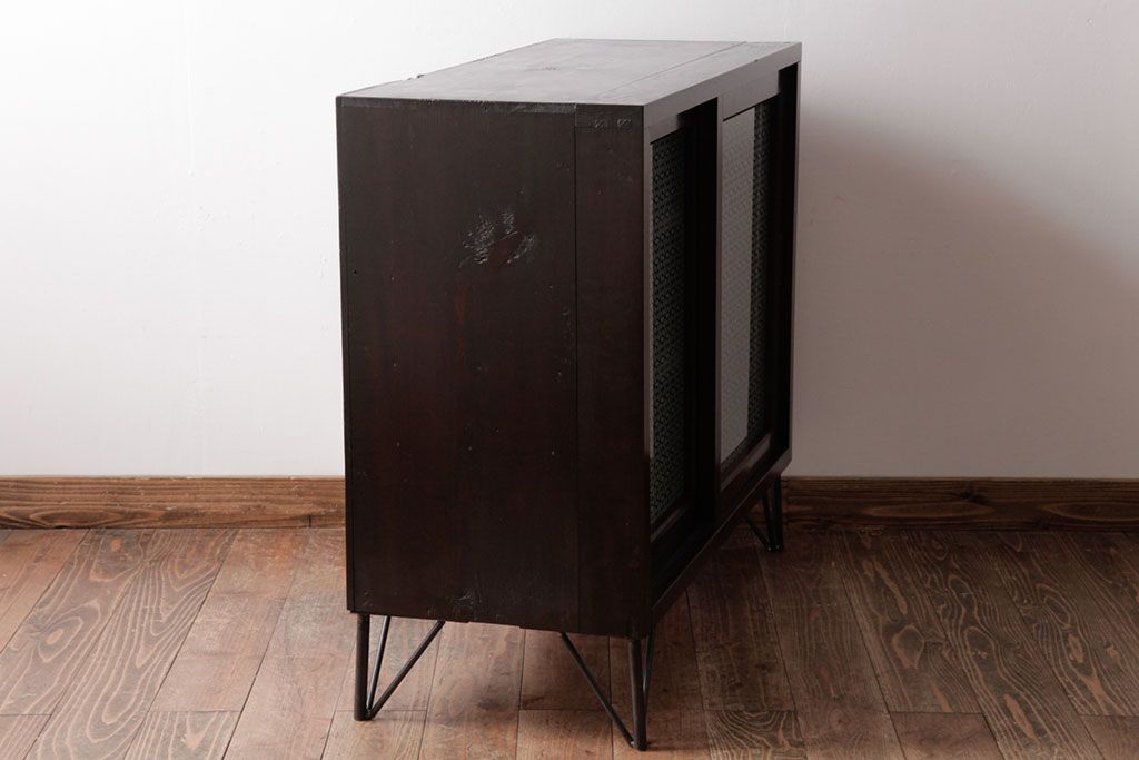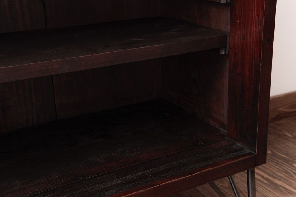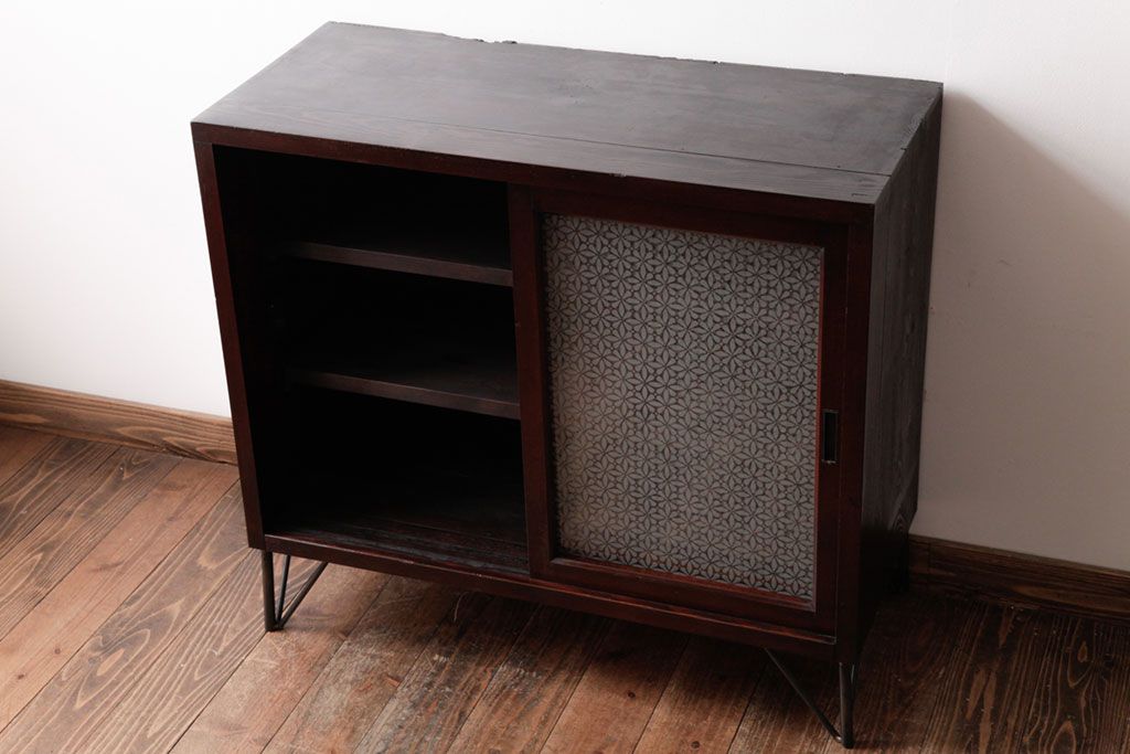 リメイク家具 オリジナル花ガラス入り 鉄脚付きがおしゃれな小振りな戸棚(収納棚、食器棚)