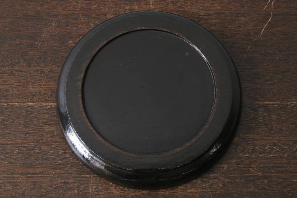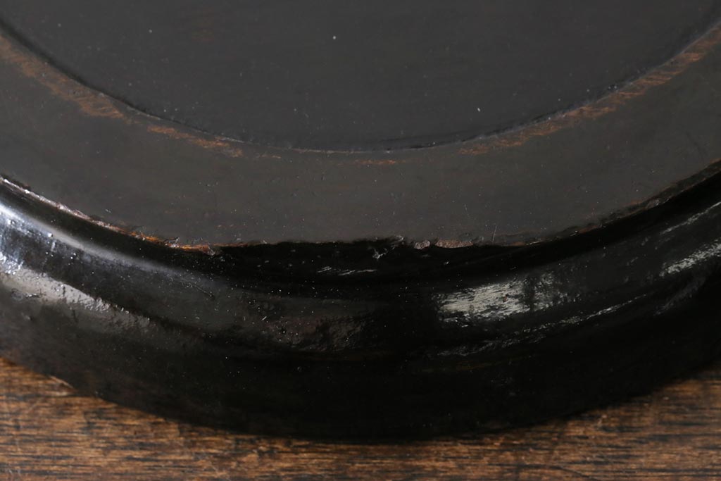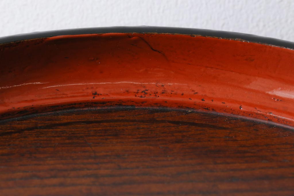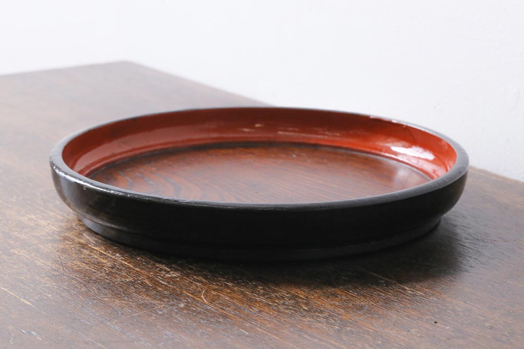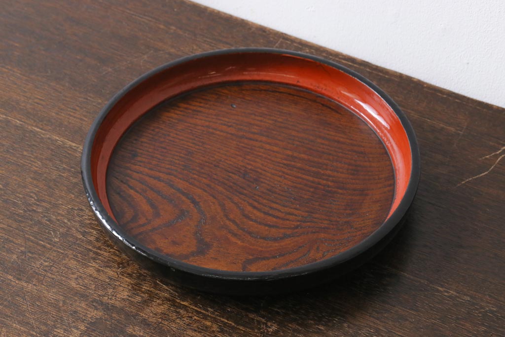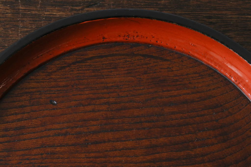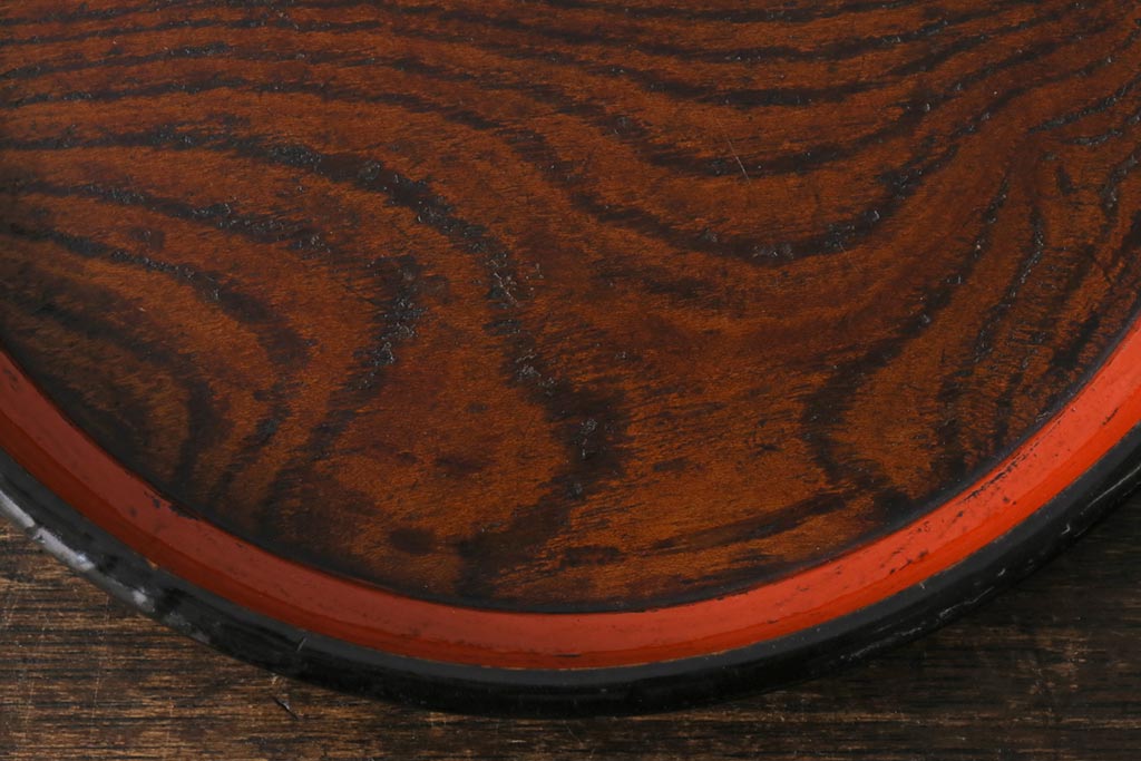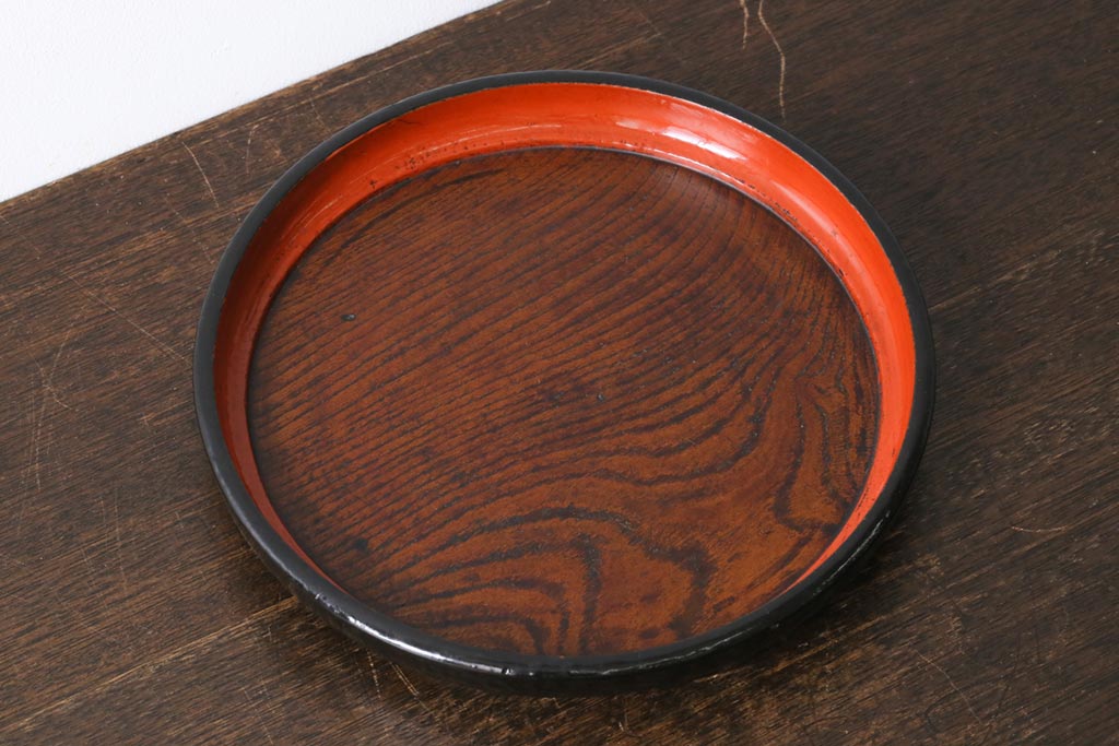 アンティーク雑貨 漆塗り ケヤキ一枚板 杢目の美しさを引き立てる朱塗りが鮮やかな丸盆(漆器、トレー)