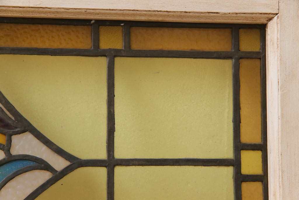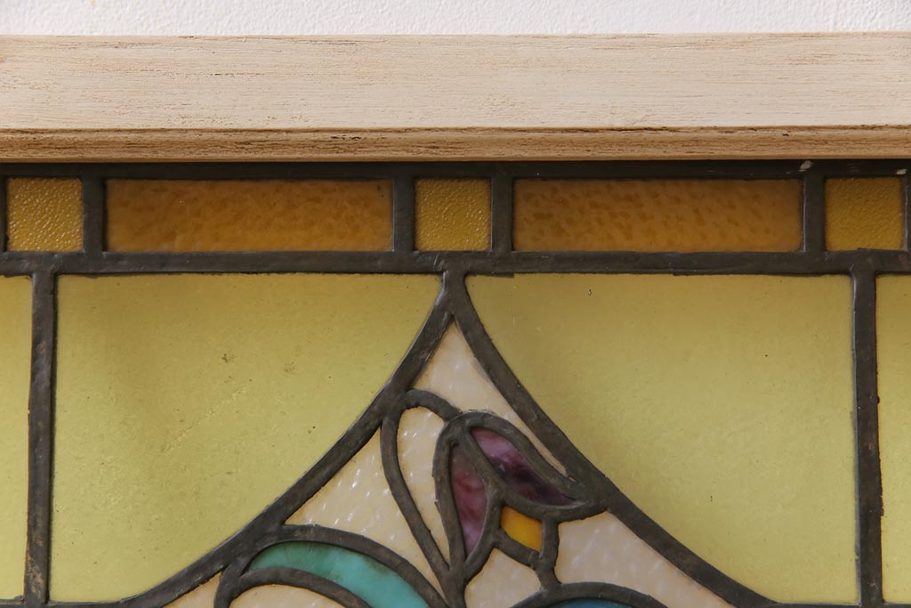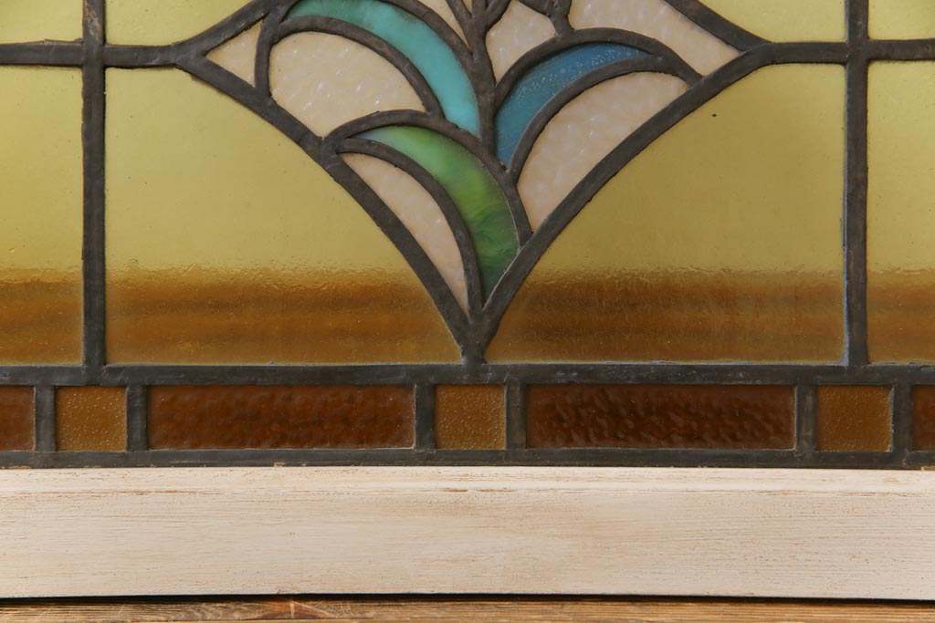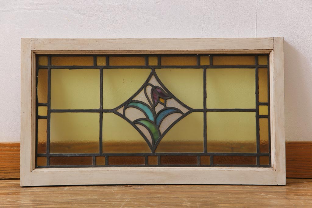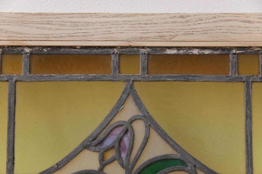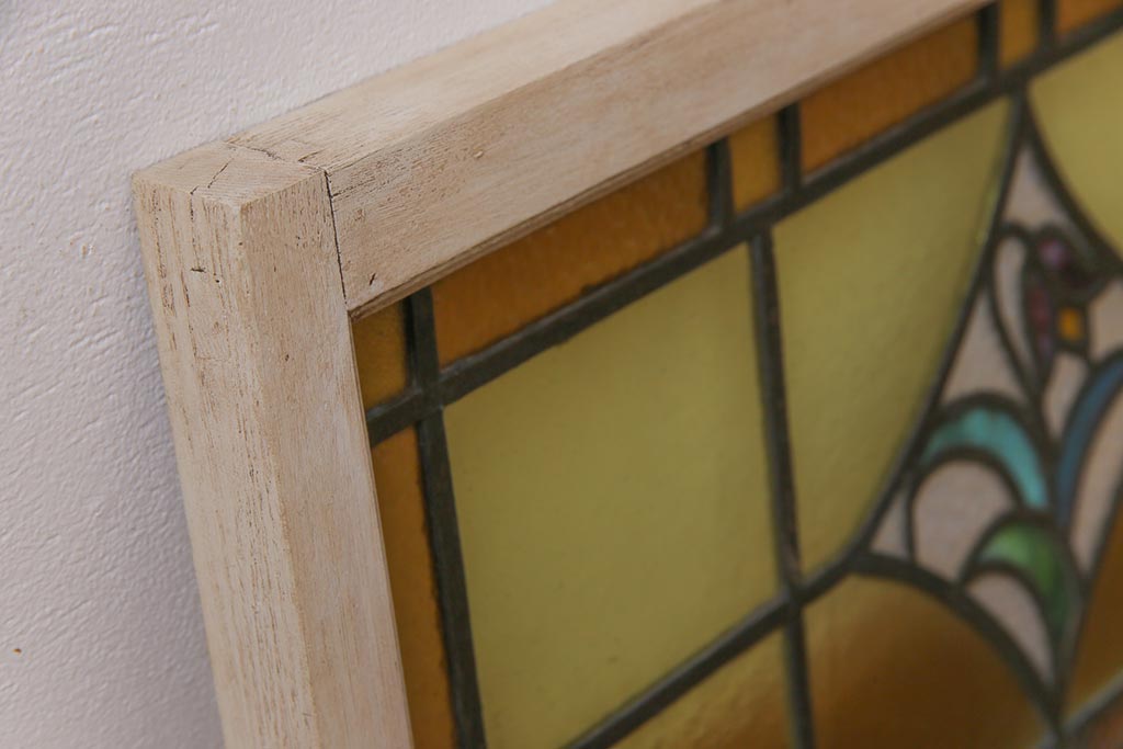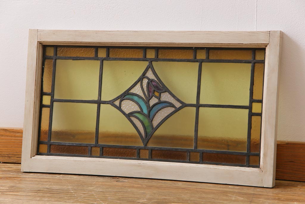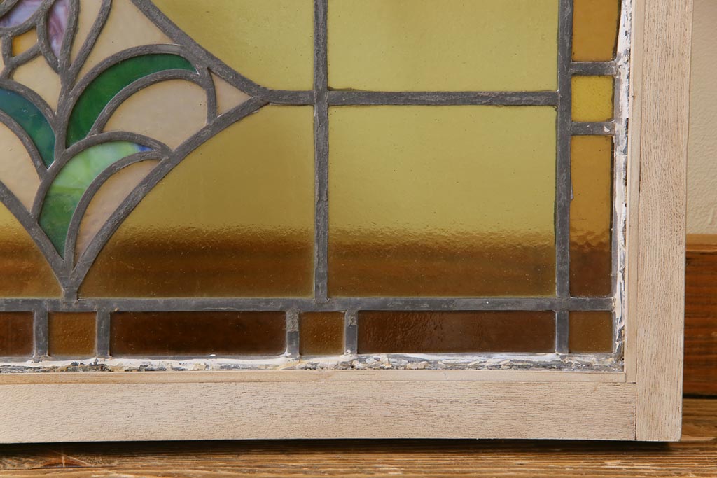アンティーク雑貨 和製アンティーク 花のアクセントがかわいらしいステンドグラス(フィックス窓、明り取り、はめ殺し)(1)
