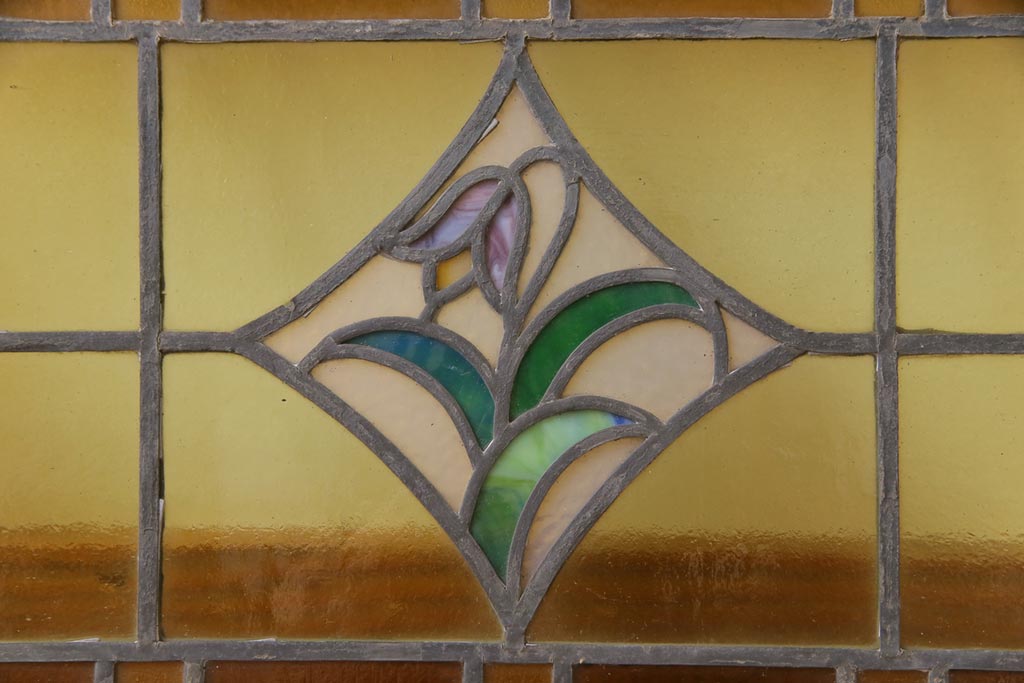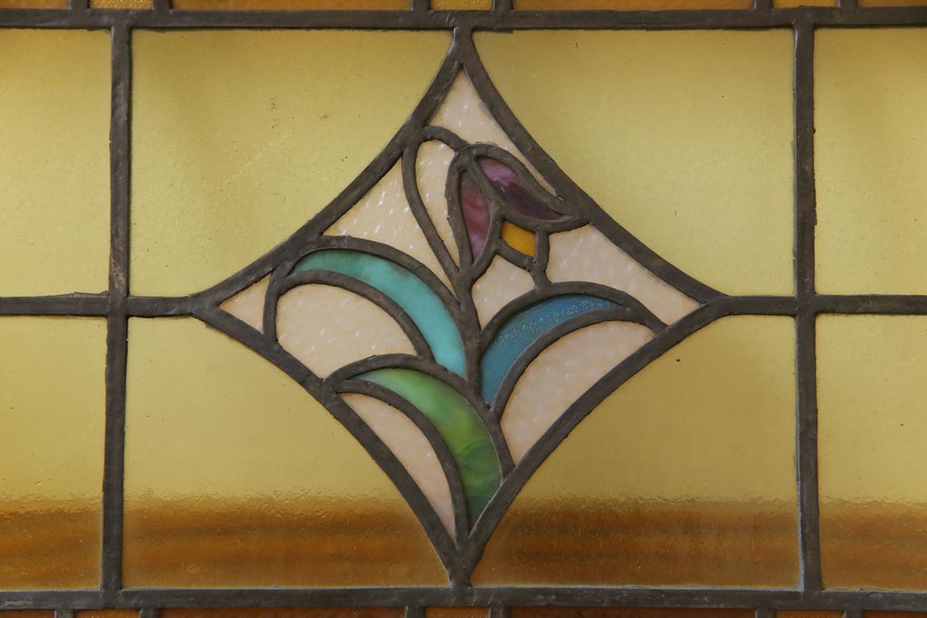 ラフジュ工房> ステンドグラス > アンティーク雑貨 和製アンティーク 花のアクセントがかわいらしいステンドグラス(フィックス窓、明り取り、はめ殺し)(1)