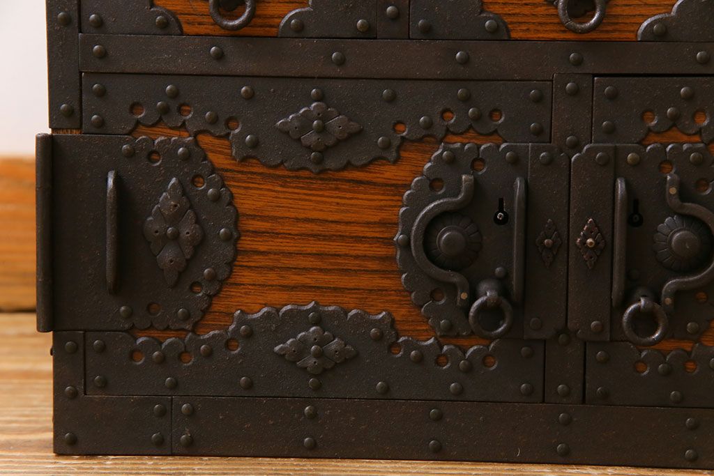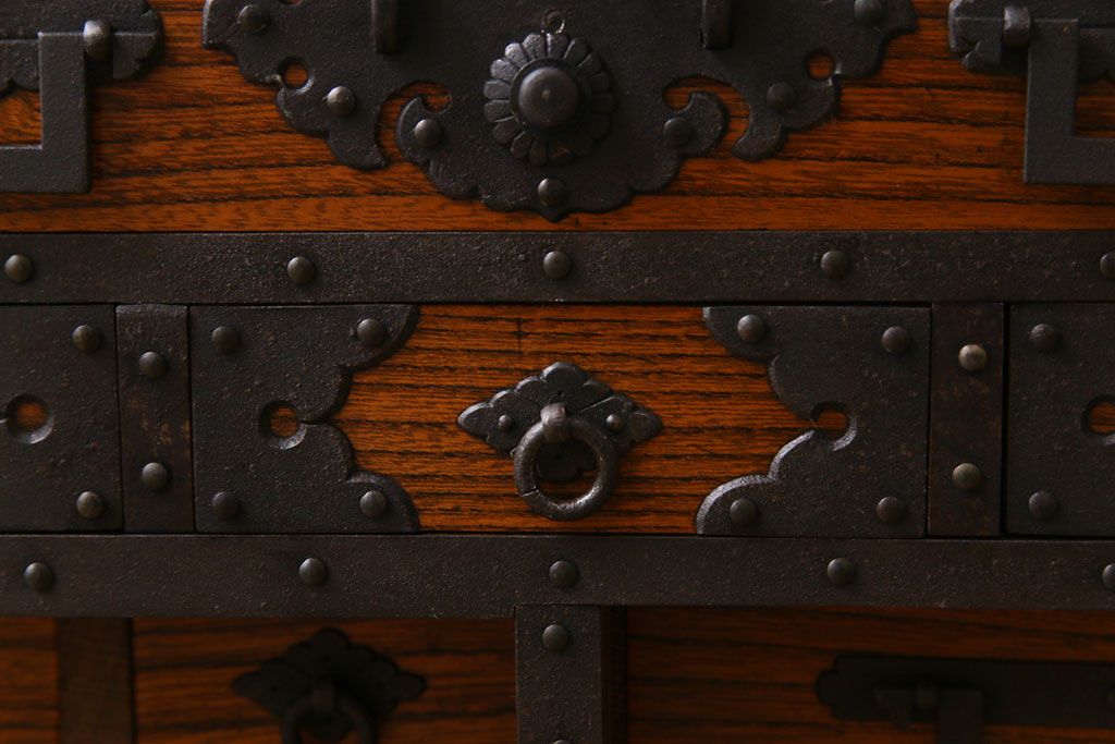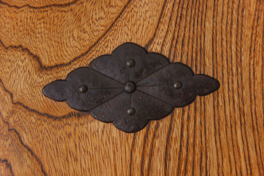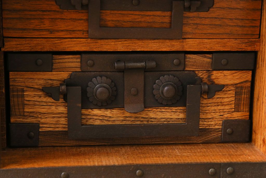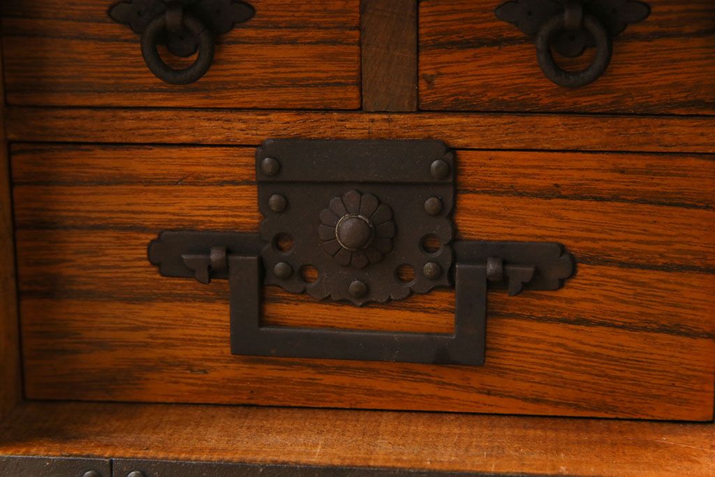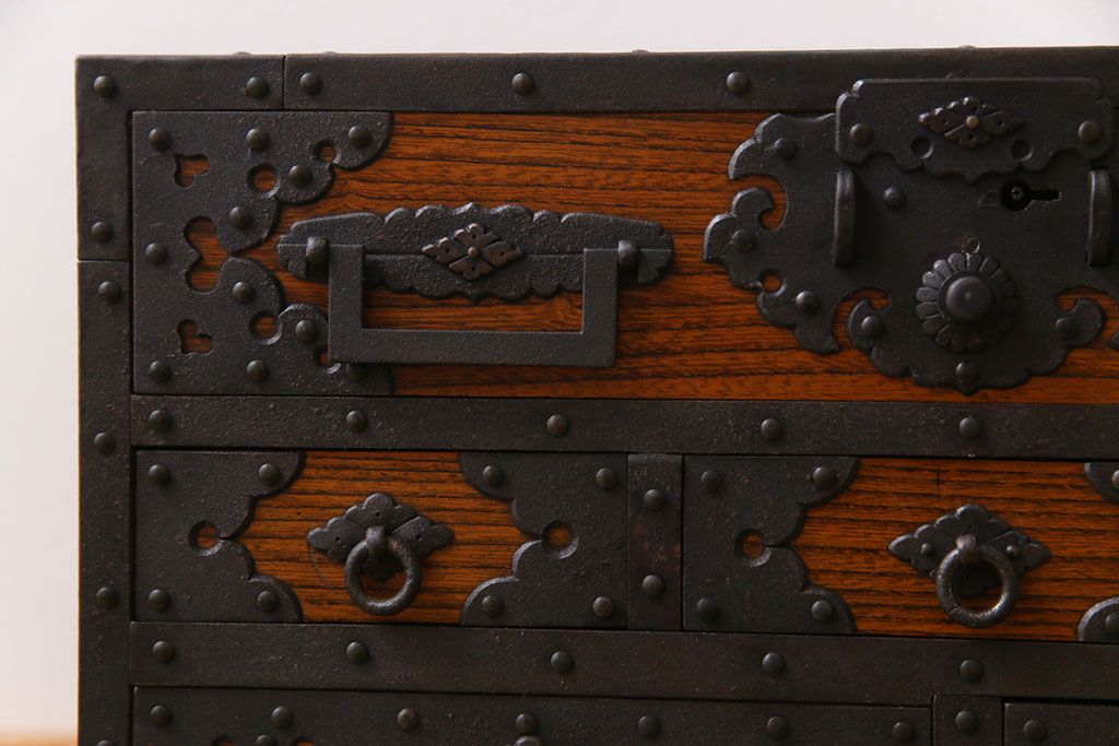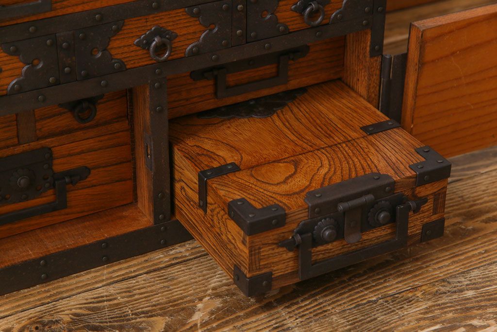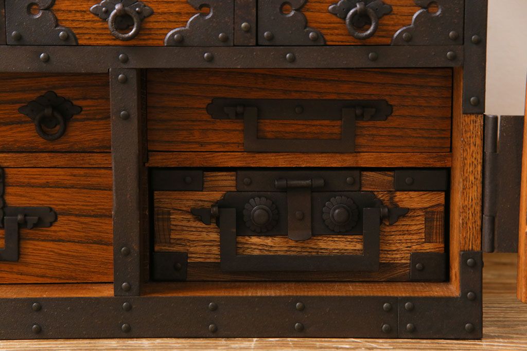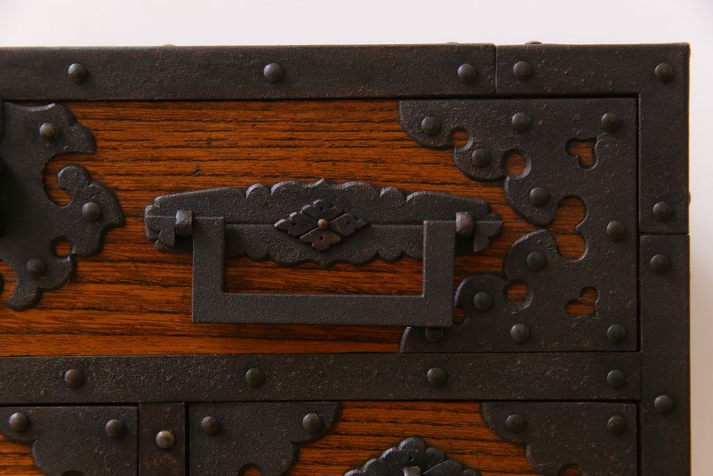ラフジュ工房> 和箪笥 > 中古 工芸品 ケヤキ材 上手物 手打ち金具が趣深い船箪笥(帳箱、小箪笥)