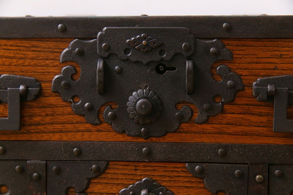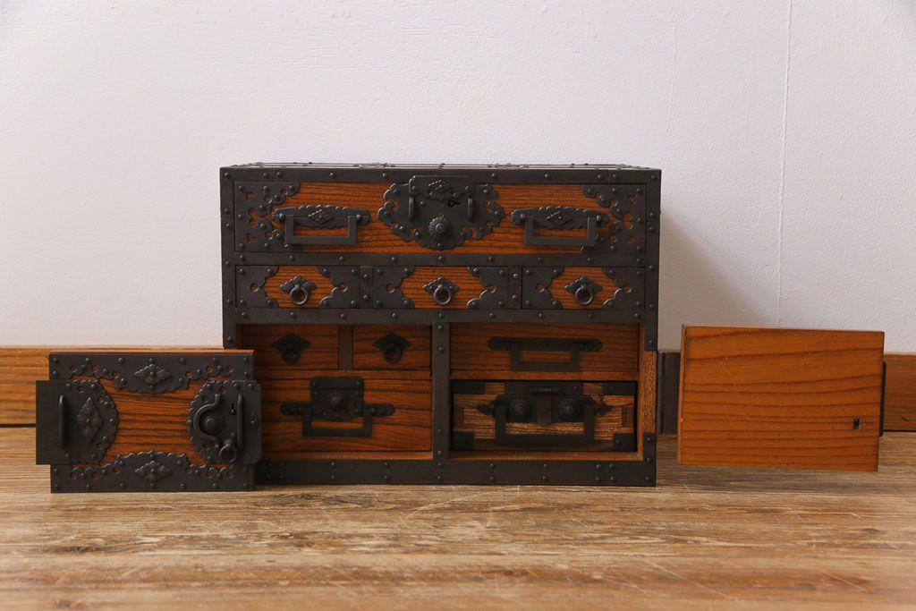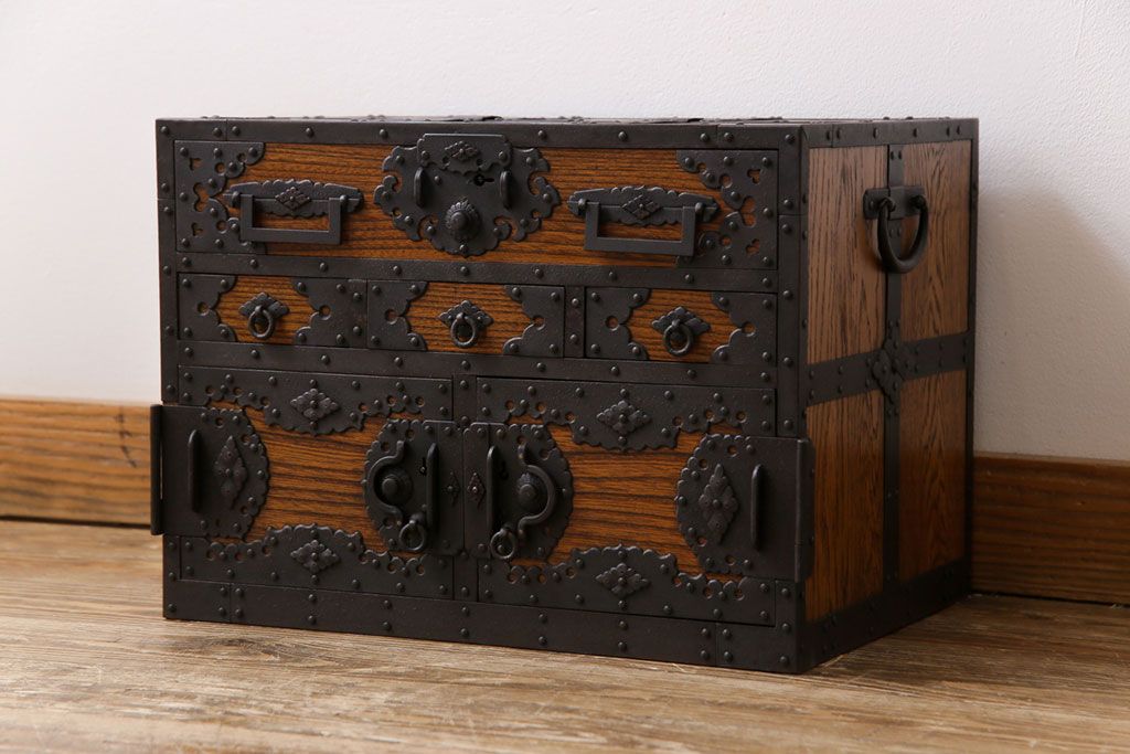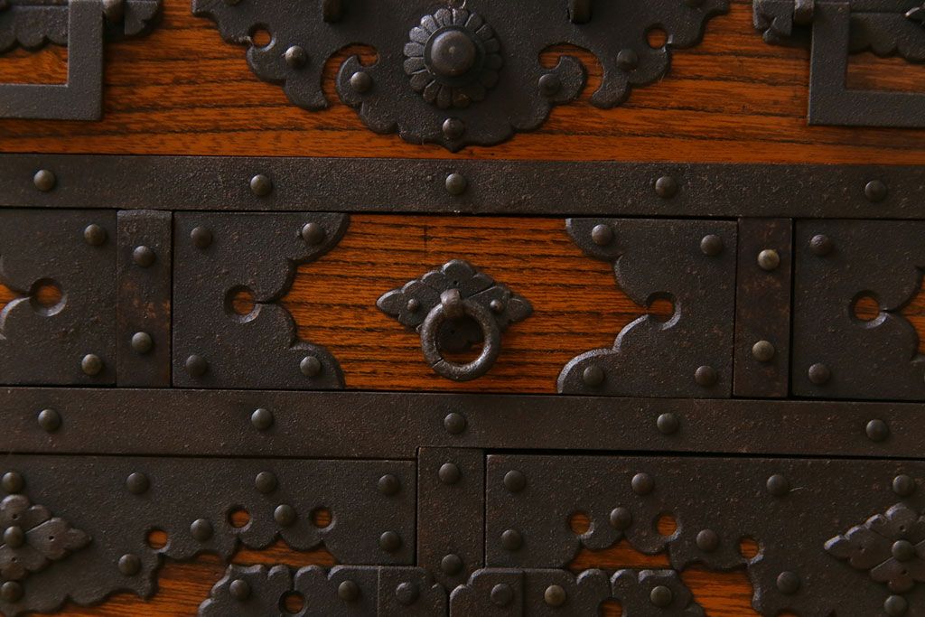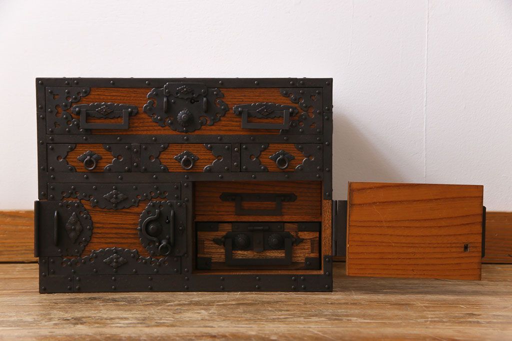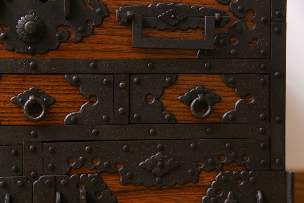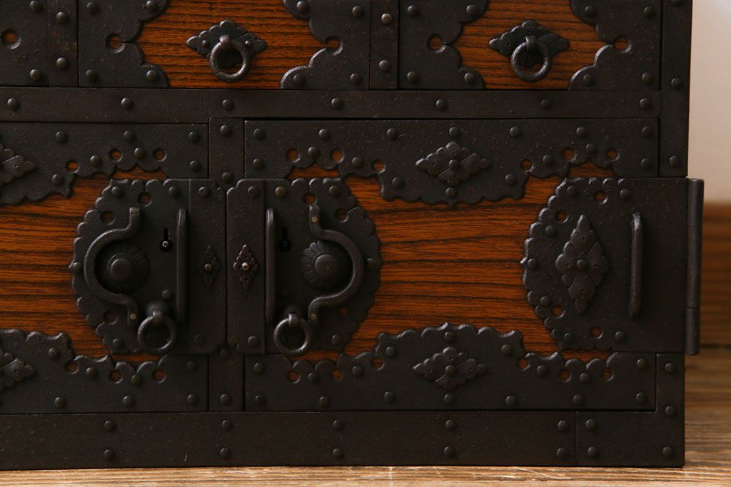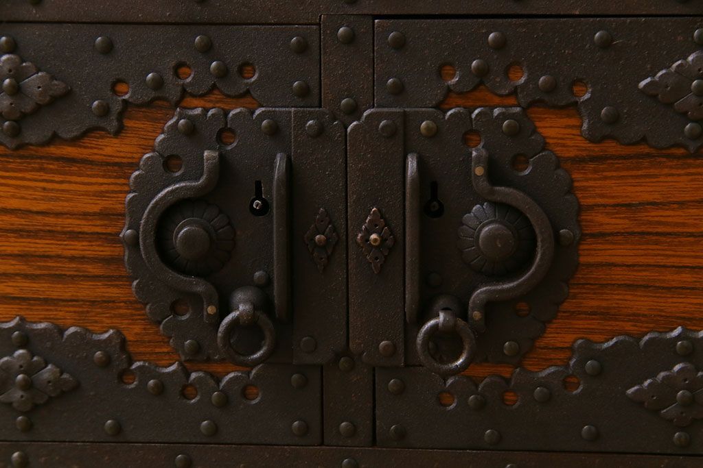 ラフジュ工房> 和箪笥 > 中古 工芸品 ケヤキ材 上手物 手打ち金具が趣深い船箪笥(帳箱、小箪笥)