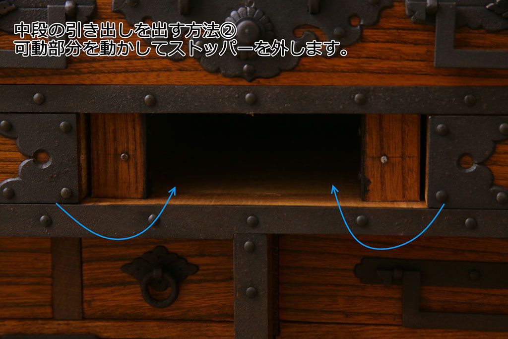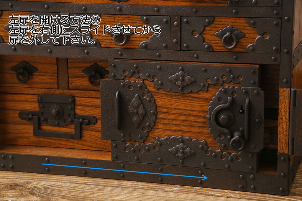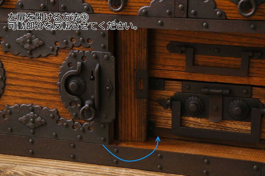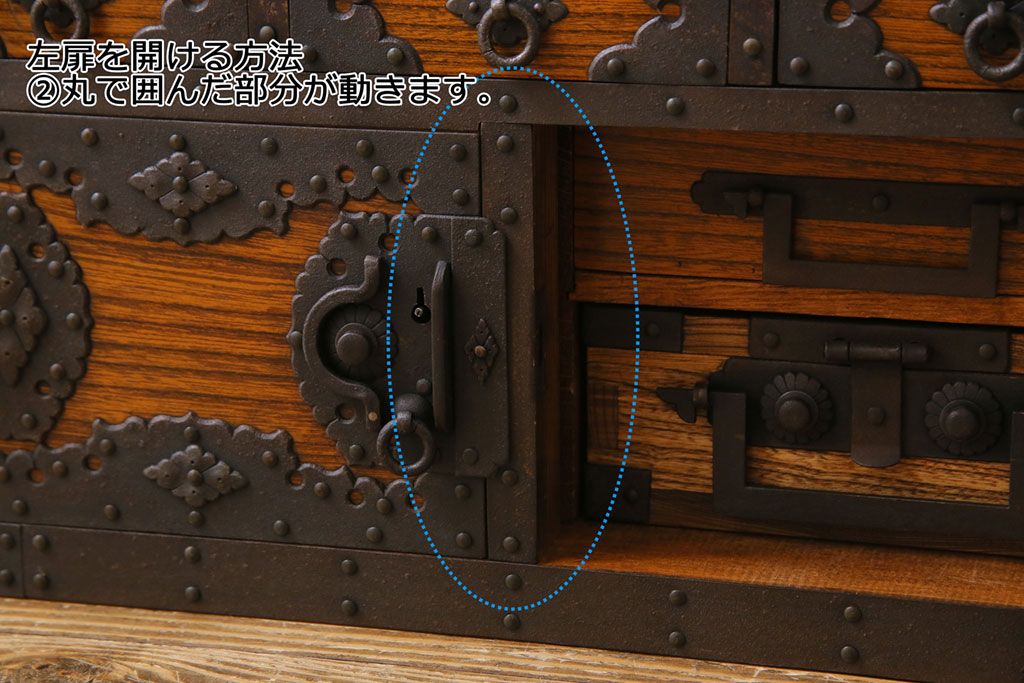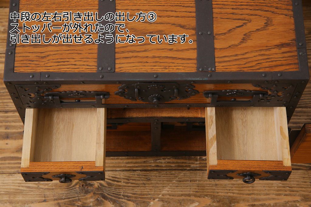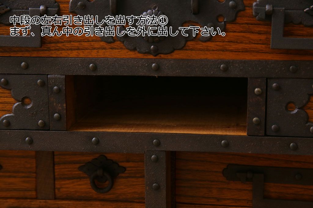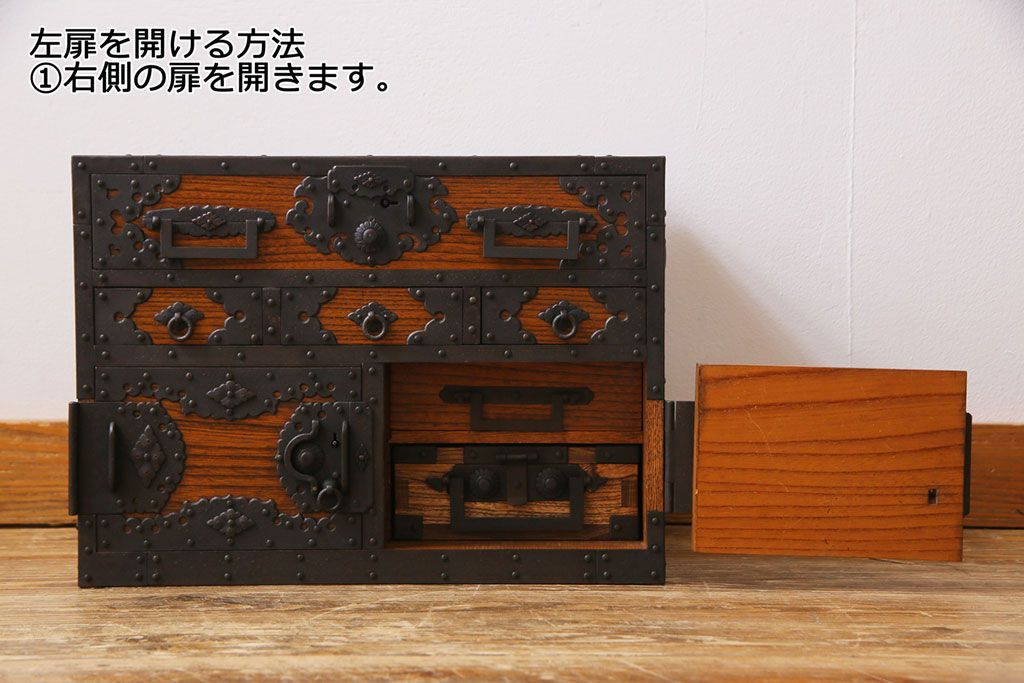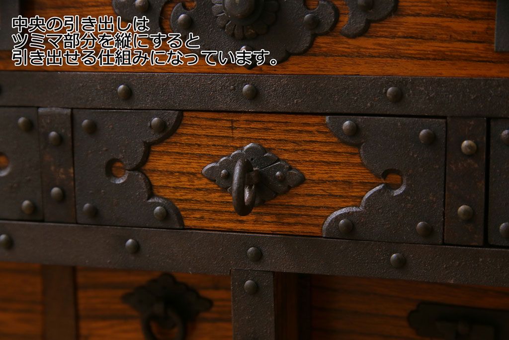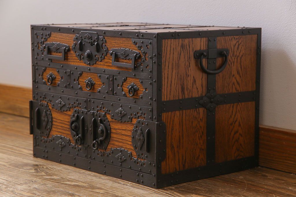 ラフジュ工房> 和箪笥 > 中古 工芸品 ケヤキ材 上手物 手打ち金具が趣深い船箪笥(帳箱、小箪笥)