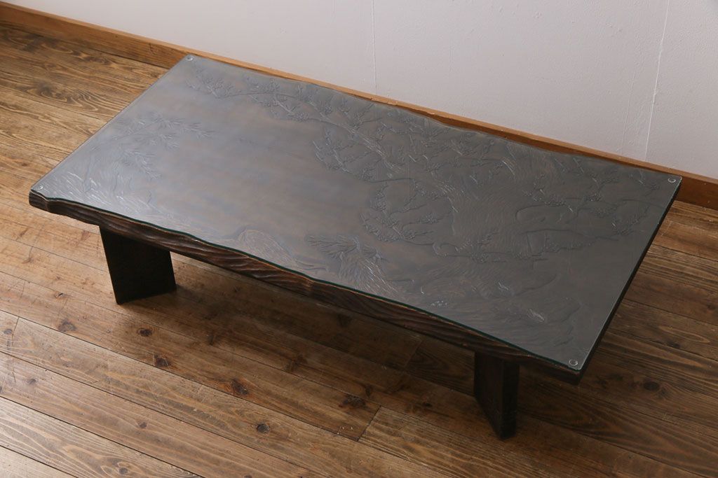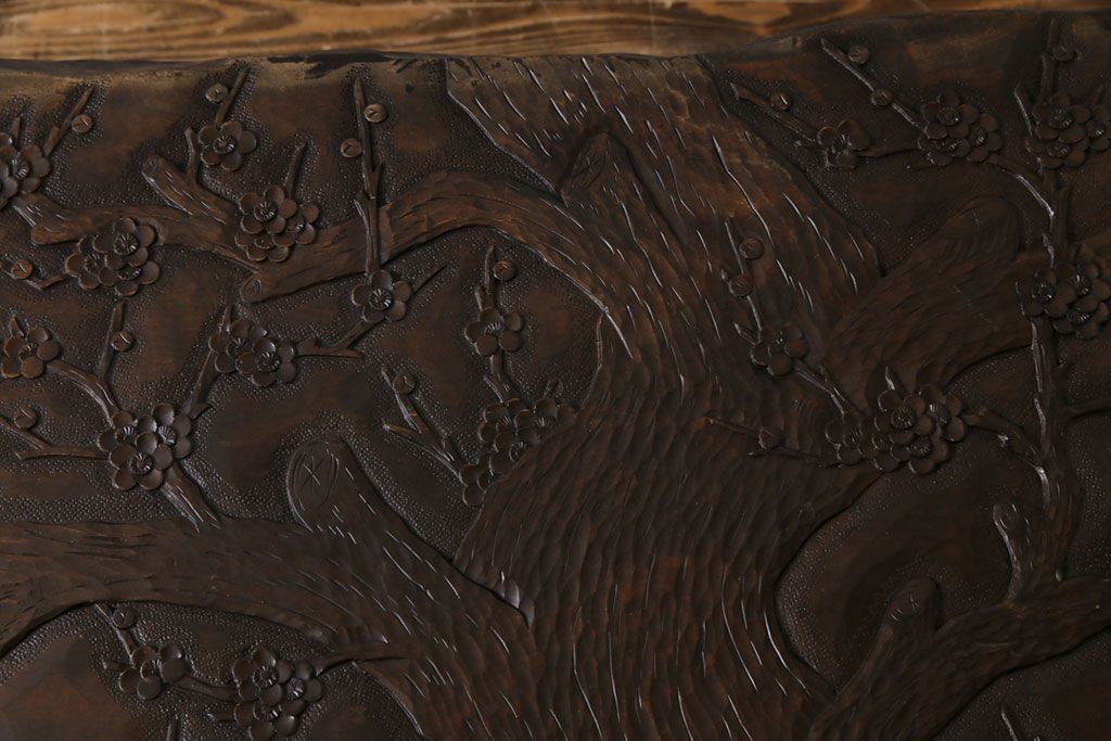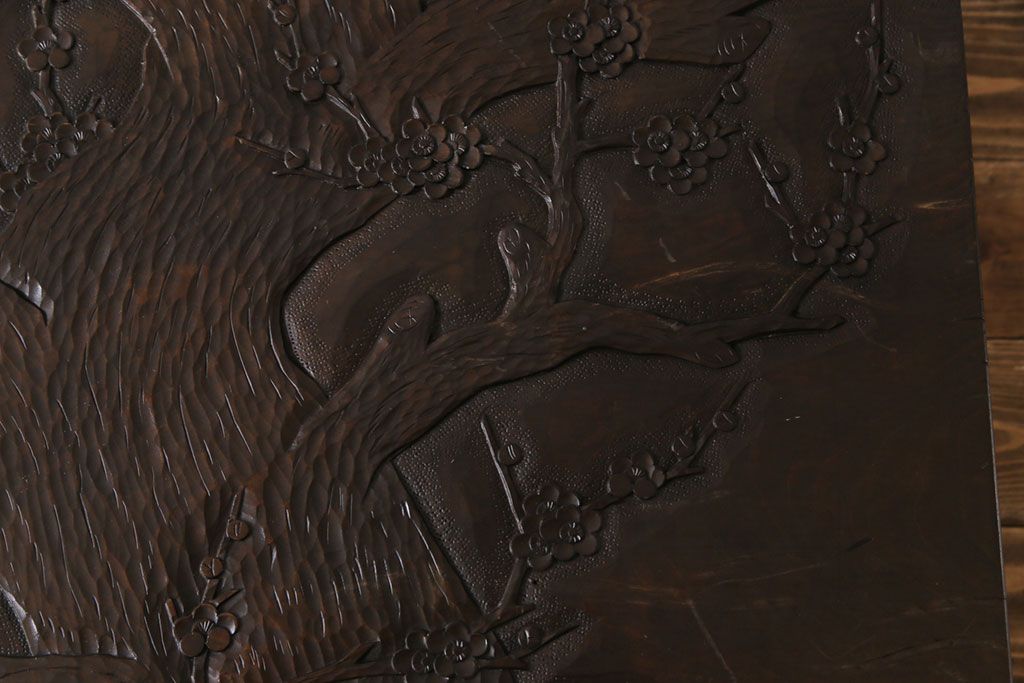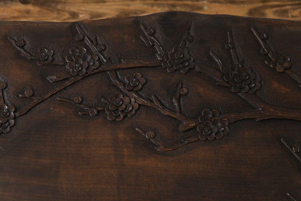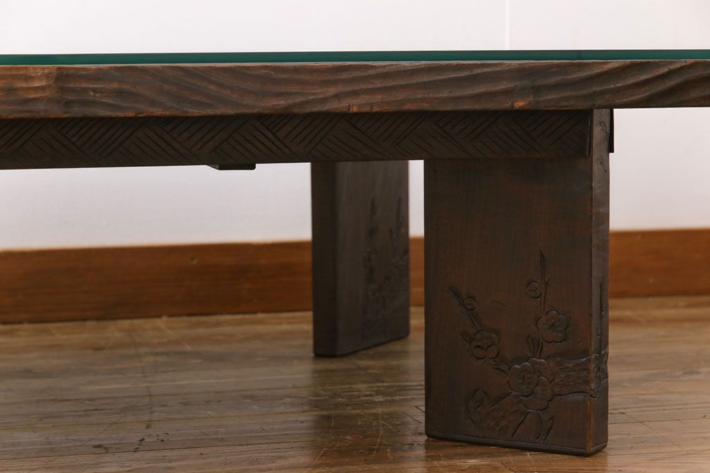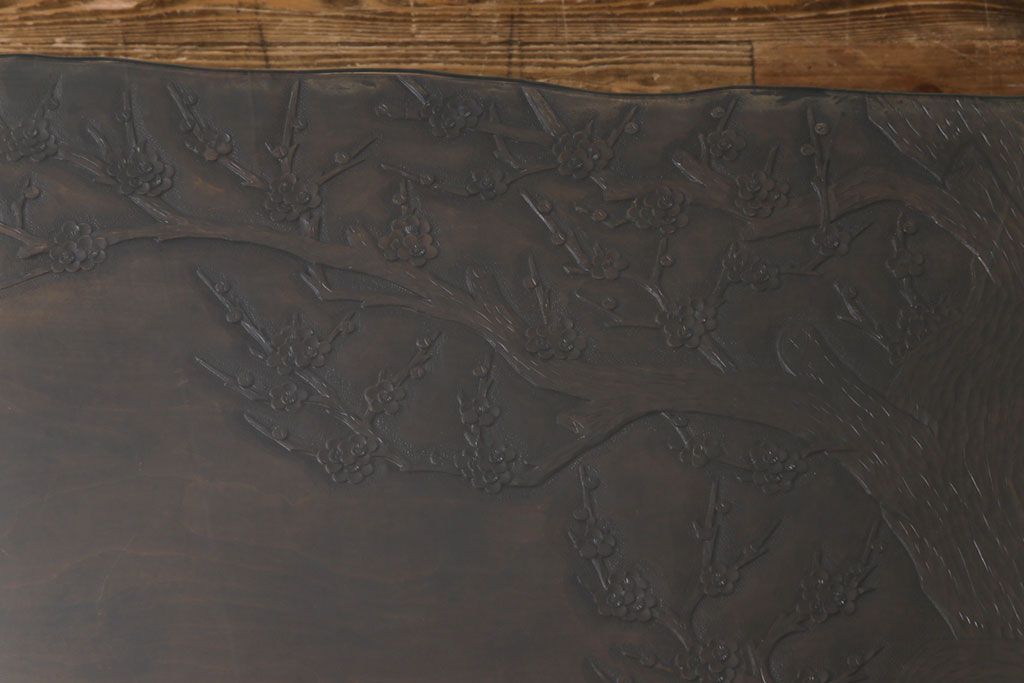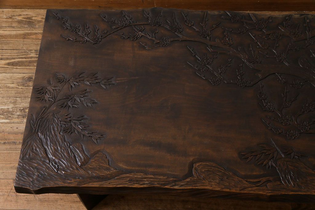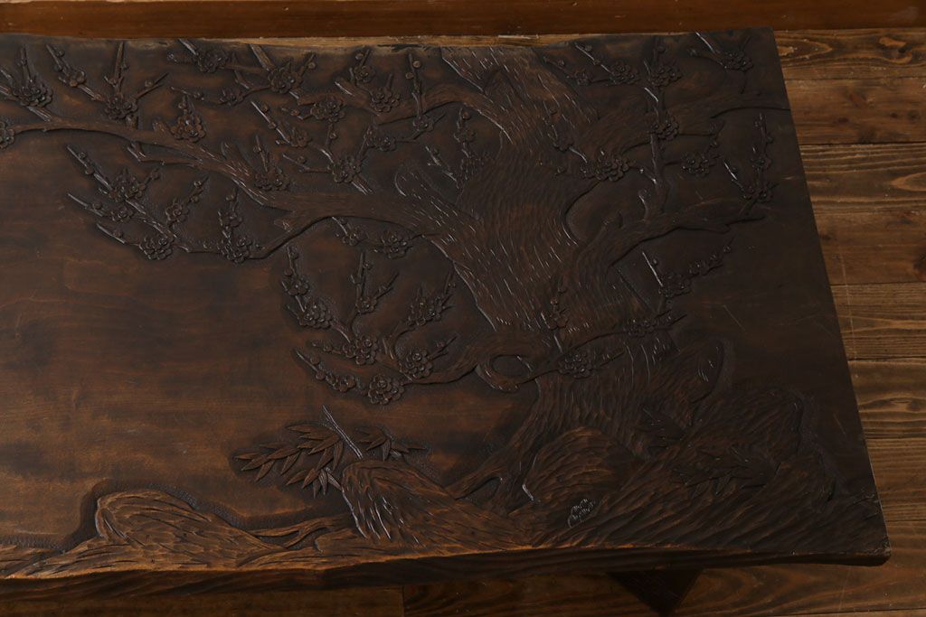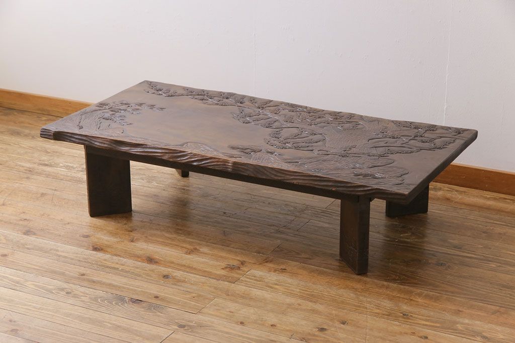 ラフジュ工房> 民芸家具 > 中古 伝統工芸軽井沢彫り 特注品 天板栃の木一枚板 梅の大木が目を引く座卓(ローテーブル)(定価約88万円)(R-032057)