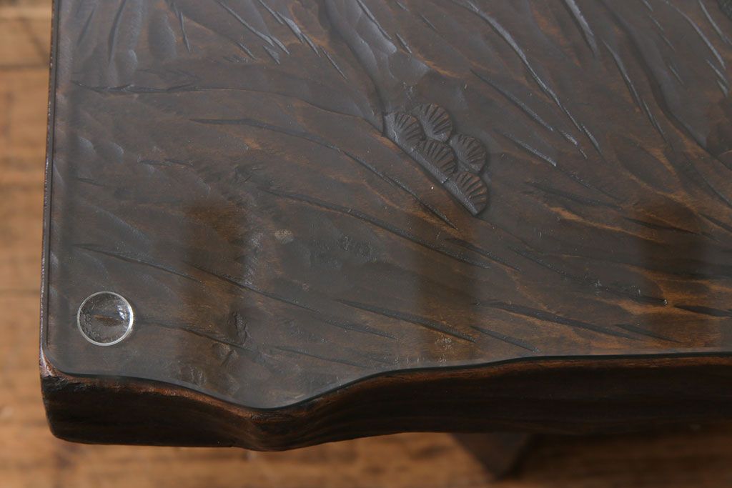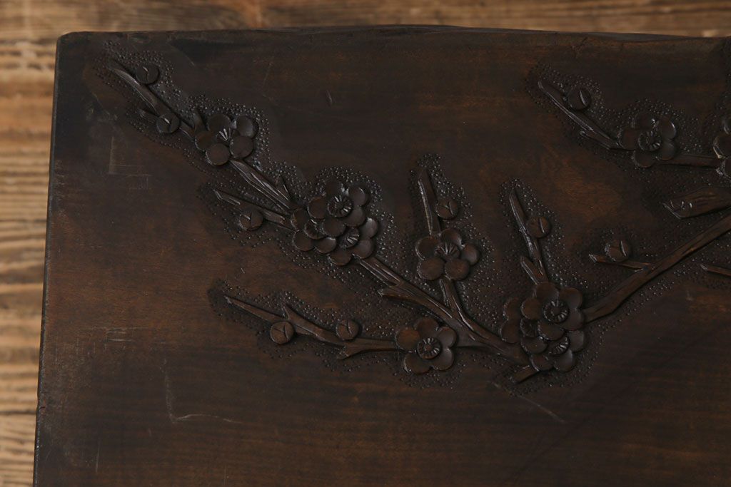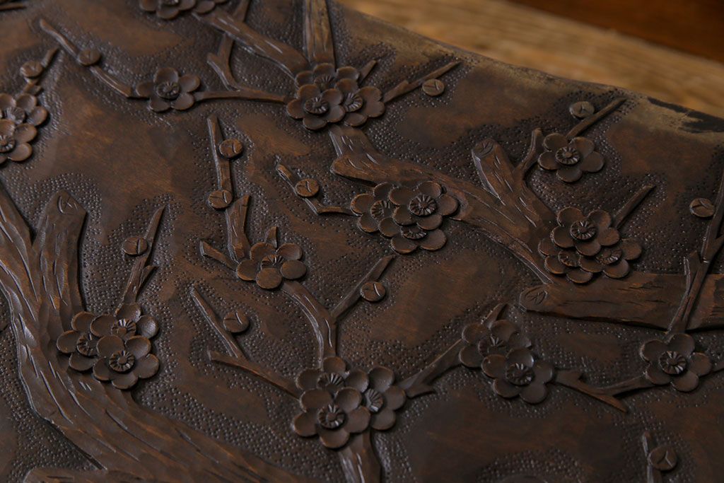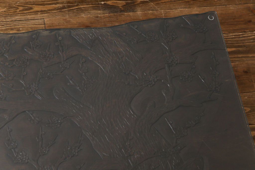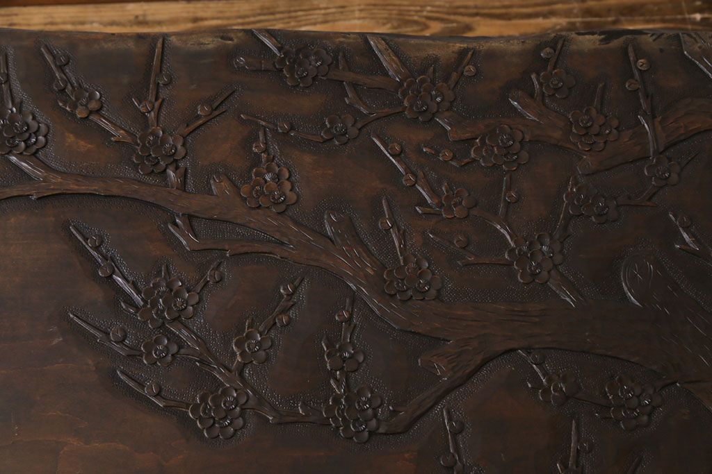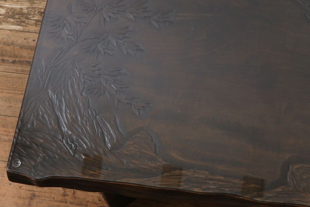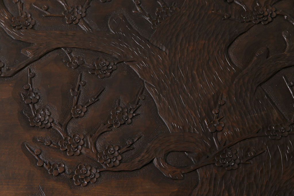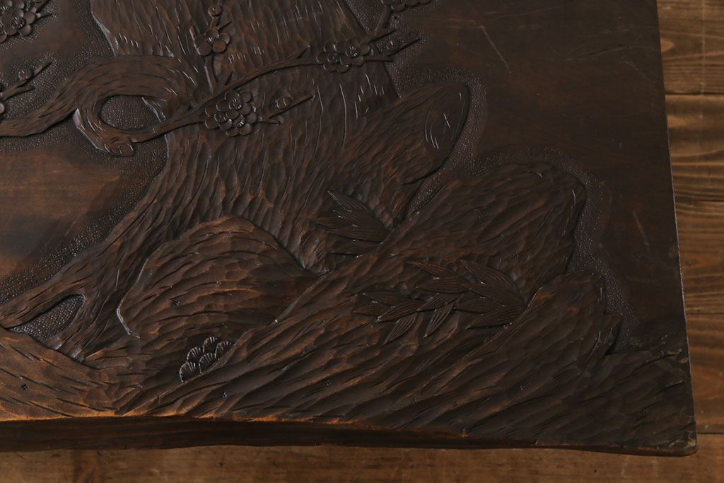 ラフジュ工房> 民芸家具 > 中古 伝統工芸軽井沢彫り 特注品 天板栃の木一枚板 梅の大木が目を引く座卓(ローテーブル)(定価約88万円)(R-032057)