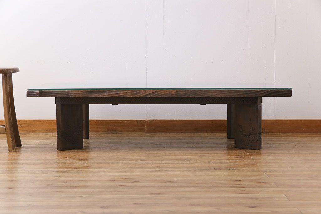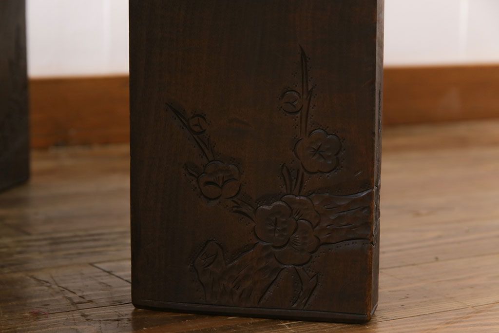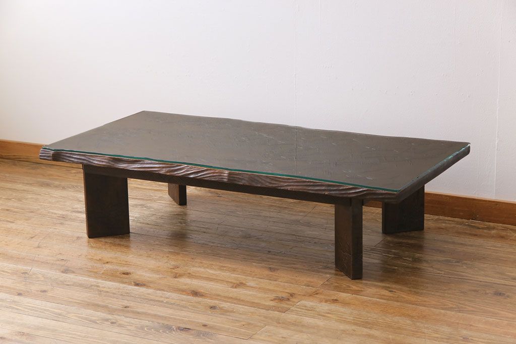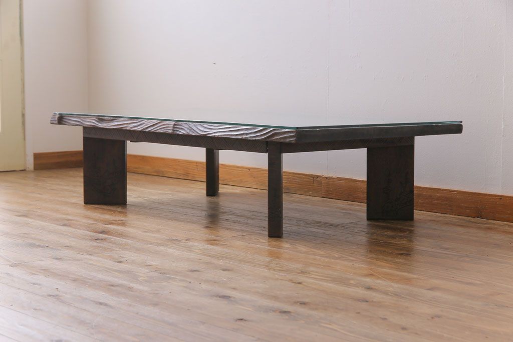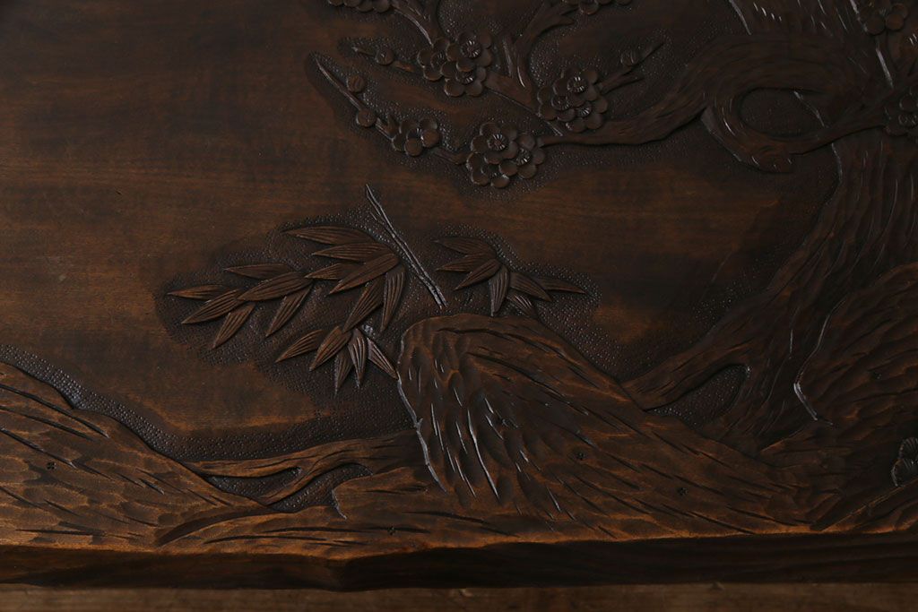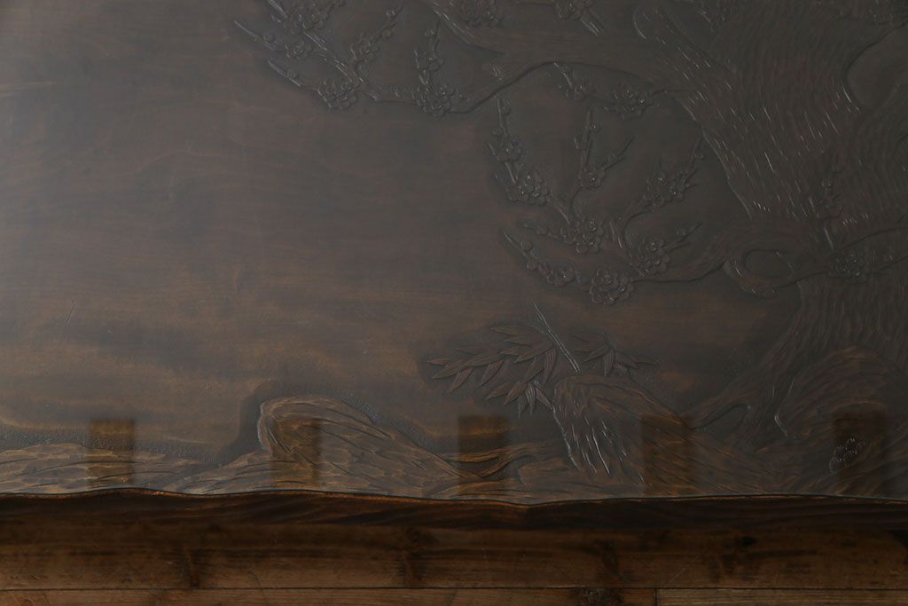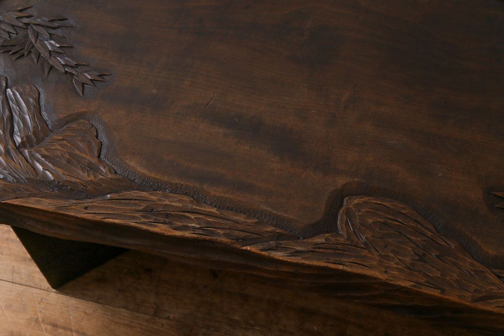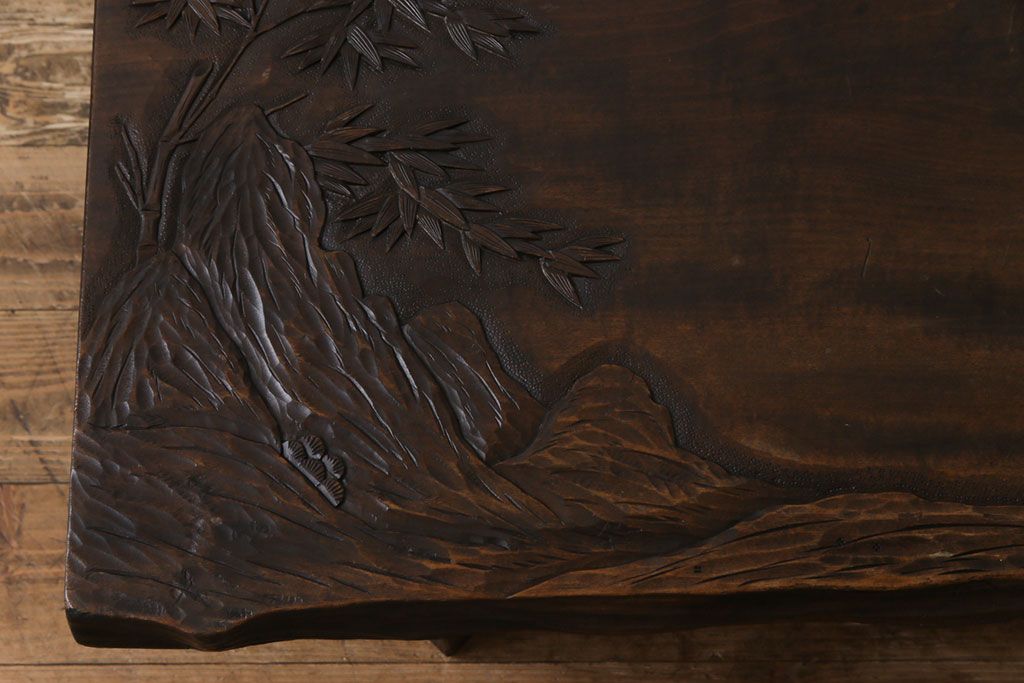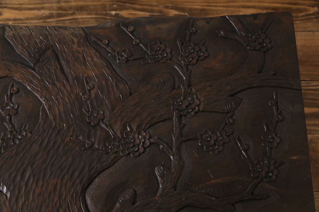 ラフジュ工房> 民芸家具 > 中古 伝統工芸軽井沢彫り 特注品 天板栃の木一枚板 梅の大木が目を引く座卓(ローテーブル)(定価約88万円)(R-032057)