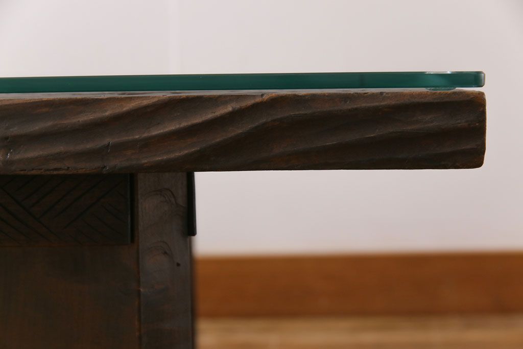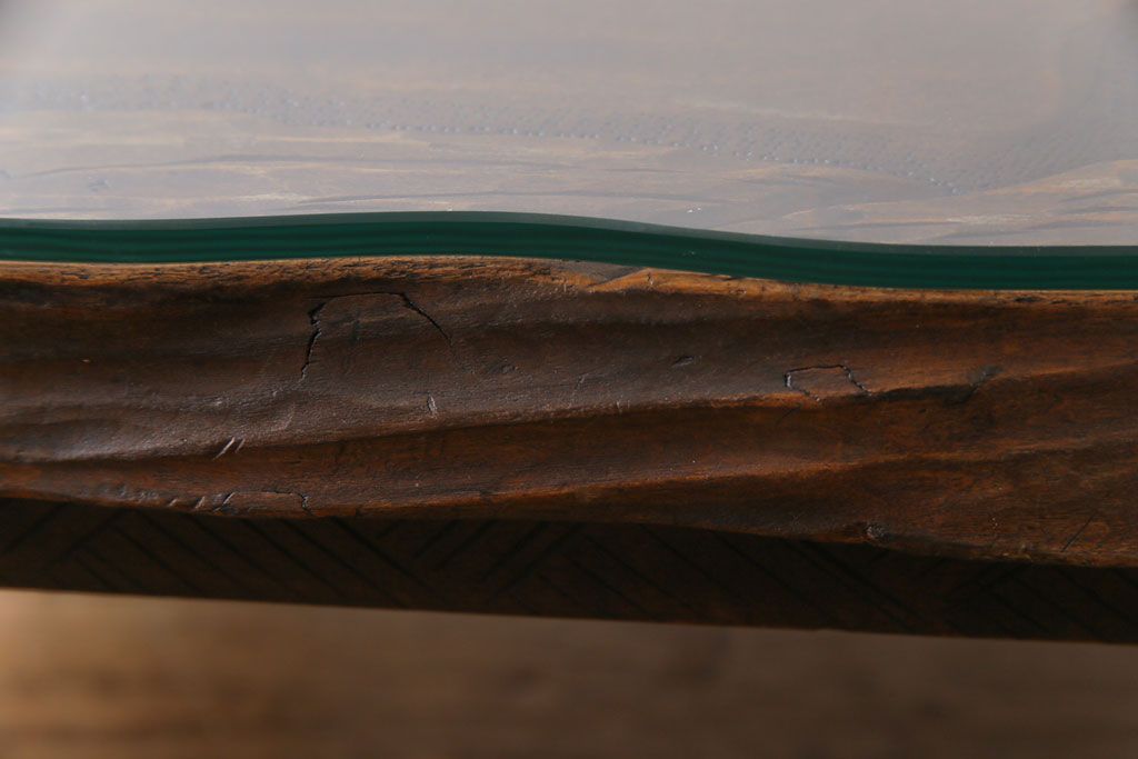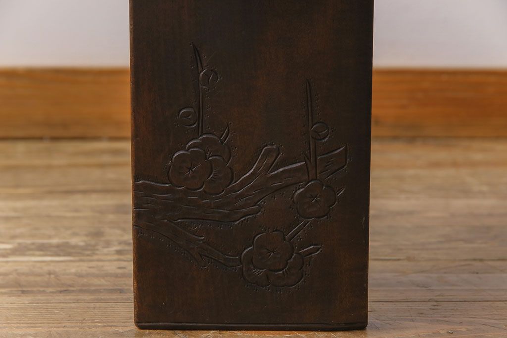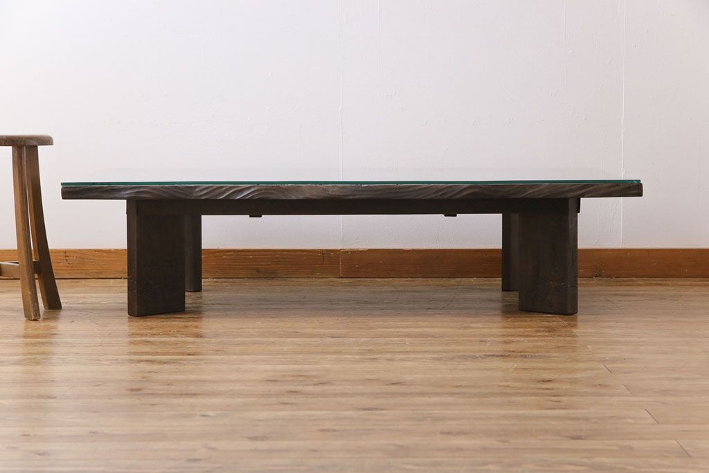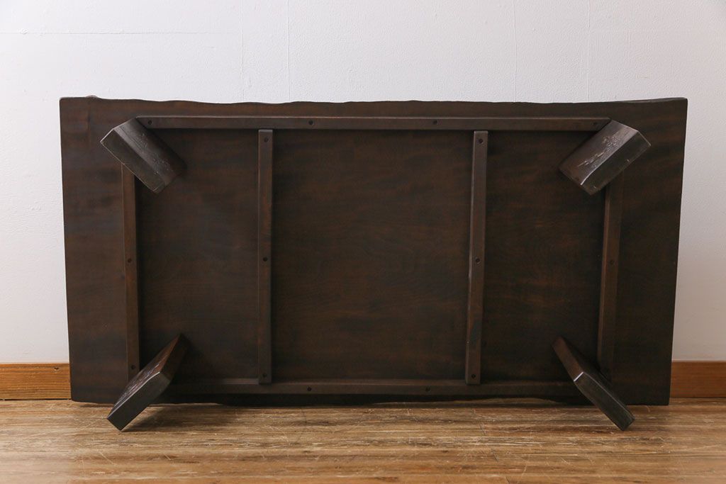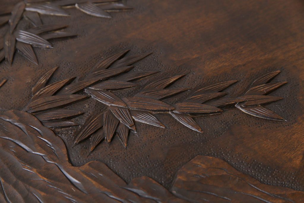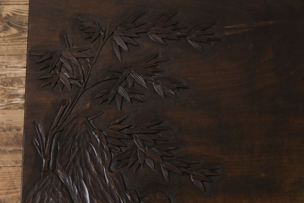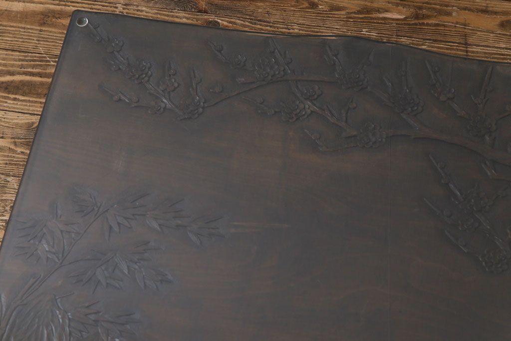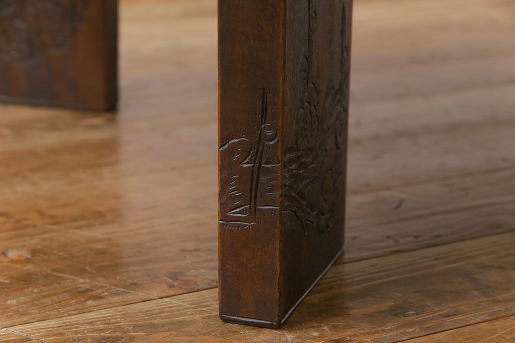 ラフジュ工房> 民芸家具 > 中古 伝統工芸軽井沢彫り 特注品 天板栃の木一枚板 梅の大木が目を引く座卓(ローテーブル)(定価約88万円)(R-032057)