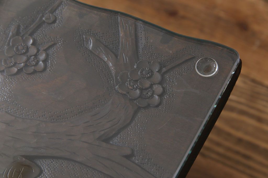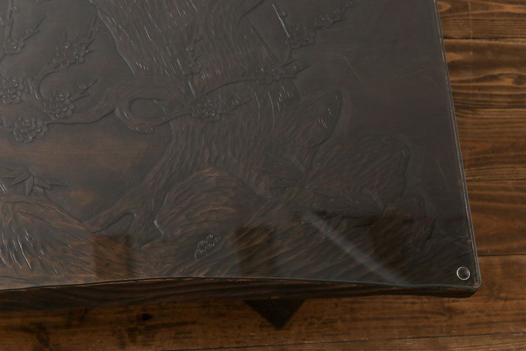ラフジュ工房> テーブル> 座卓 > 中古 伝統工芸軽井沢彫り 特注品 天板栃の木一枚板 梅の大木が目を引く座卓(ローテーブル)(定価約88万円)(R-032057)