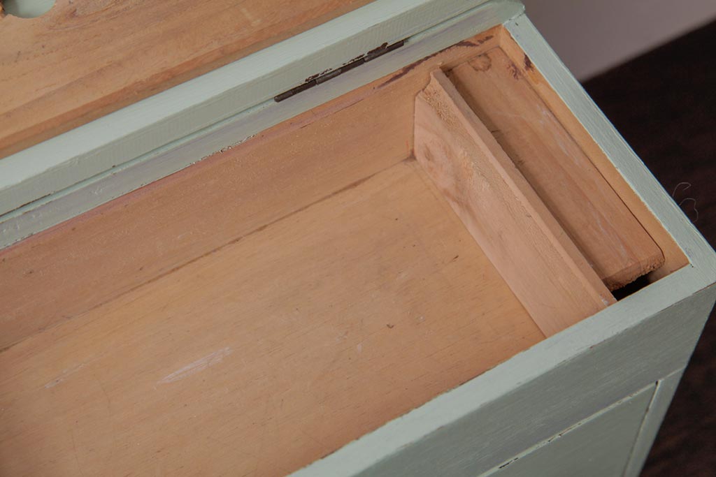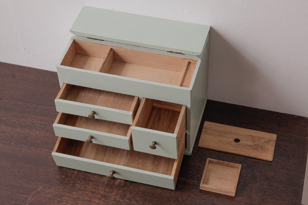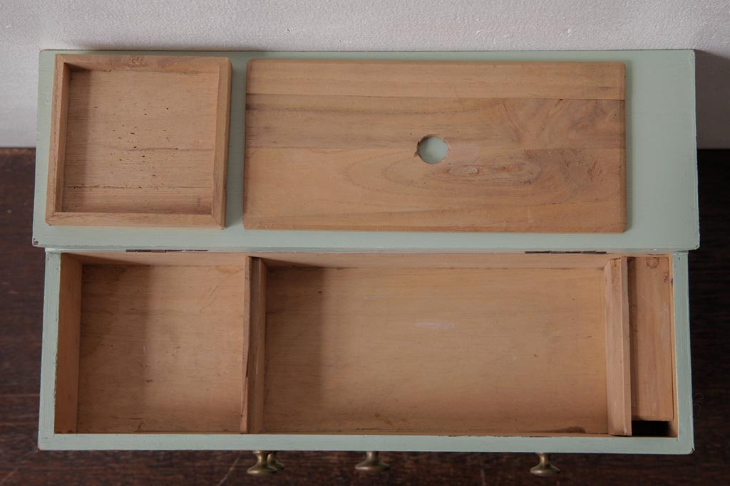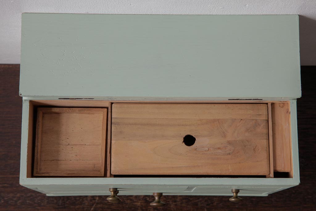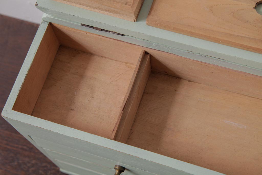 ラフジュ工房> 小物収納・トランク> 裁縫箱・ソーイングボックス > アンティーク雑貨 ペイント家具 淡いグリーンがレトロなソーイングボックス(裁縫箱、小引き出し、小物収納)