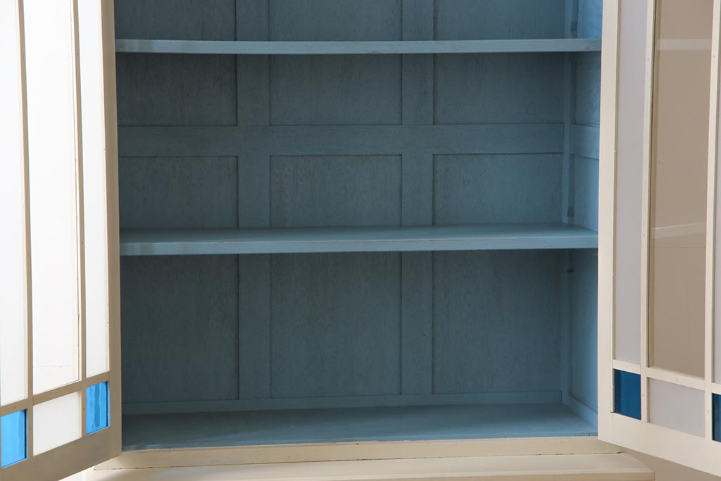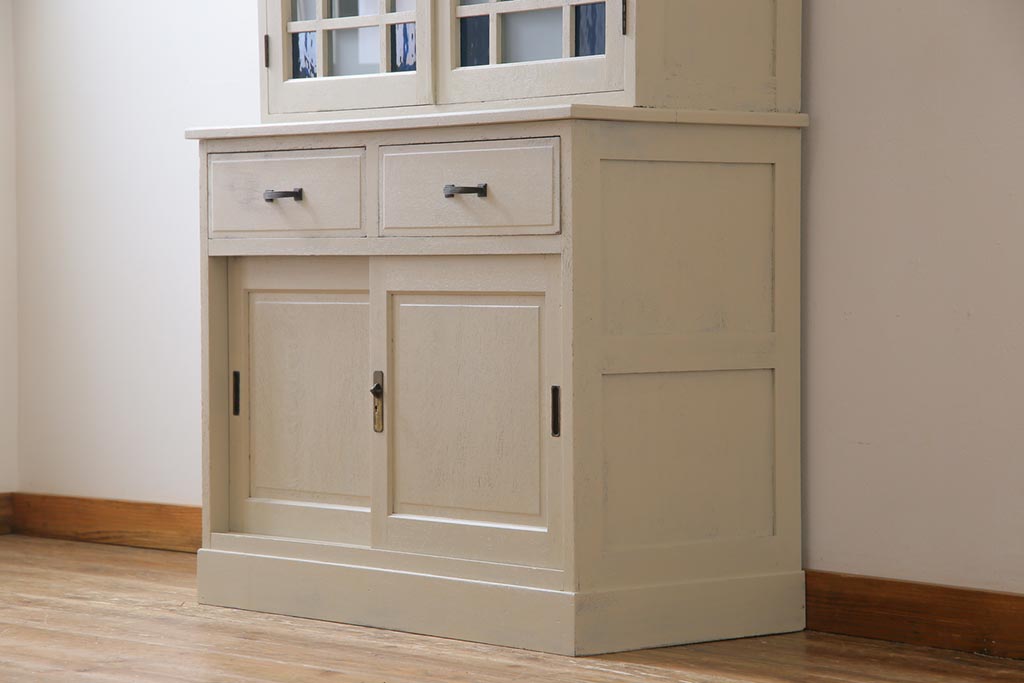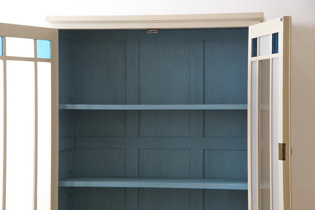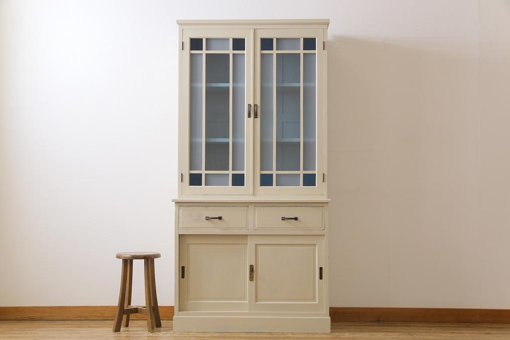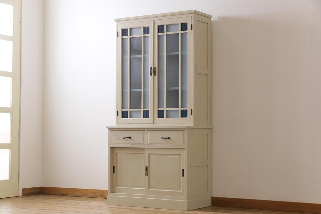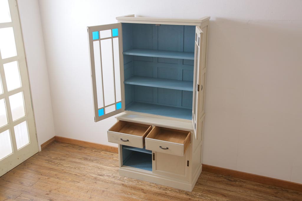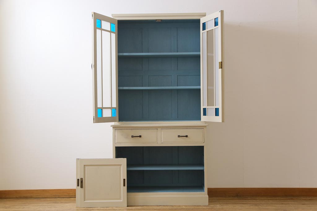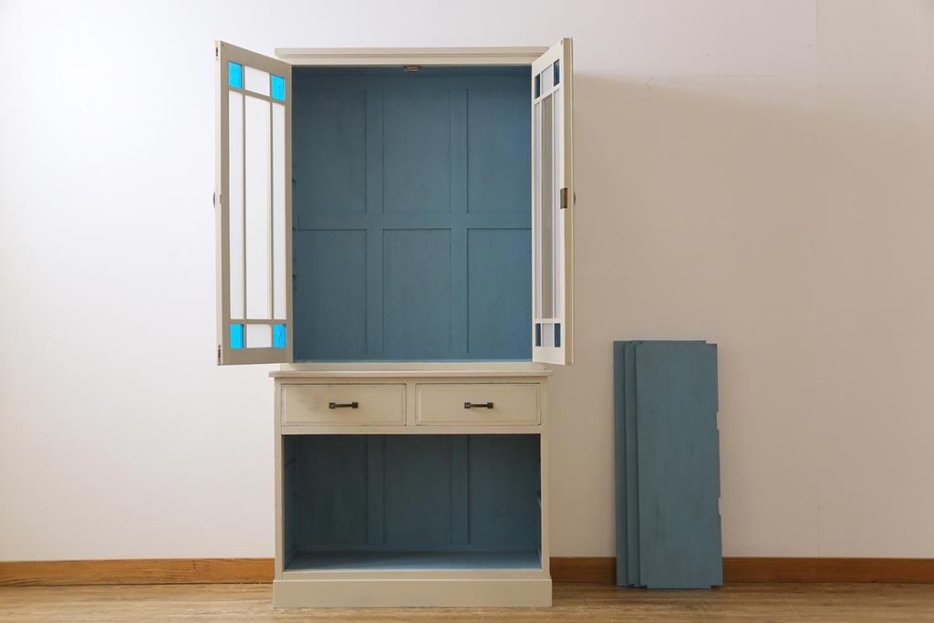 和製アンティーク ペイント家具 色ガラス入り 爽やかな印象のシャビーシックなカップボード(食器棚、収納棚)