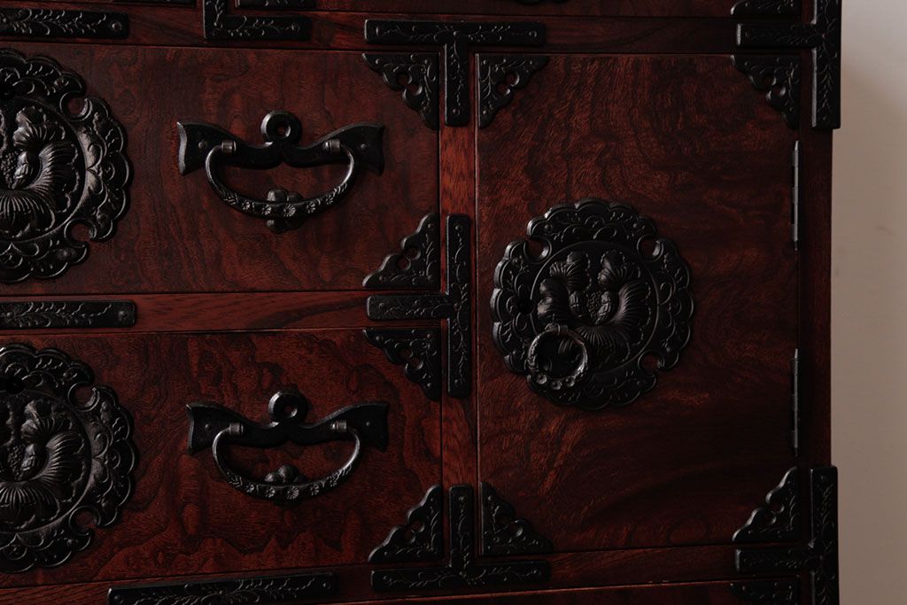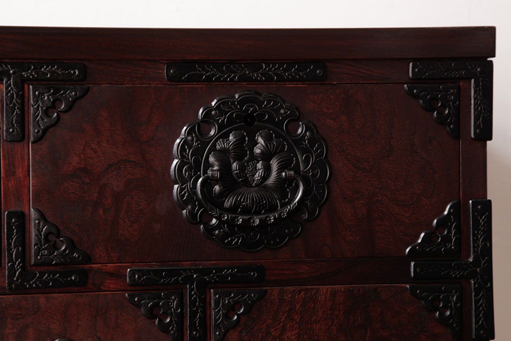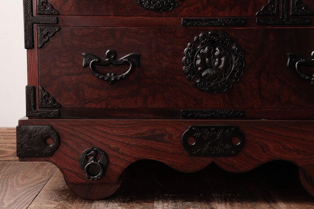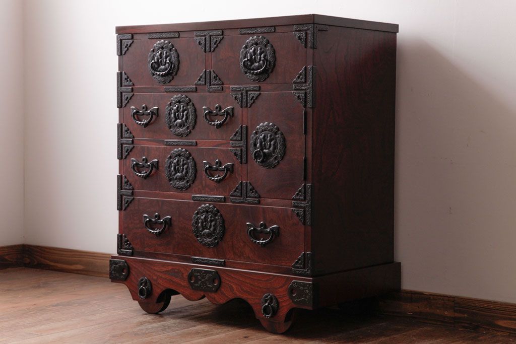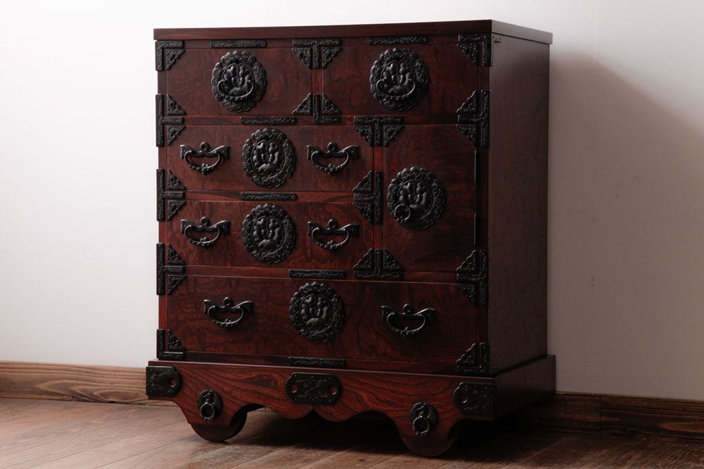 和箪笥> 小箪笥 > 中古 伝統民芸家具 岩谷堂箪笥 厚みのある金具が立派な威厳のある車箪笥(小箪笥、チェスト)