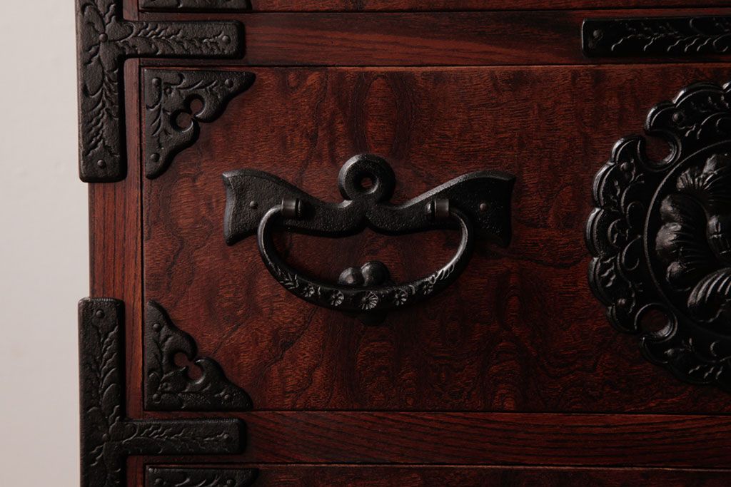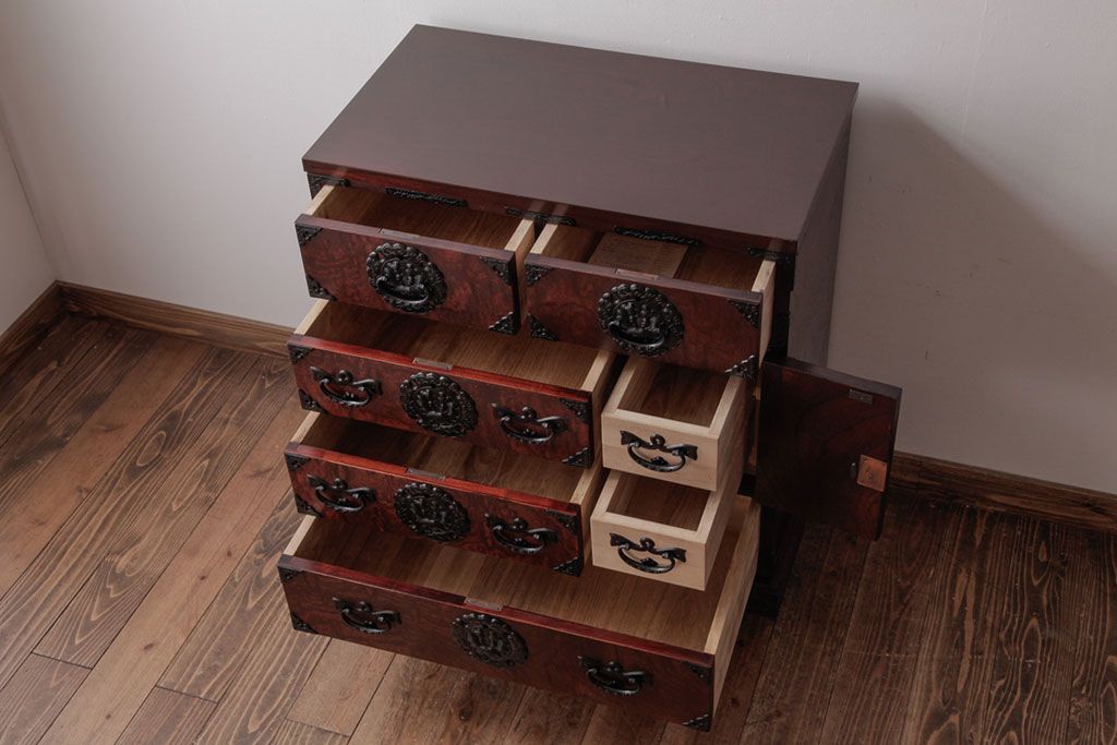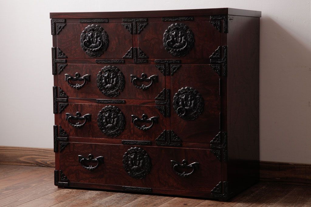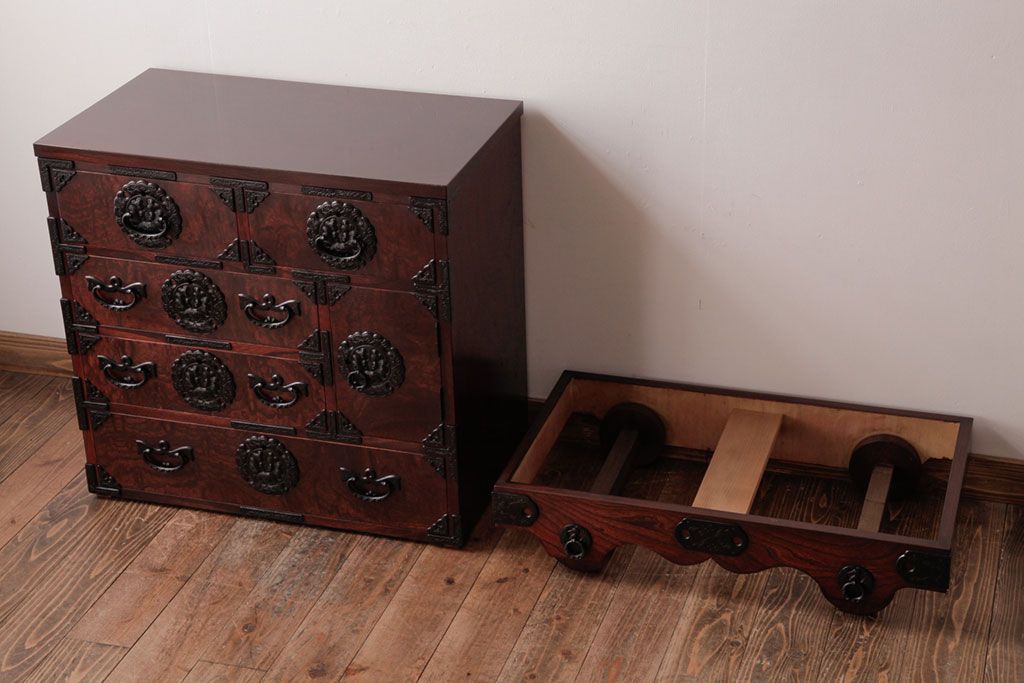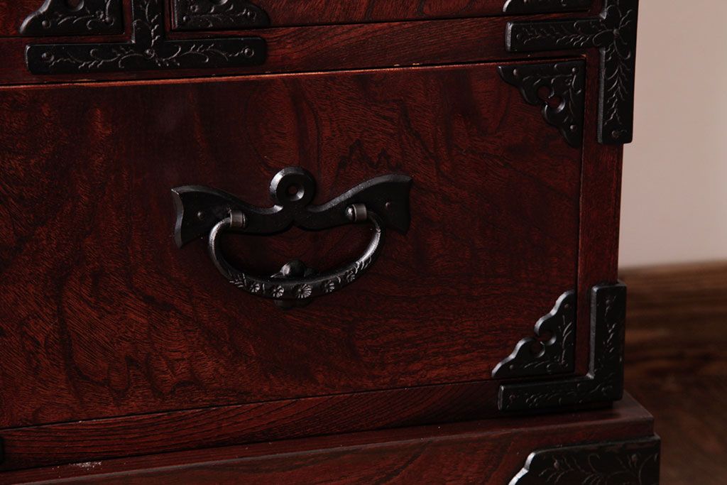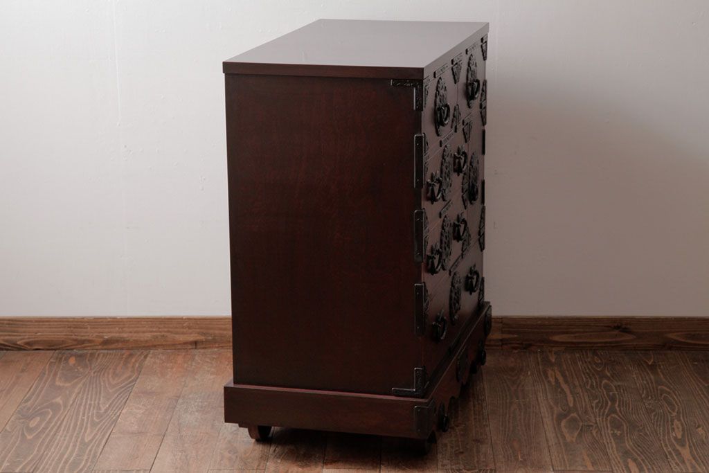 和箪笥 > 中古 伝統民芸家具 岩谷堂箪笥 厚みのある金具が立派な威厳のある車箪笥(小箪笥、チェスト)