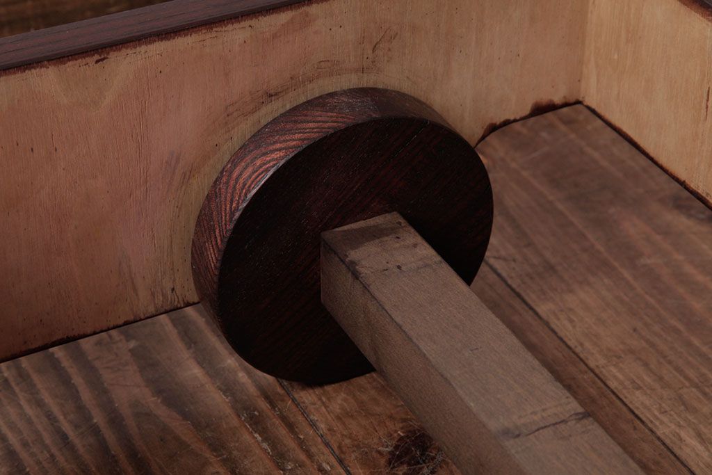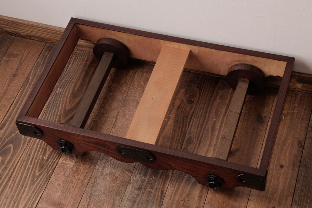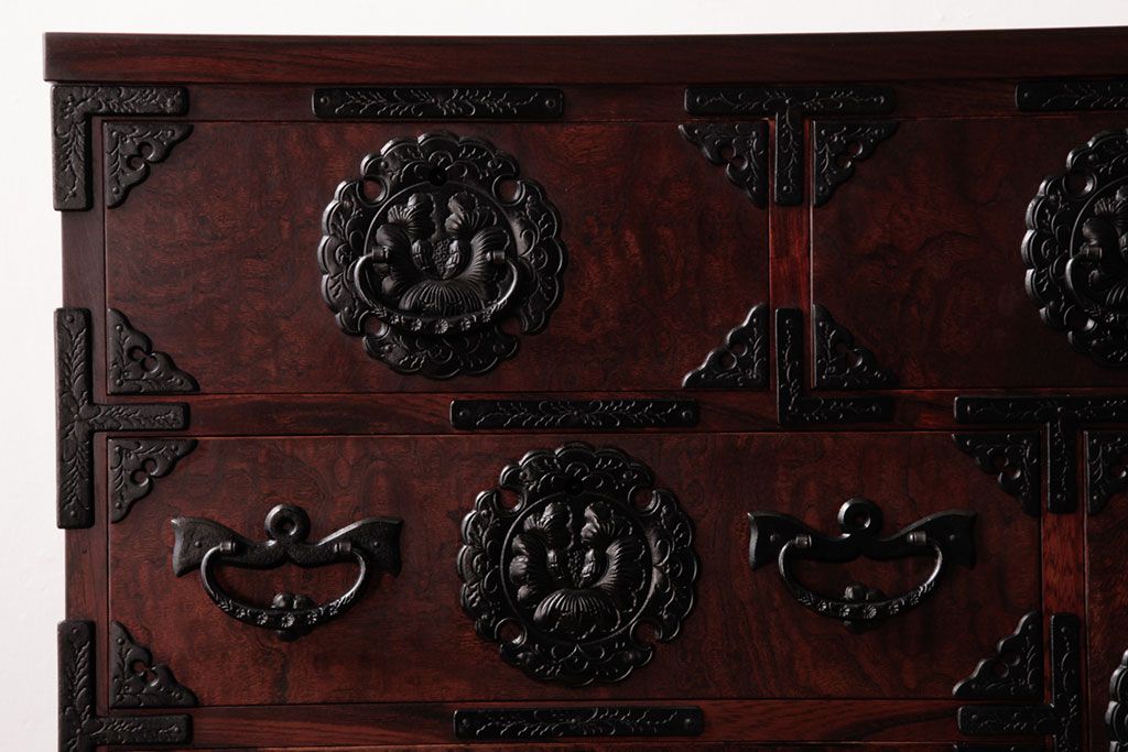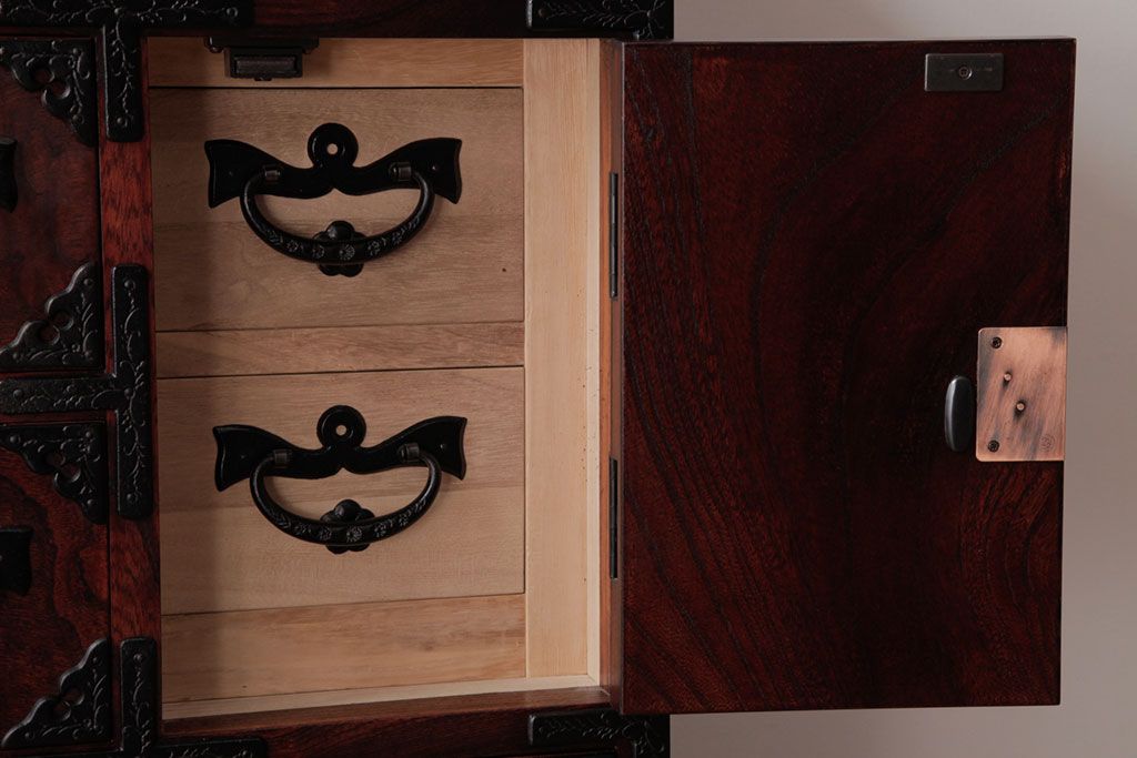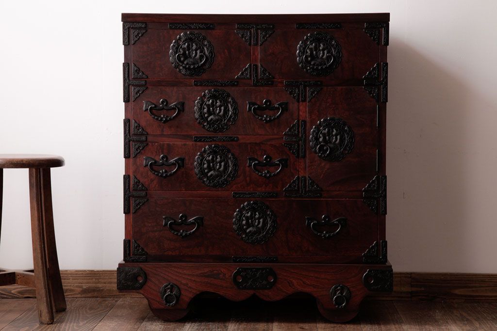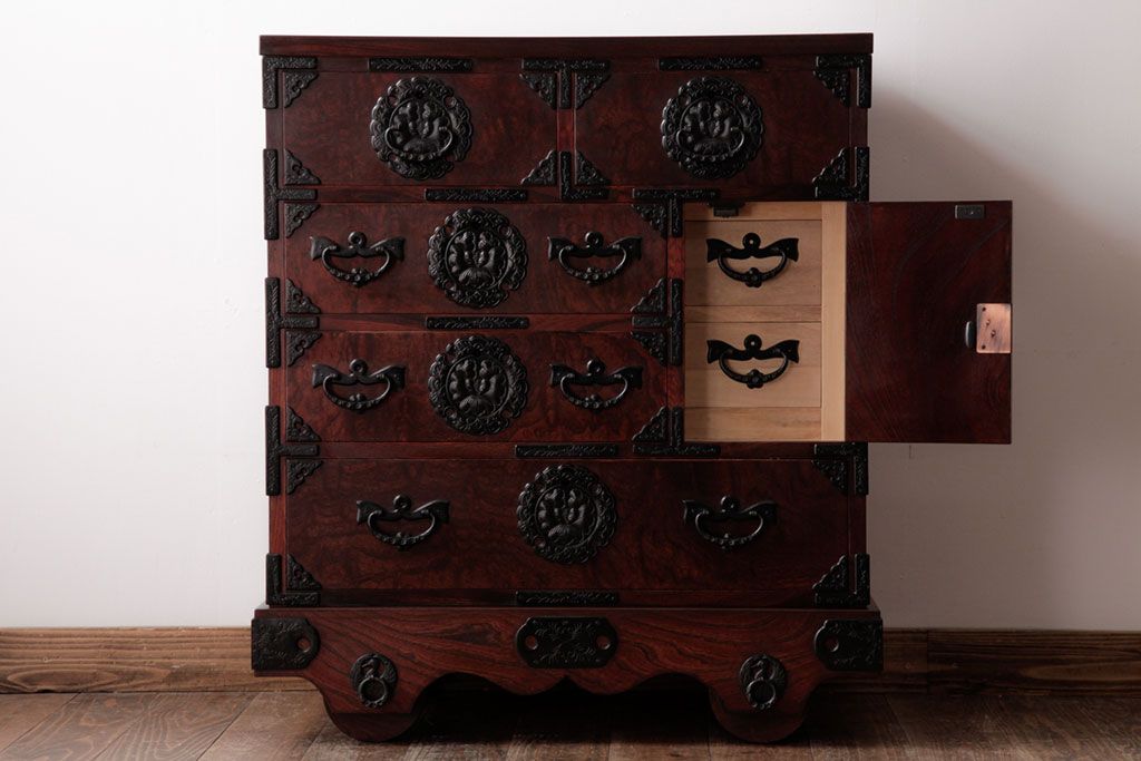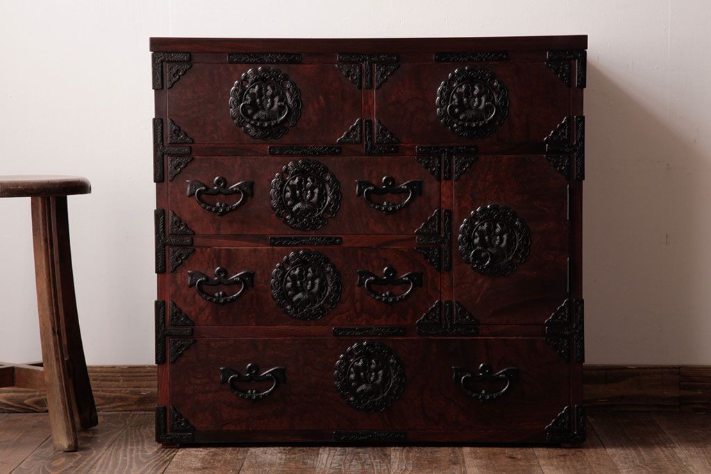 和箪笥 > 中古 伝統民芸家具 岩谷堂箪笥 厚みのある金具が立派な威厳のある車箪笥(小箪笥、チェスト)