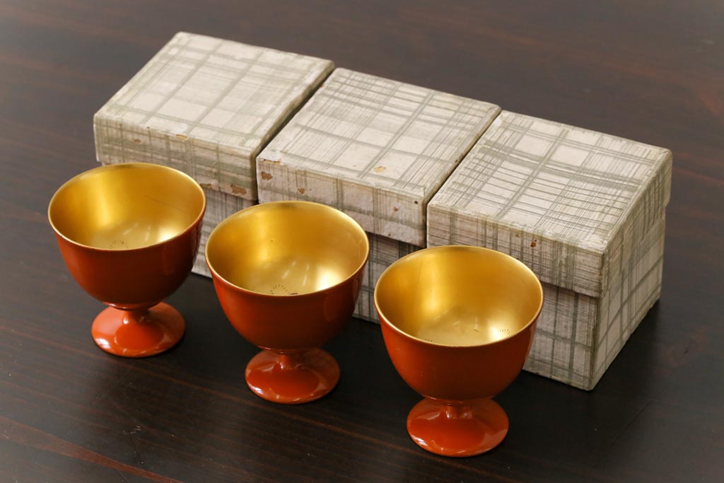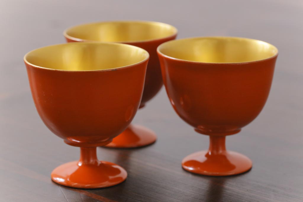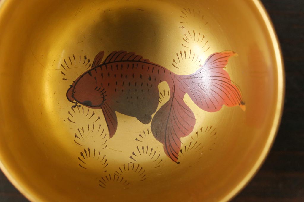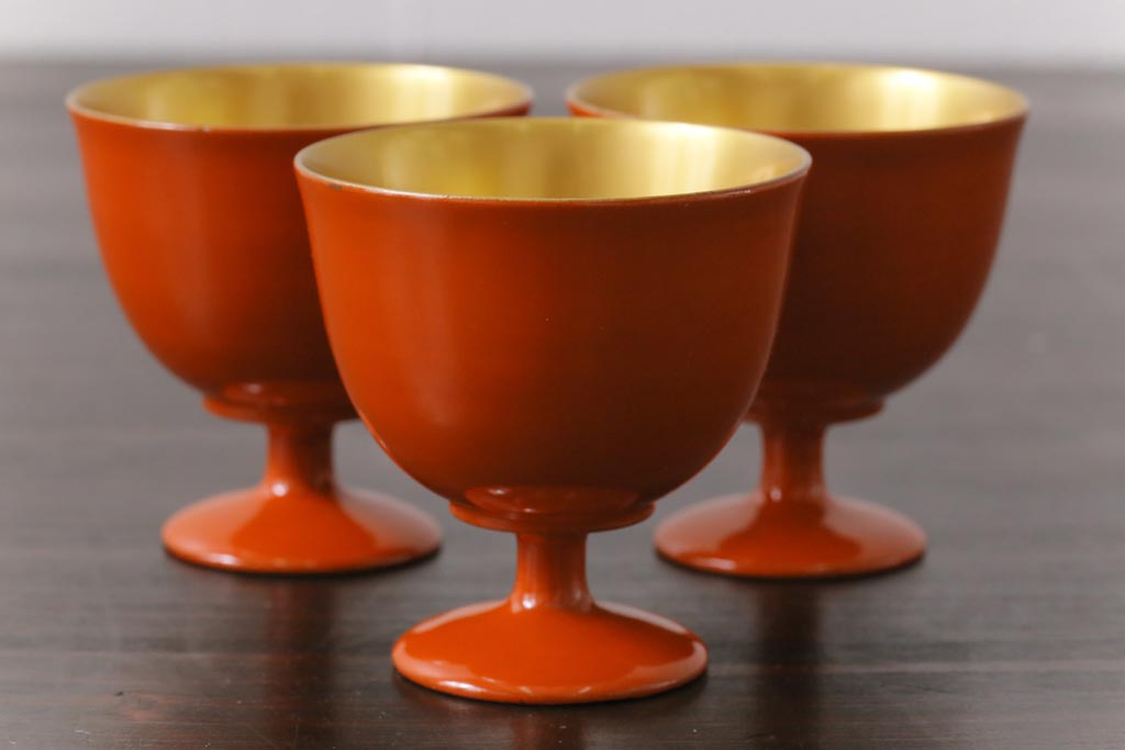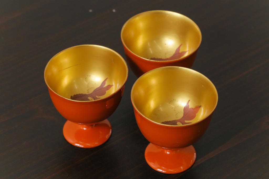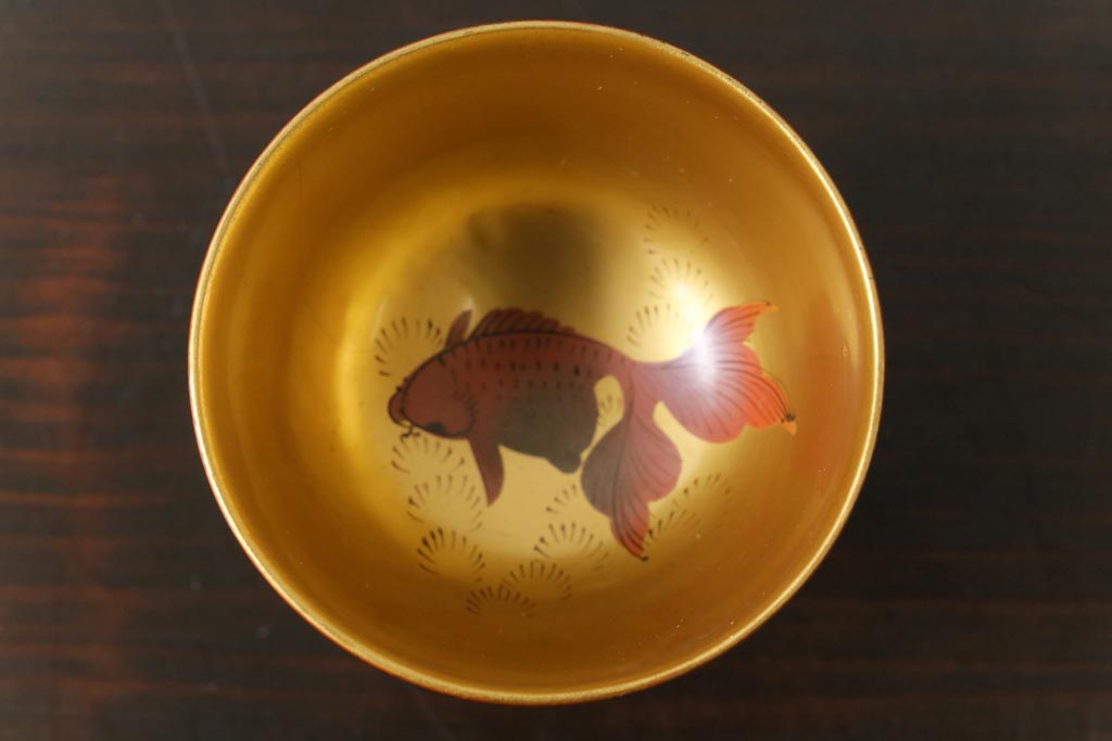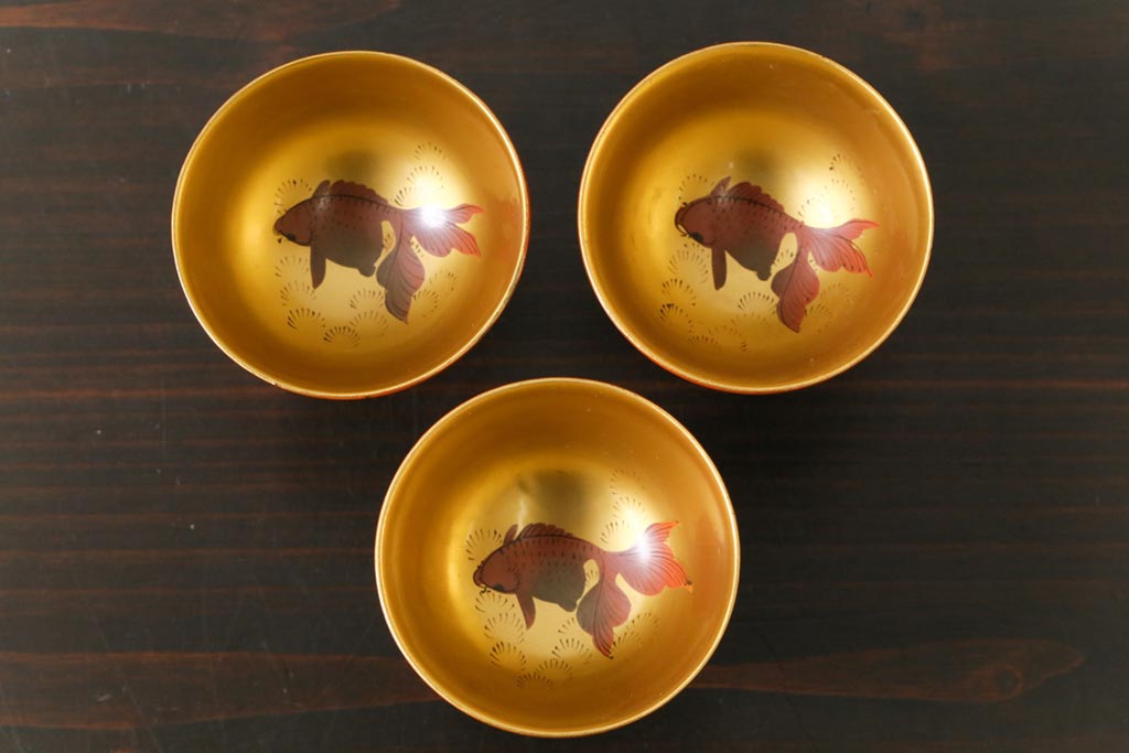 ラフジュ工房> 骨董・美術品> 骨董-漆器 > 和製アンティーク 大正昭和初期 金魚の図 木製蒔絵盃(漆器、杯、和食器)3客セット