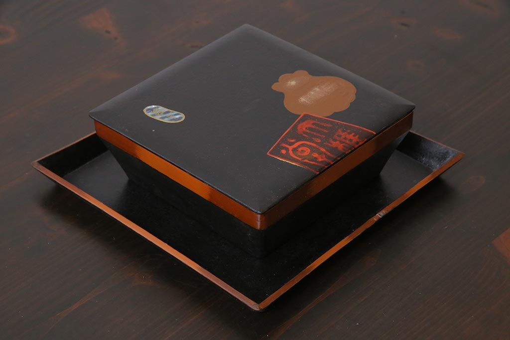 和製アンティーク 大正昭和初期 螺鈿入り 盆付き木製角菓子器(漆器、手箱)です。