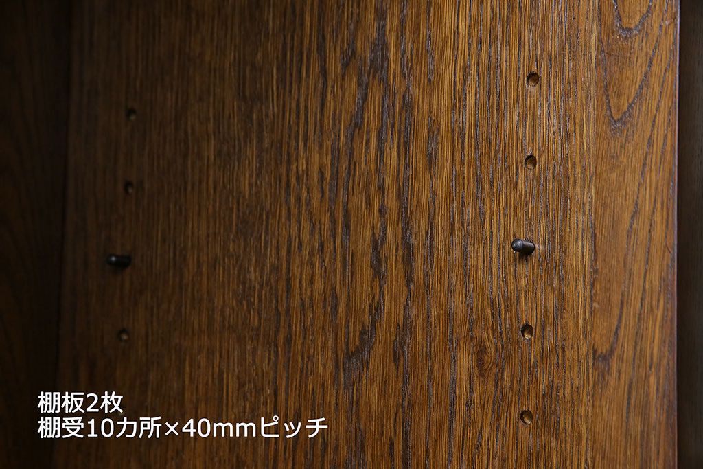 棚板は取り外しできます。棚板は2枚あり、棚受け10ヶ所、40mmピッチで調整できます。棚幅サイズのものが1枚の作りです。