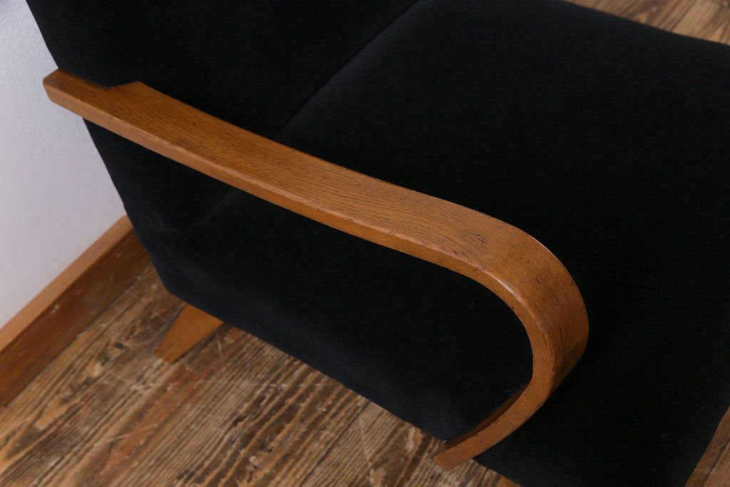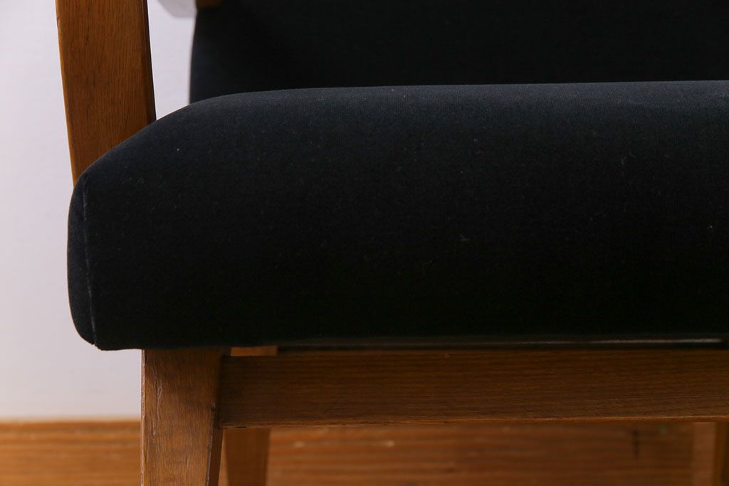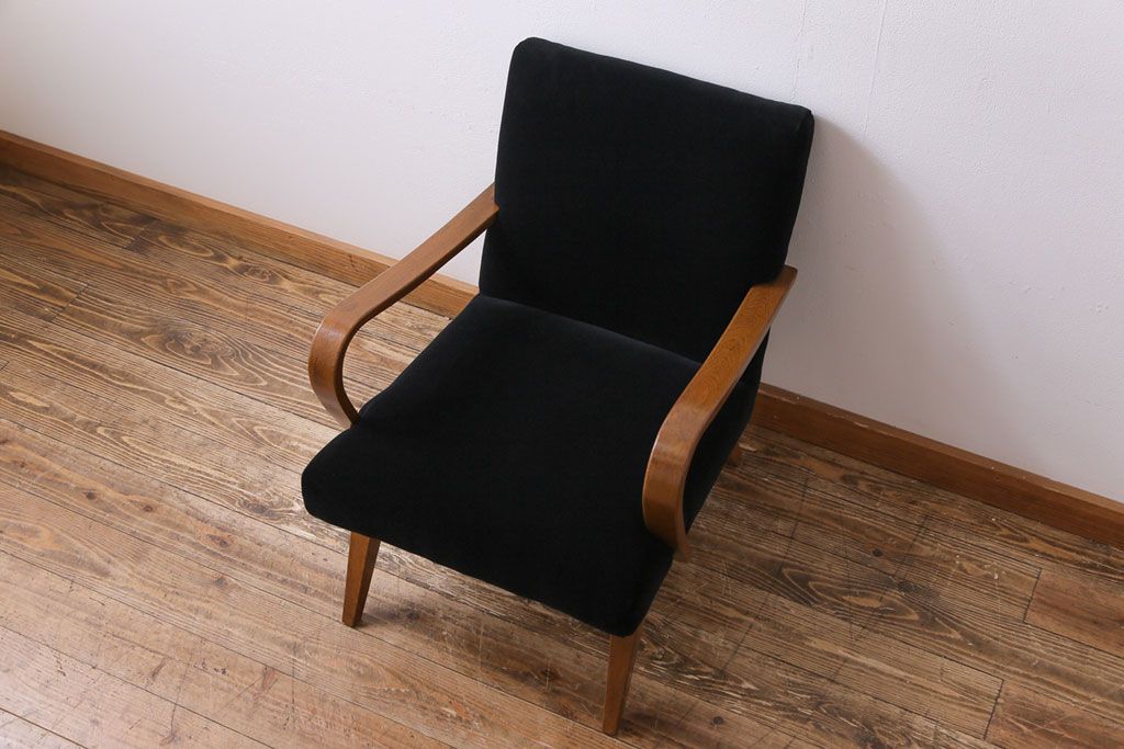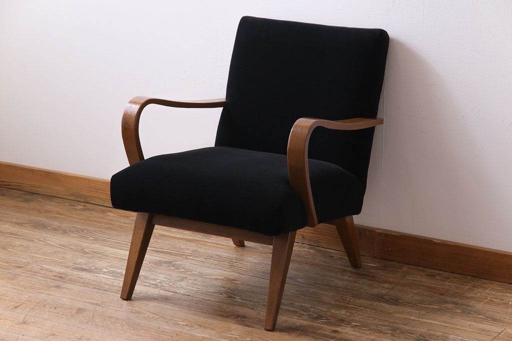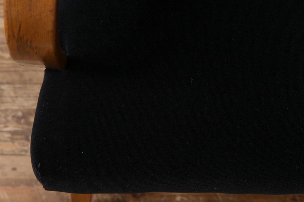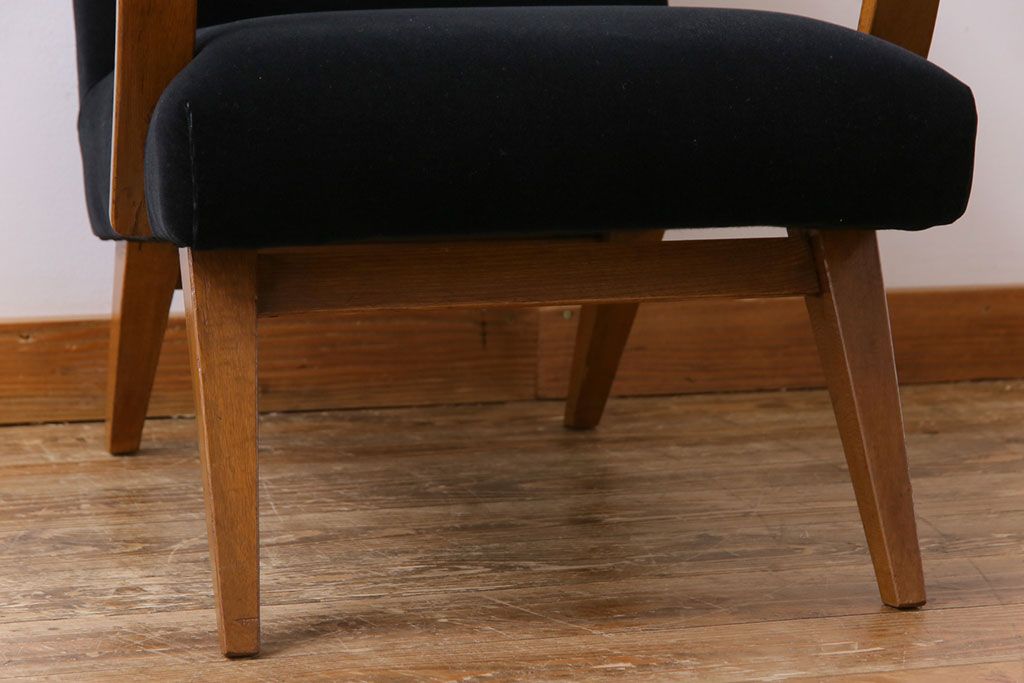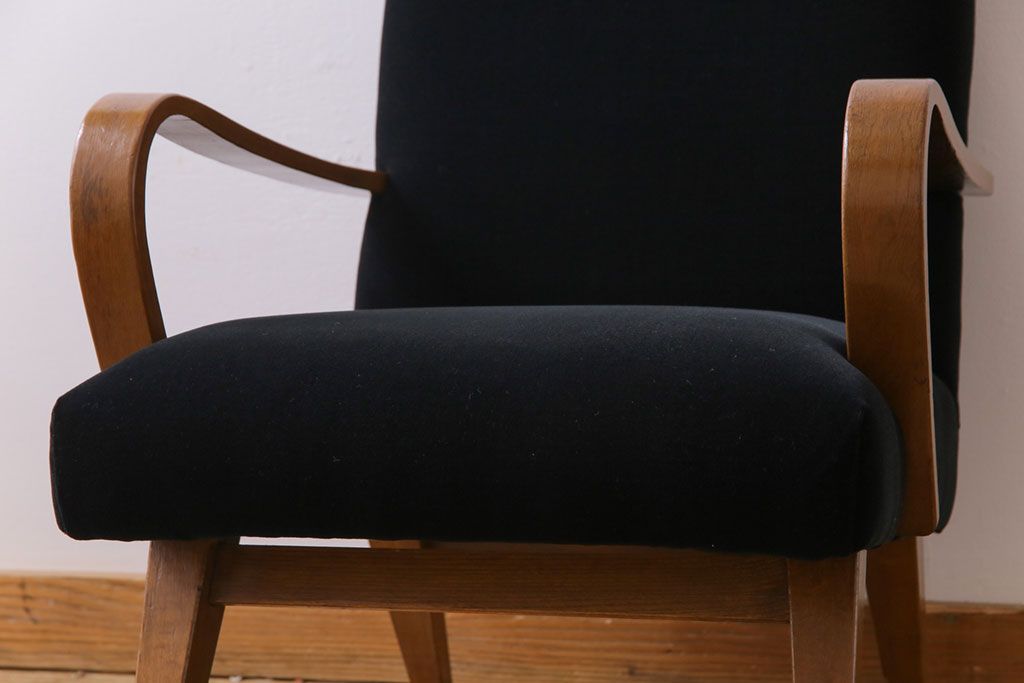昭和レトロ ナラ材 黒い座面が格好いい一人掛けソファ(アームチェア)です。