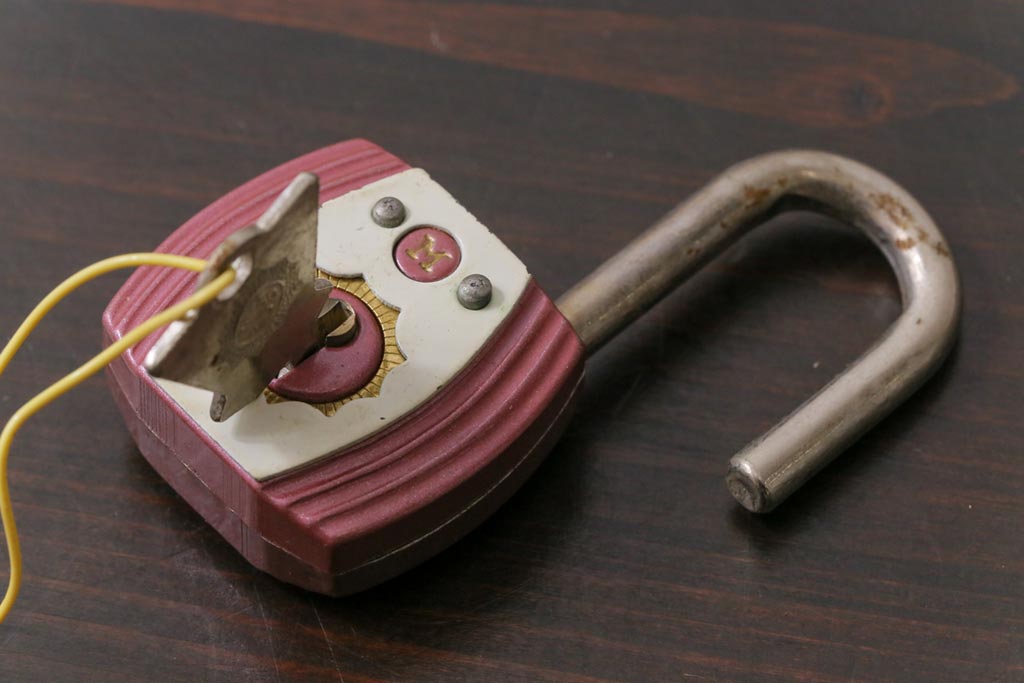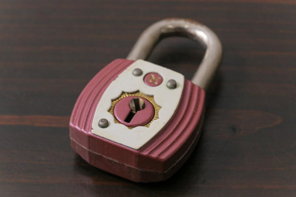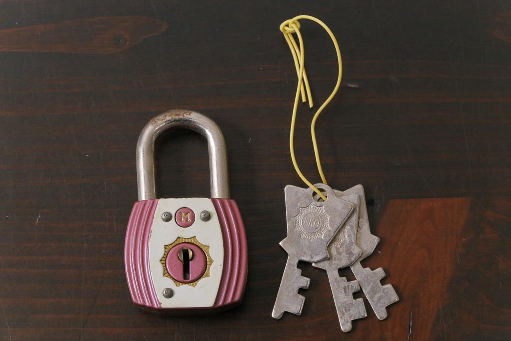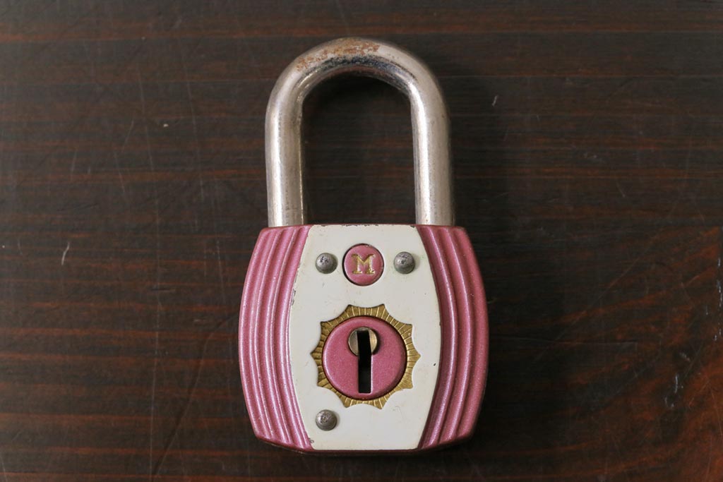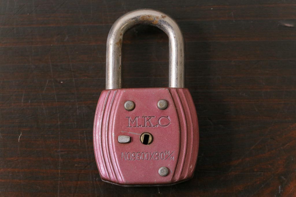 アンティーク雑貨 昭和レトロ M.K.C 可愛らしい色合いのパドロックキー(南京錠、鍵、錠前)(1)