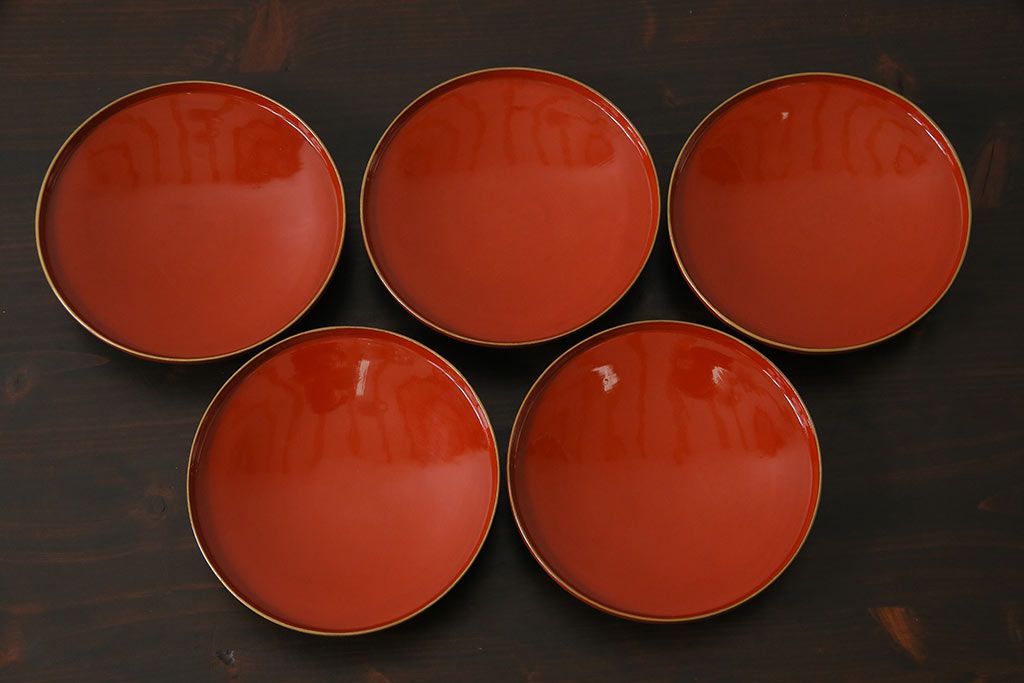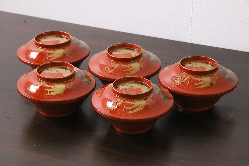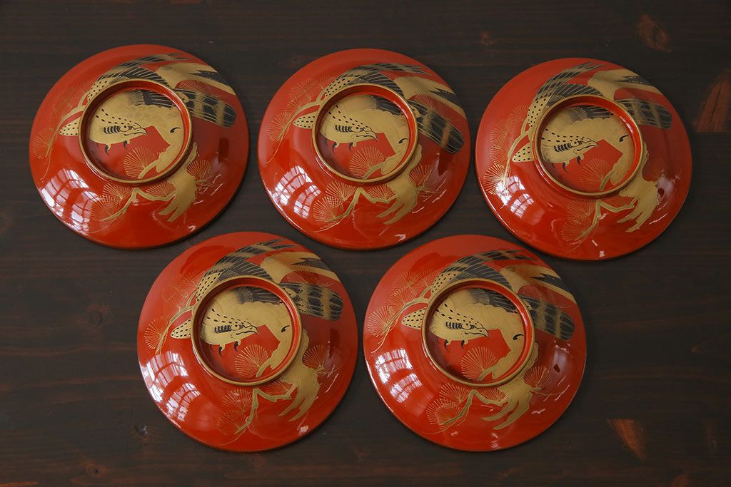 ラフジュ工房> 骨董・美術品> 骨董-漆器 > 古民具・骨董 明治大正期 蒔絵 鷹と松 朱塗りのお椀5客セット(木製漆器)