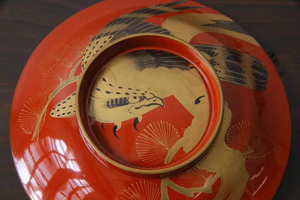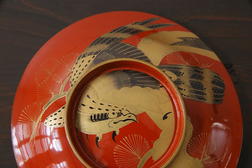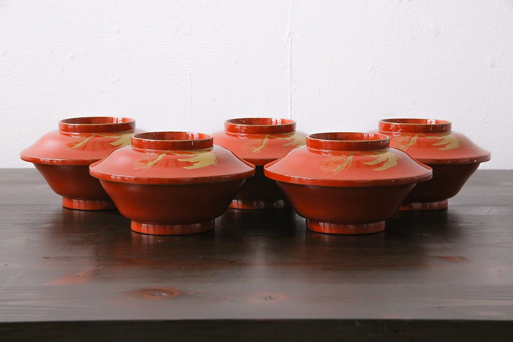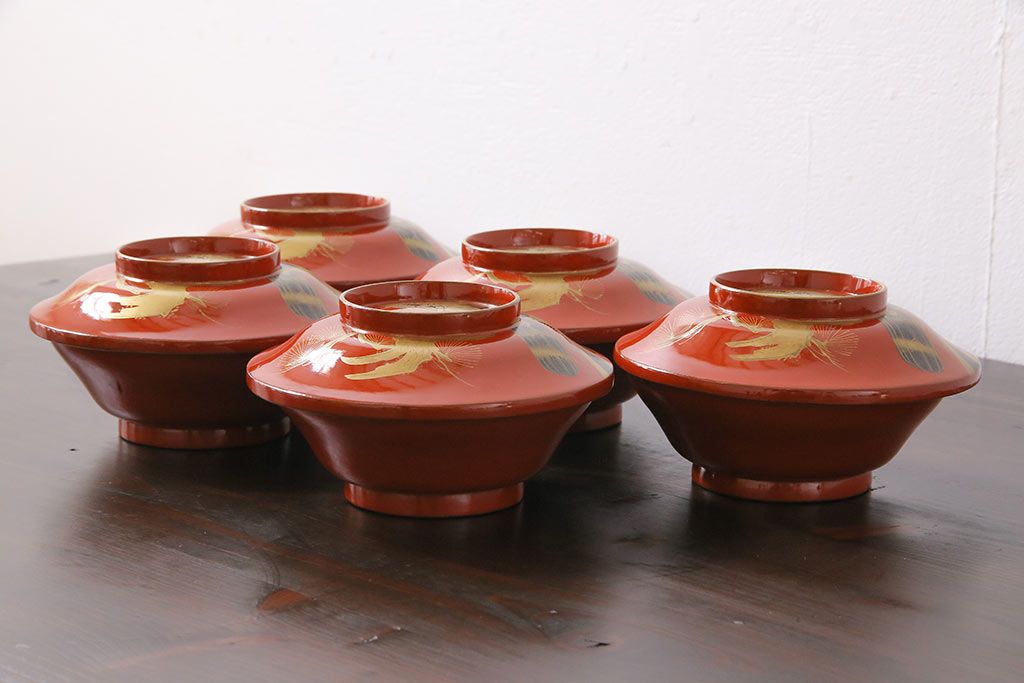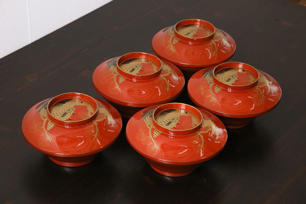 ラフジュ工房> 骨董・美術品 > 古民具・骨董 明治大正期 蒔絵 鷹と松 朱塗りのお椀5客セット(木製漆器)