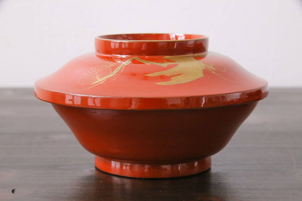 ラフジュ工房> 和食器・茶道具> お椀・茶碗 > 古民具・骨董 明治大正期 蒔絵 鷹と松 朱塗りのお椀5客セット(木製漆器)