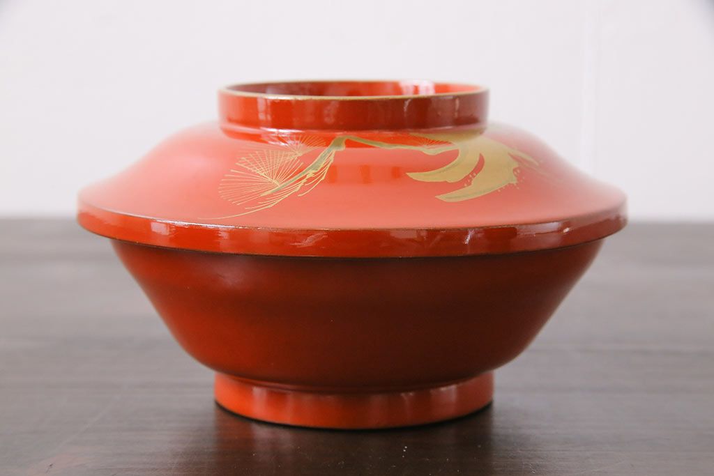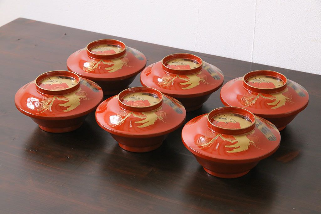 ラフジュ工房> 和食器・茶道具> お椀・茶碗 > アンティーク雑貨 古民具・骨董 明治大正期 蒔絵 鷹と松 朱塗りのお椀6客セット(木製漆器)(1)