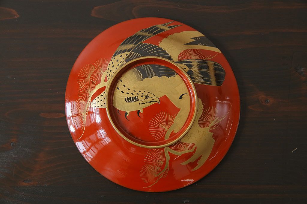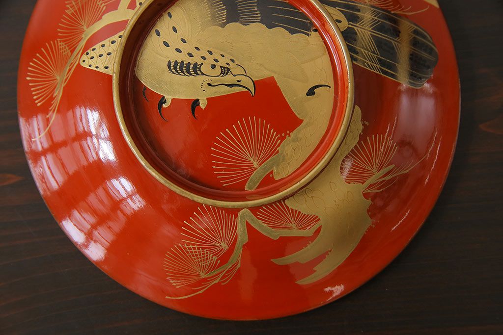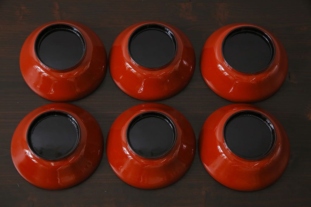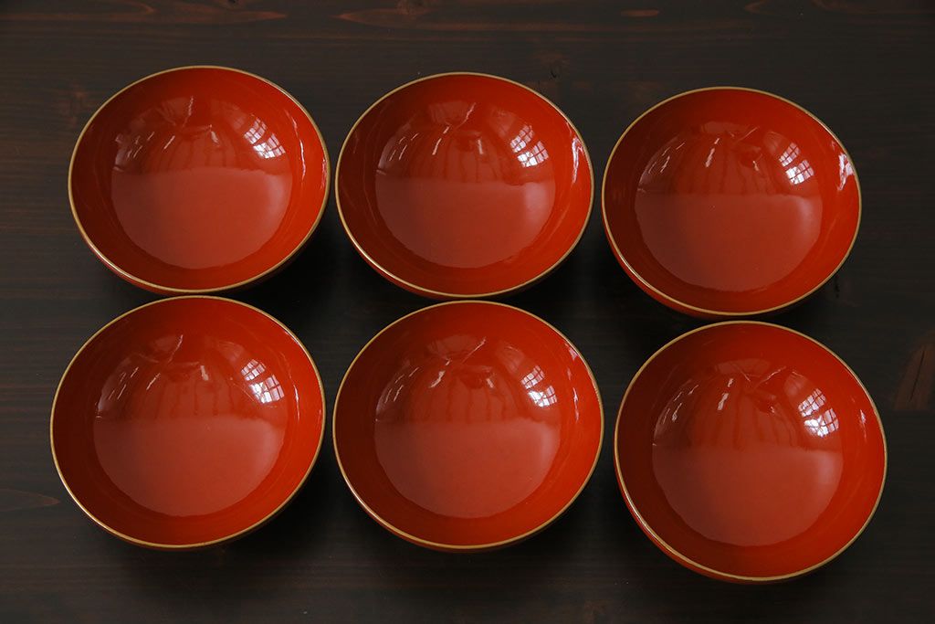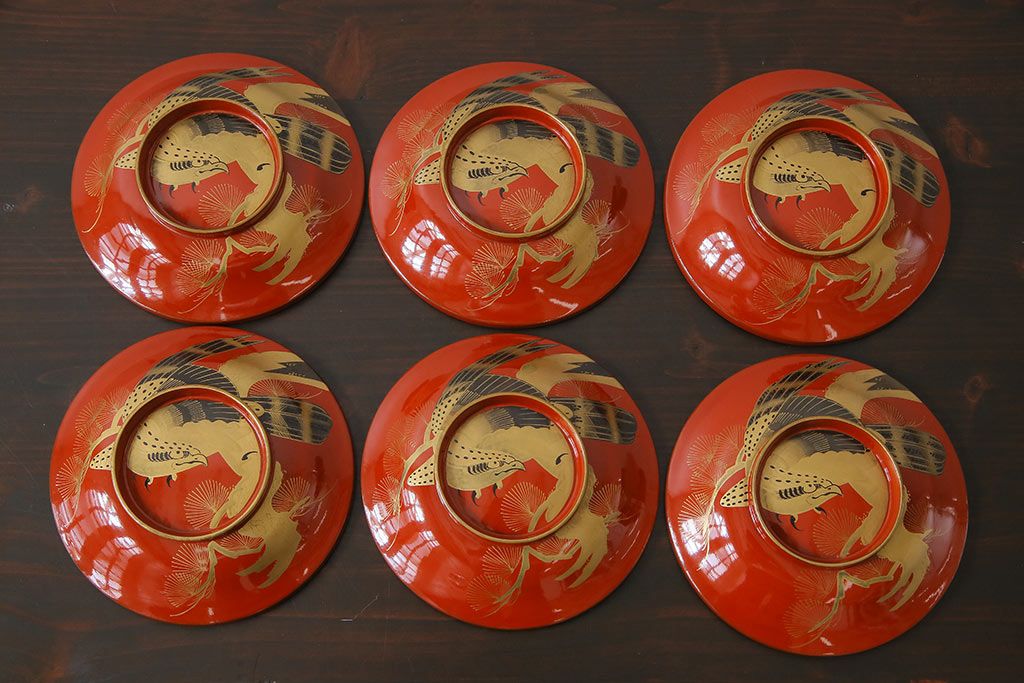 ラフジュ工房> 骨董・美術品 > アンティーク雑貨 古民具・骨董 明治大正期 蒔絵 鷹と松 朱塗りのお椀6客セット(木製漆器)(1)