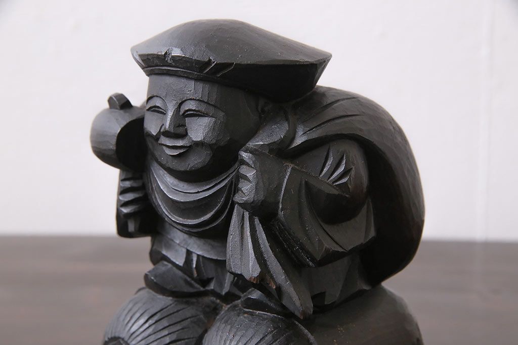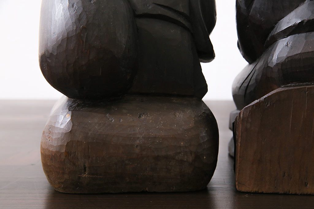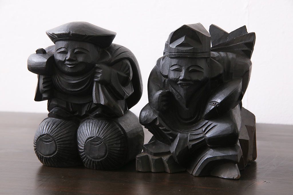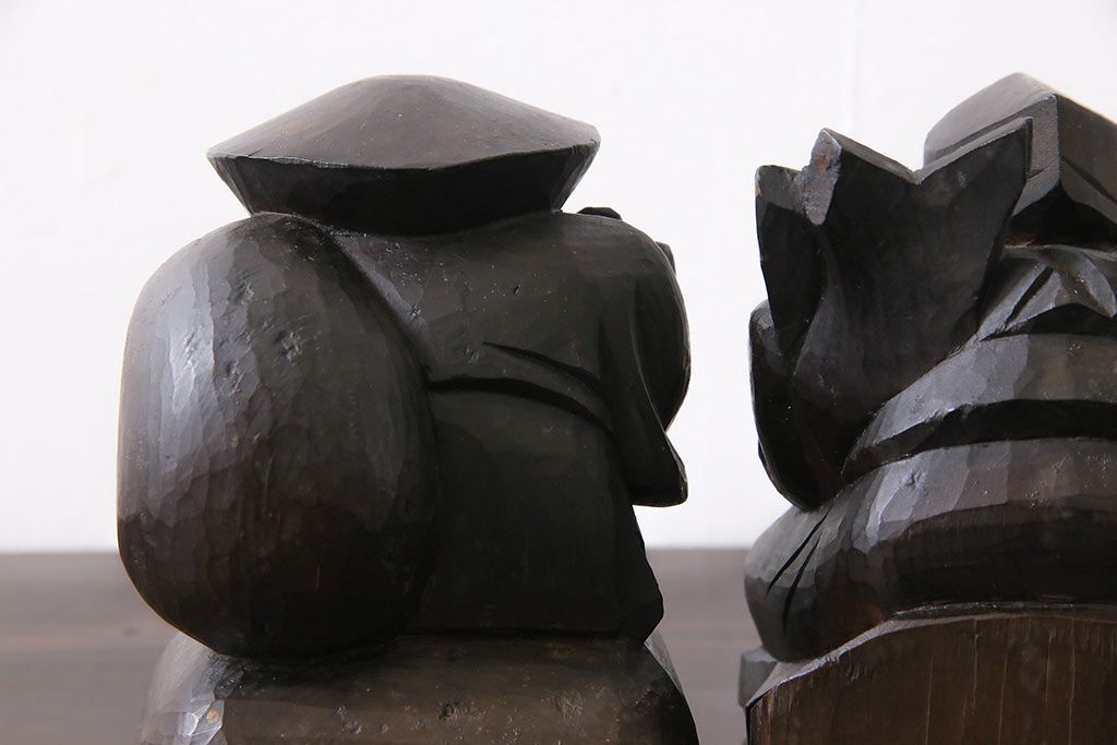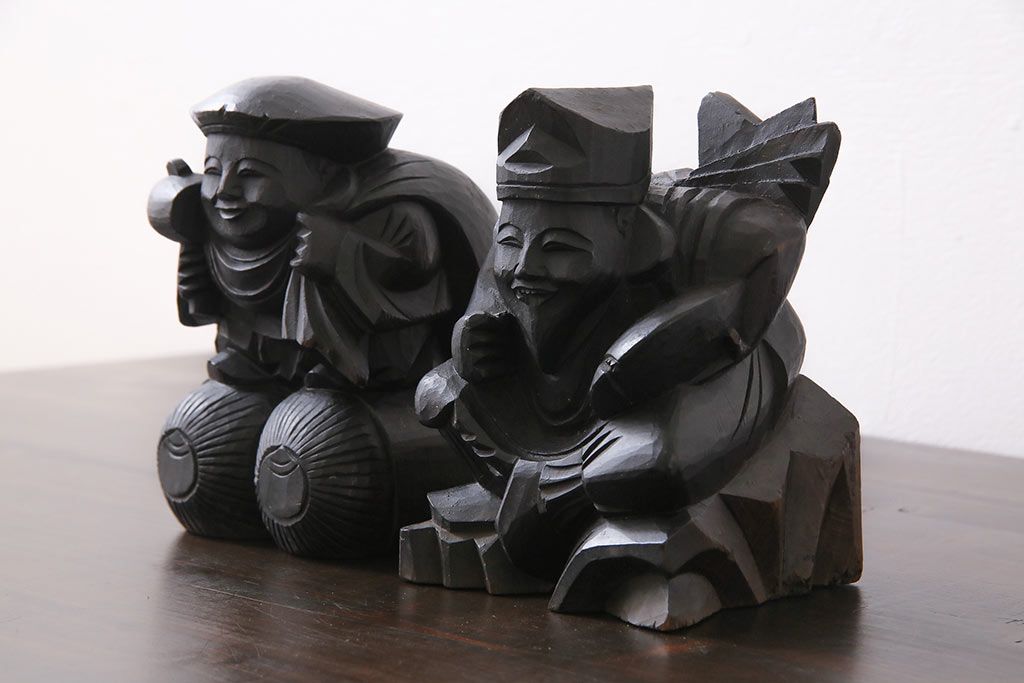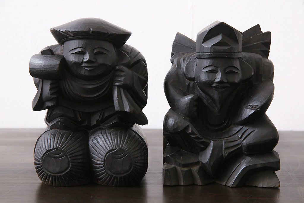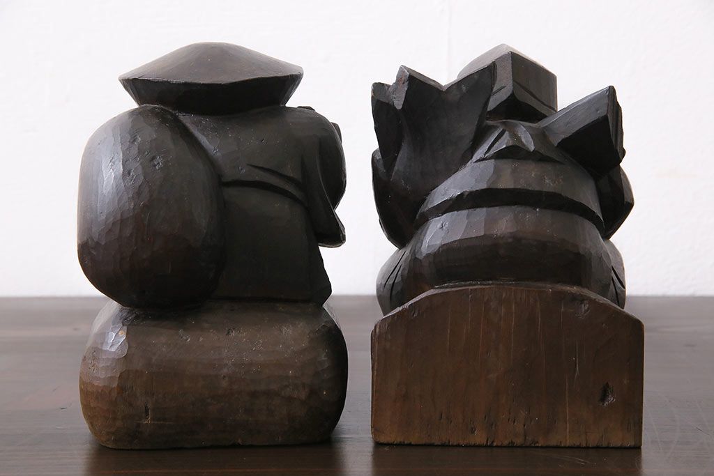 アンティーク雑貨 和製アンティーク 明治大正期 古い木の味わいが魅力の大黒天・恵比寿天の置物(木彫り)
