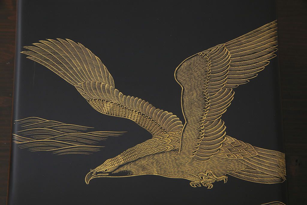 アンティーク雑貨 和製アンティーク 沈金蒔絵 凛々しい図柄が目を引く手許箱(小物入れ、文箱、硯箱)