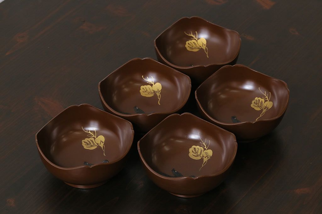 ラフジュ工房> 骨董・美術品> 骨董-漆器 > 和製アンティーク 花鳥図 金彩が鮮やかな木製漆器小鉢(向付、小皿、和食器)(1)