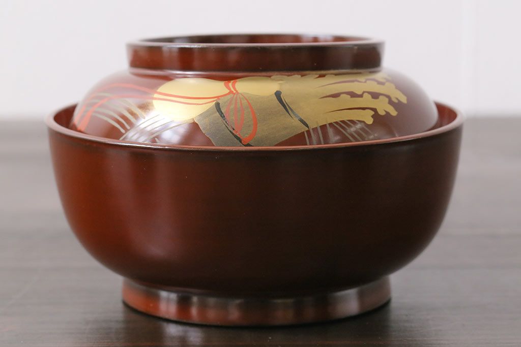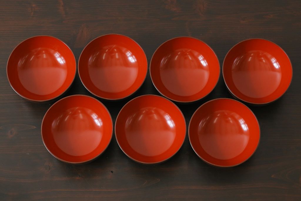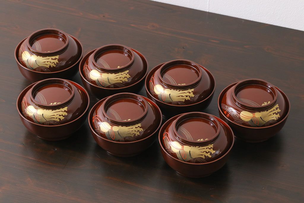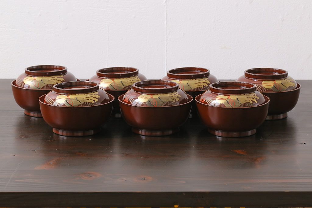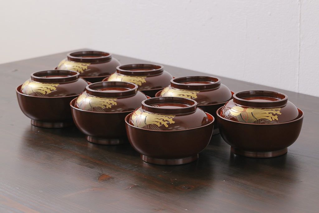 ラフジュ工房> 骨董・美術品> 骨董-漆器 > アンティーク雑貨 和製アンティーク 瓢箪の図 シックな雰囲気の木製お椀(漆器、和食器)7客セット