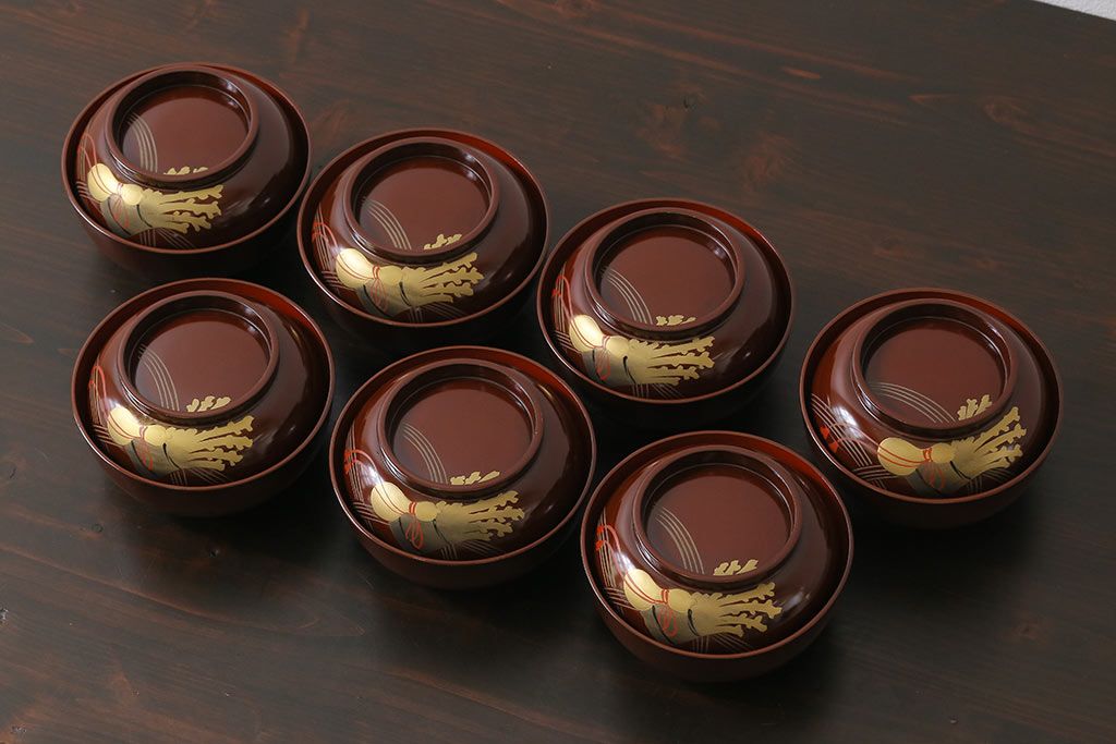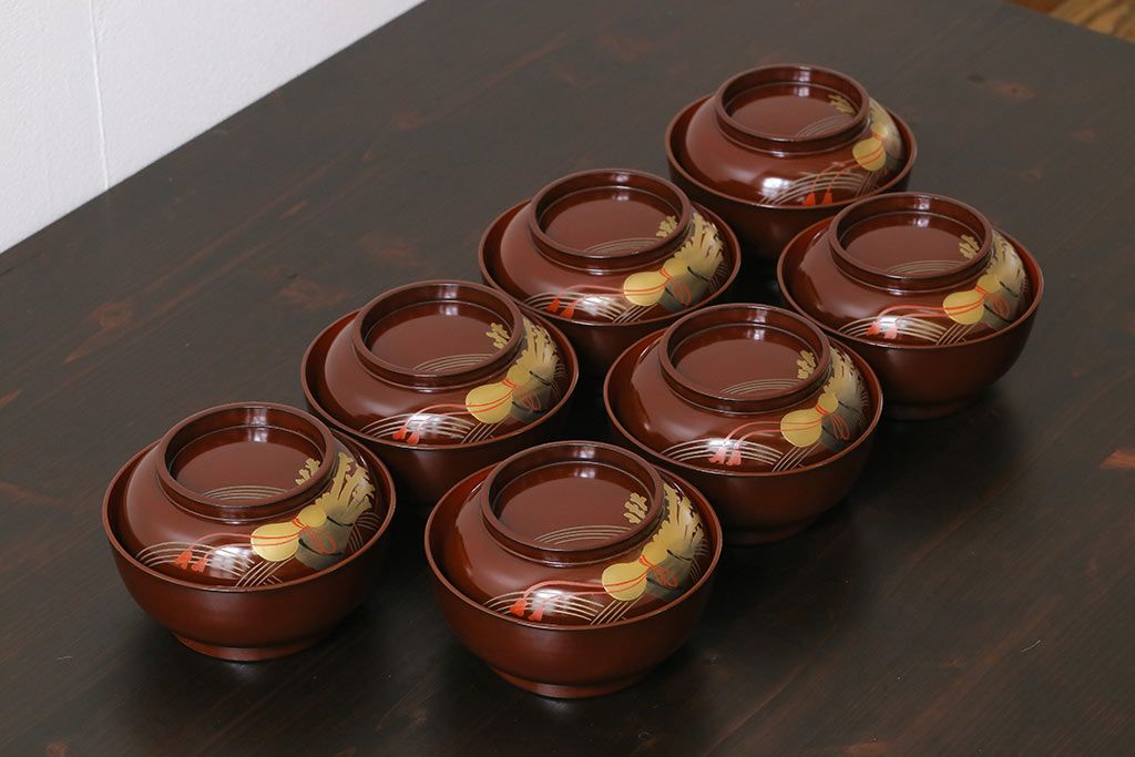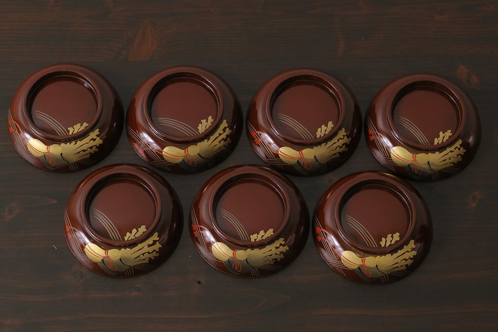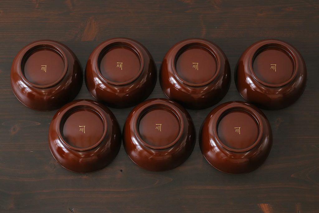 ラフジュ工房> 和食器・茶道具> お椀・茶碗 > アンティーク雑貨 和製アンティーク 瓢箪の図 シックな雰囲気の木製お椀(漆器、和食器)7客セット