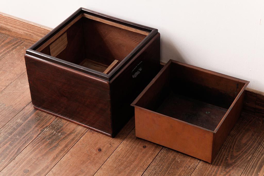 アンティーク雑貨 和製アンティーク 唐木 花梨材の艶が美しい角火鉢(木製火鉢、手焙り、カリン材)