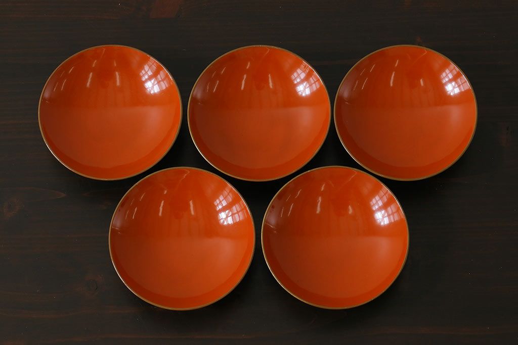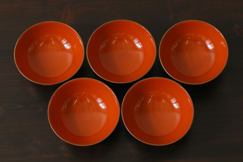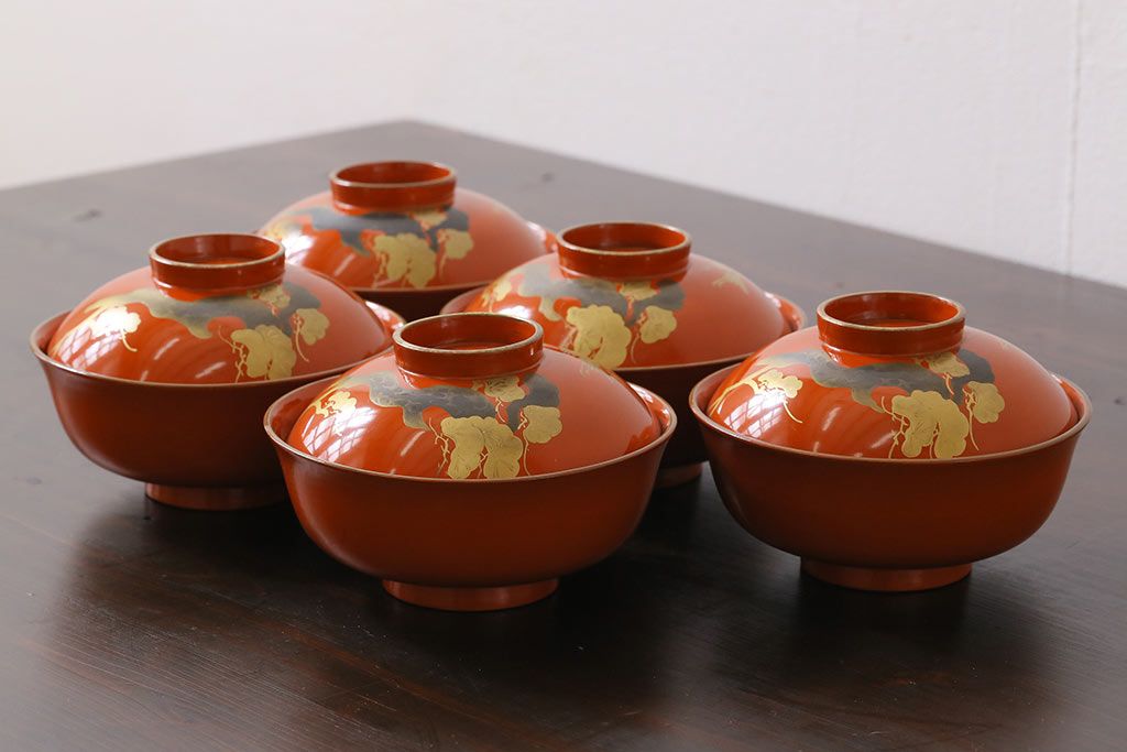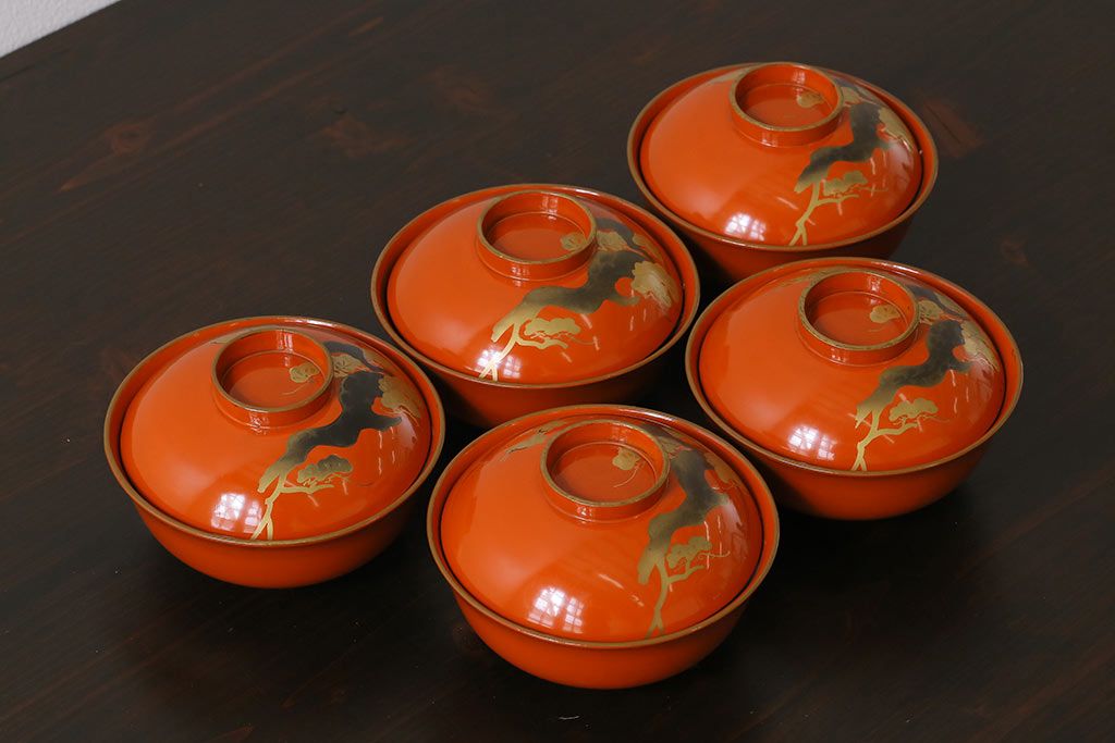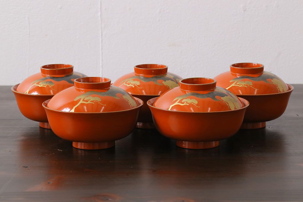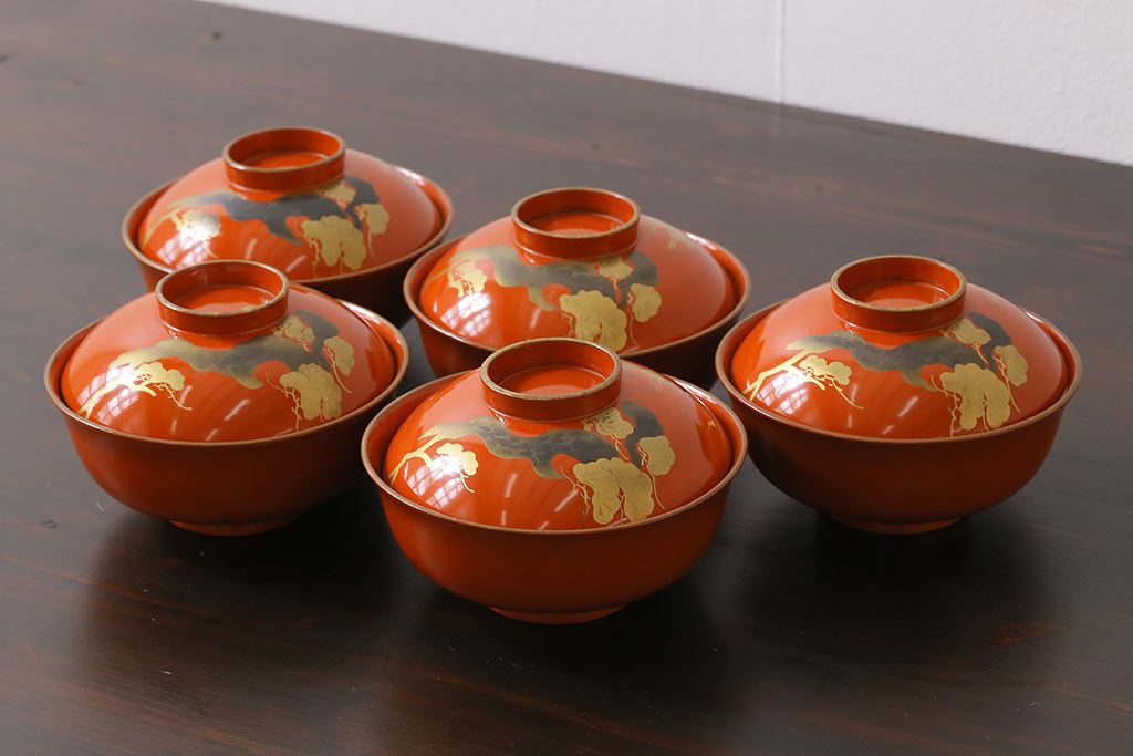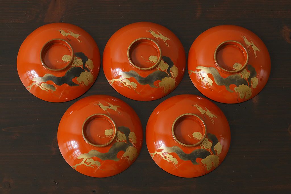 和製アンティーク 松・鶴図柄 縁起物の蒔絵が美しい木製椀5客セット(漆器、和食器)