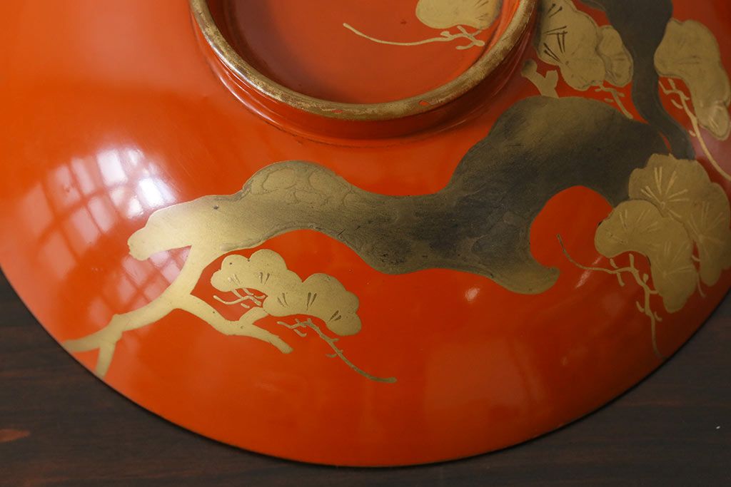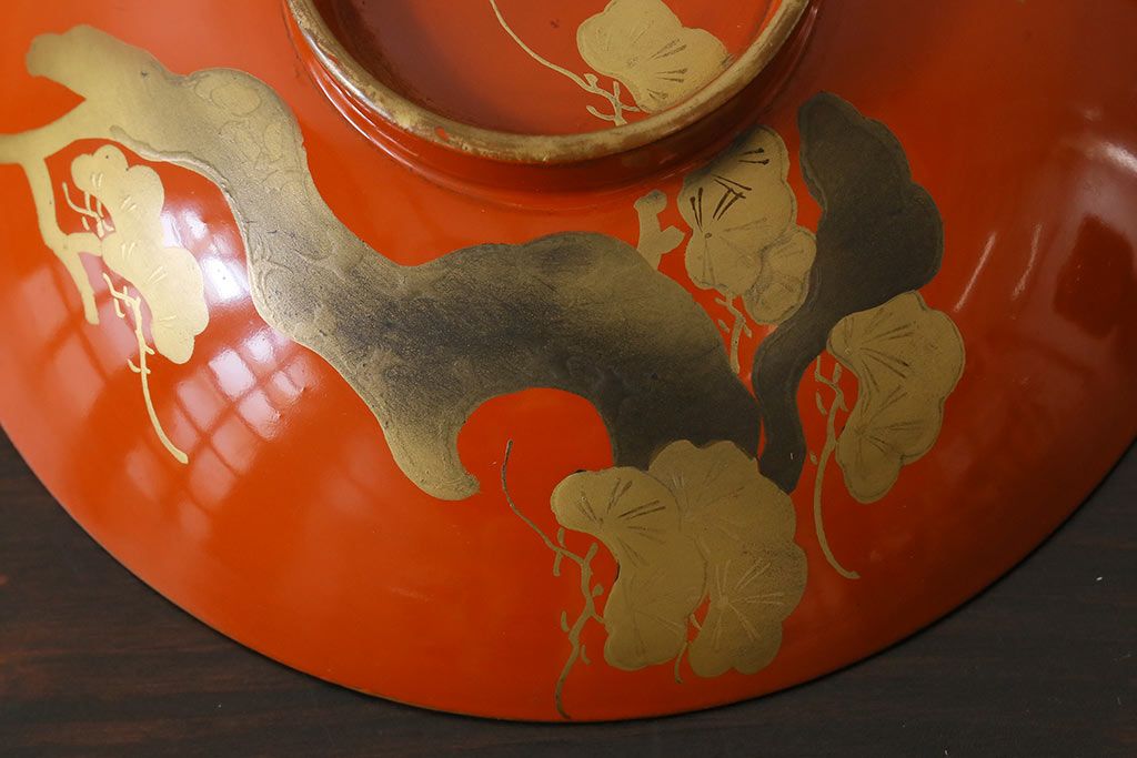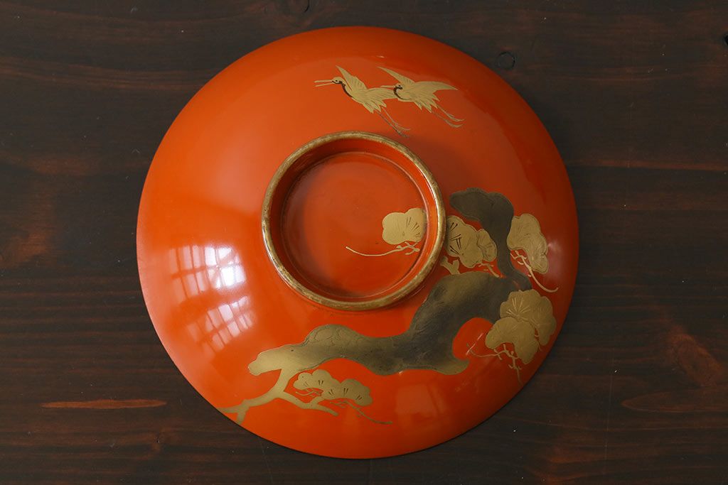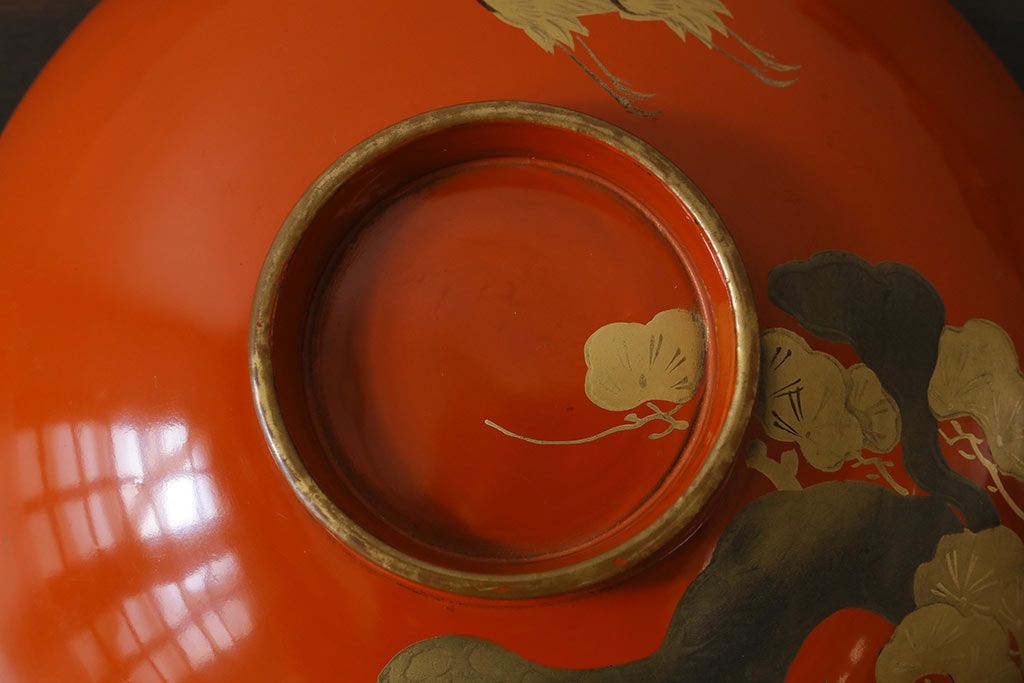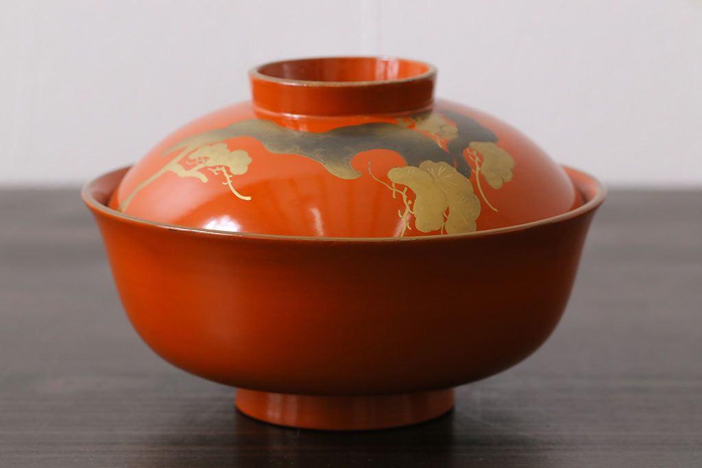 ラフジュ工房> 骨董・美術品> 骨董-漆器 > 和製アンティーク 松・鶴図柄 縁起物の蒔絵が美しい木製椀5客セット(漆器、和食器)
