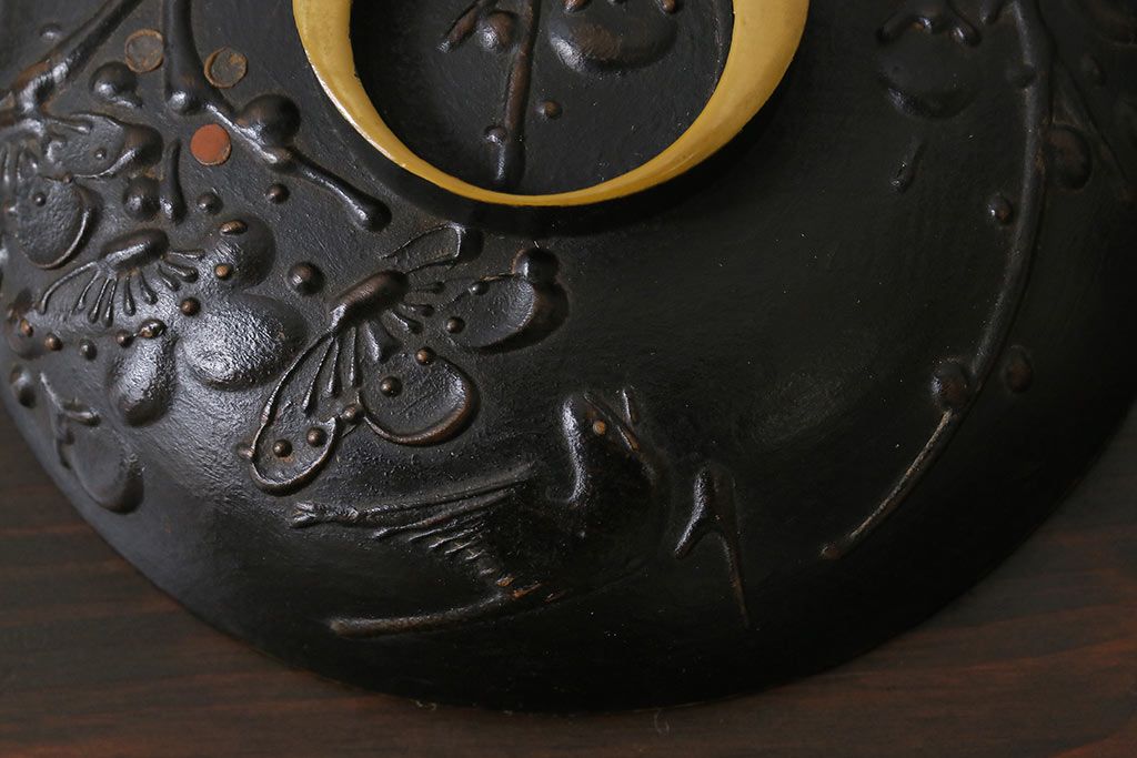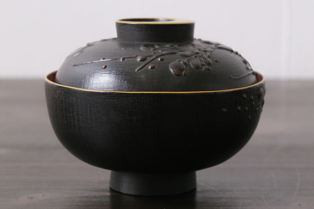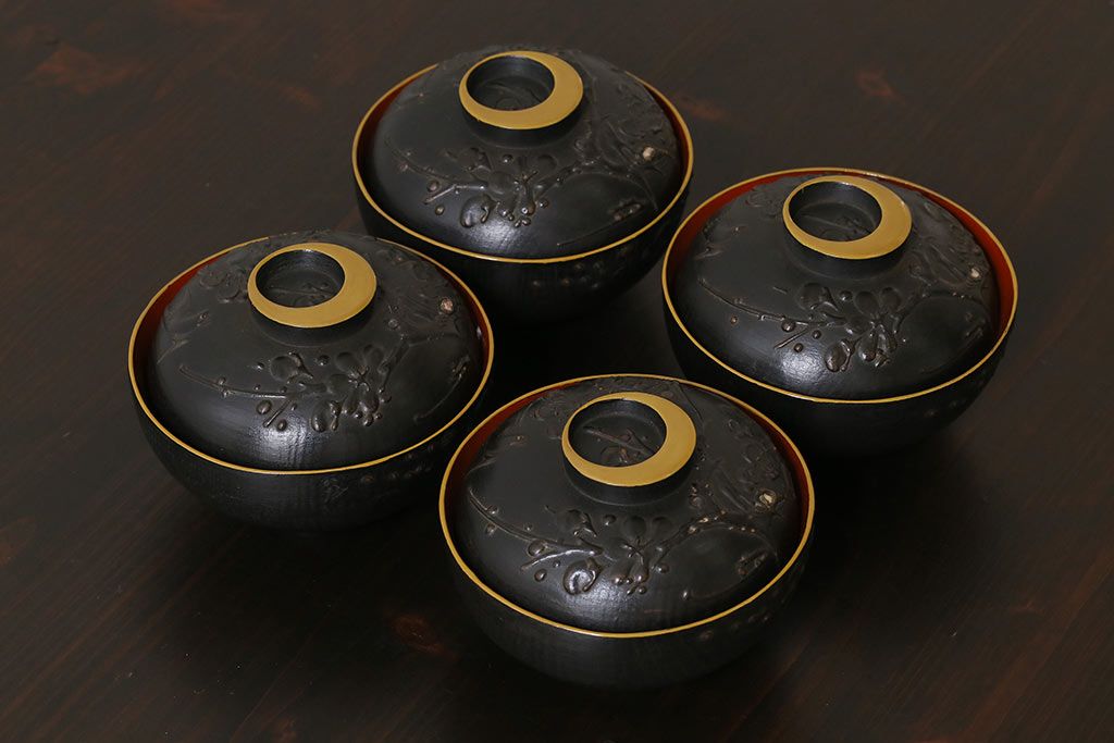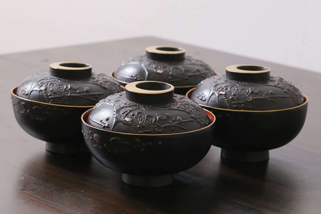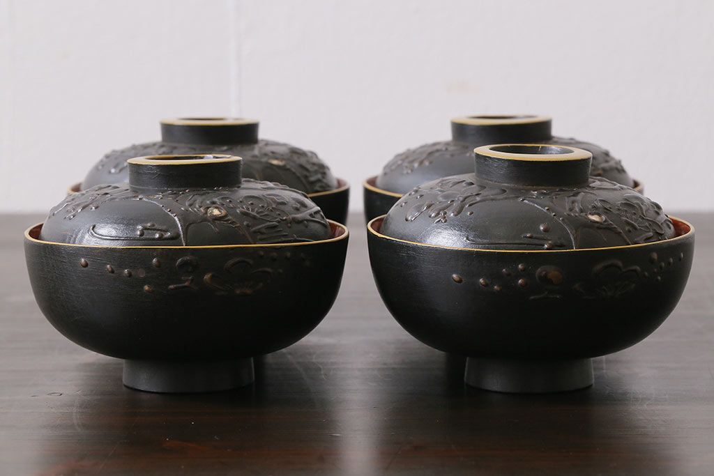 和製アンティーク 鉄錆蒔絵 赤富士の図 和モダンな蓋付椀(漆器)4客セット
