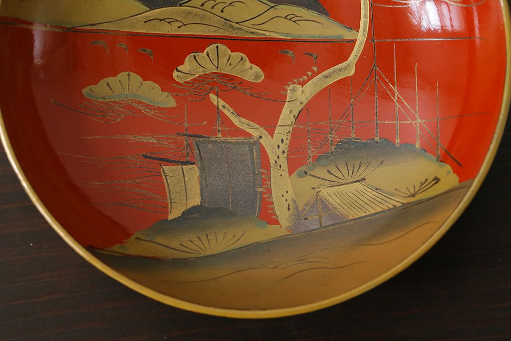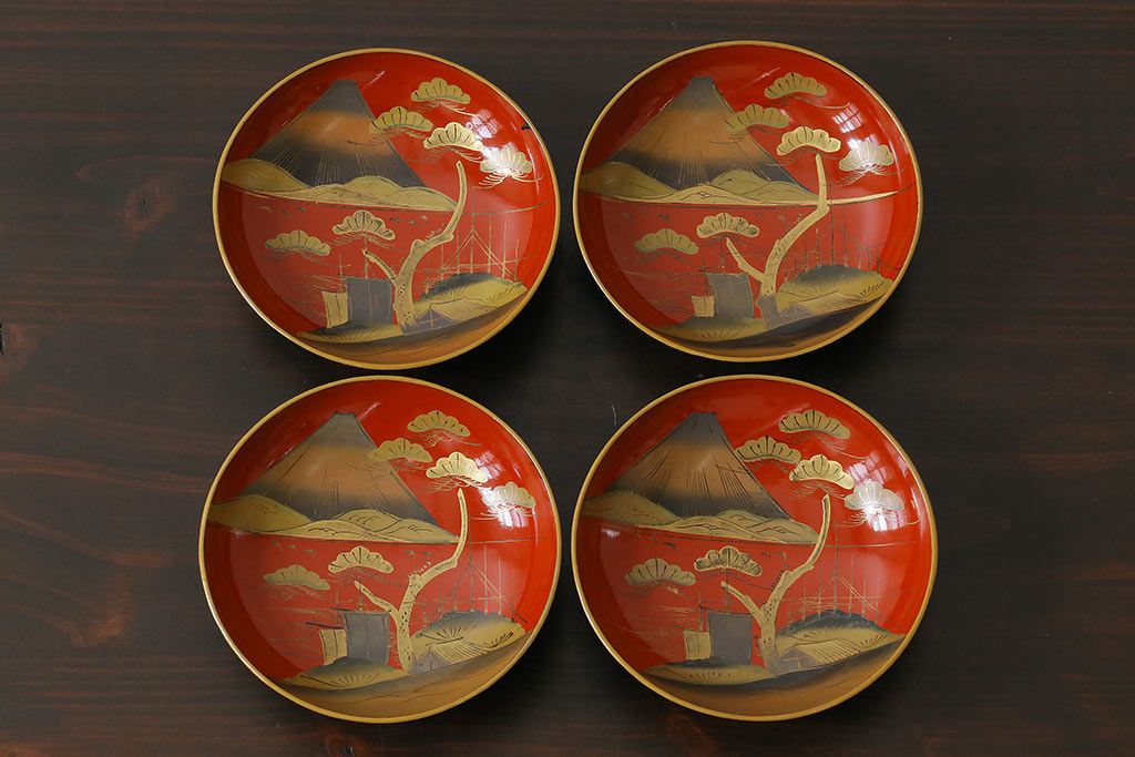 ラフジュ工房> 骨董・美術品> 骨董-漆器 > 和製アンティーク 鉄錆蒔絵 赤富士の図 和モダンな蓋付椀(漆器)4客セット