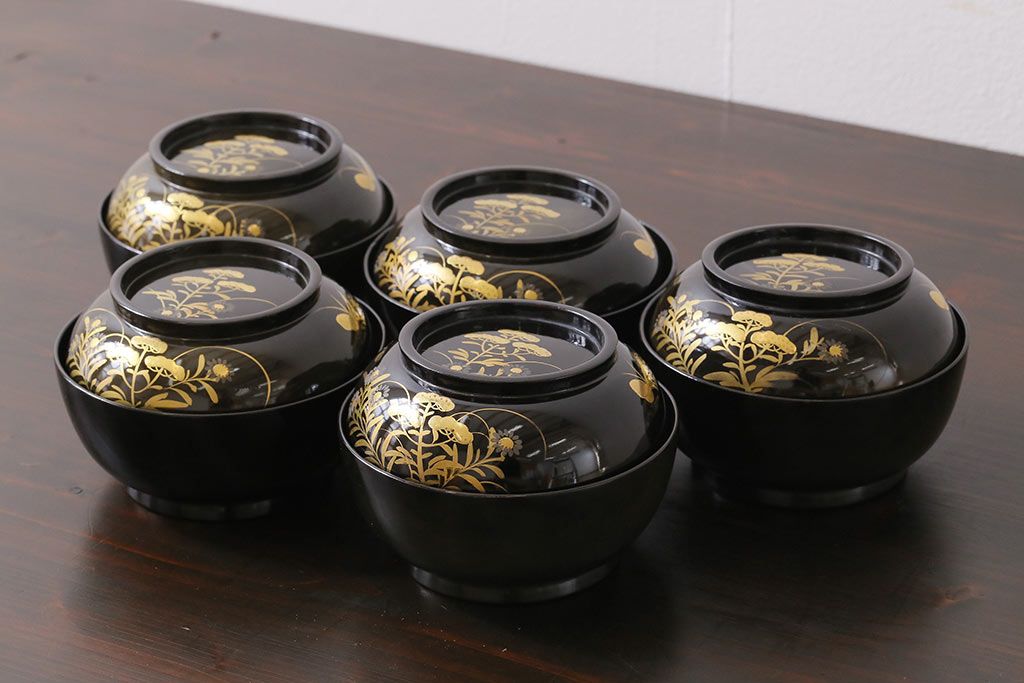 ラフジュ工房> 和食器・茶道具> お椀・茶碗 > 和製アンティーク 大正昭和初期 蝶や草花の蒔絵が品のある木製のお椀5客セット(漆器)