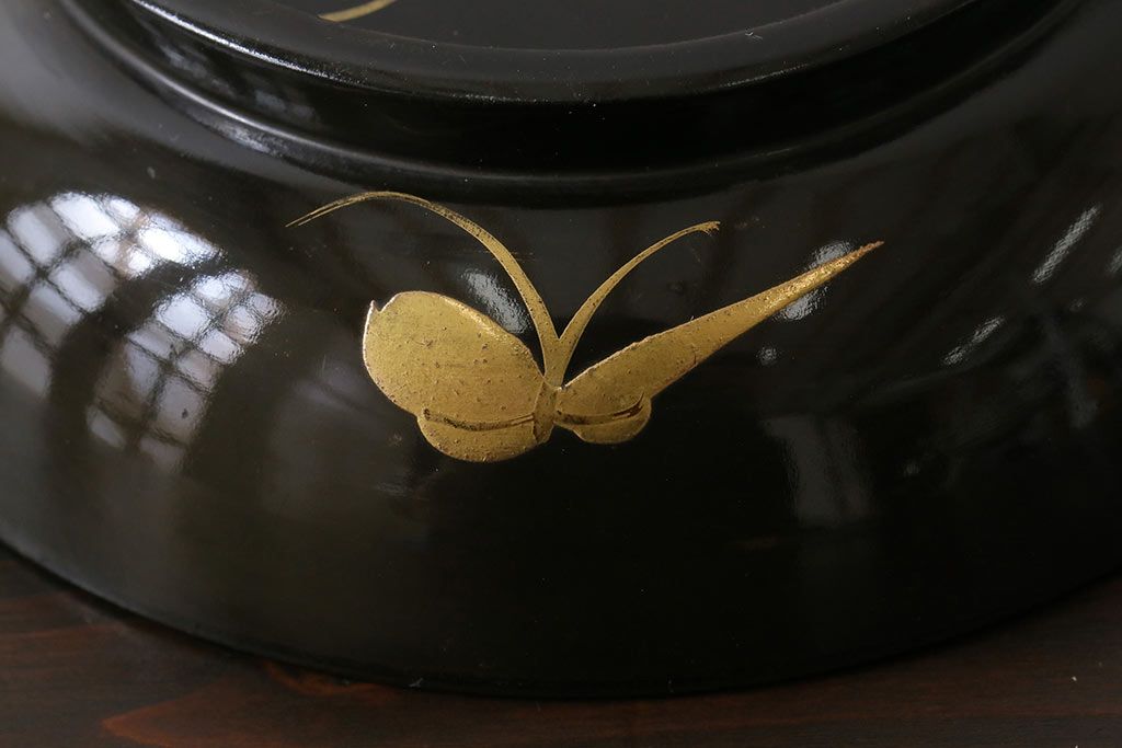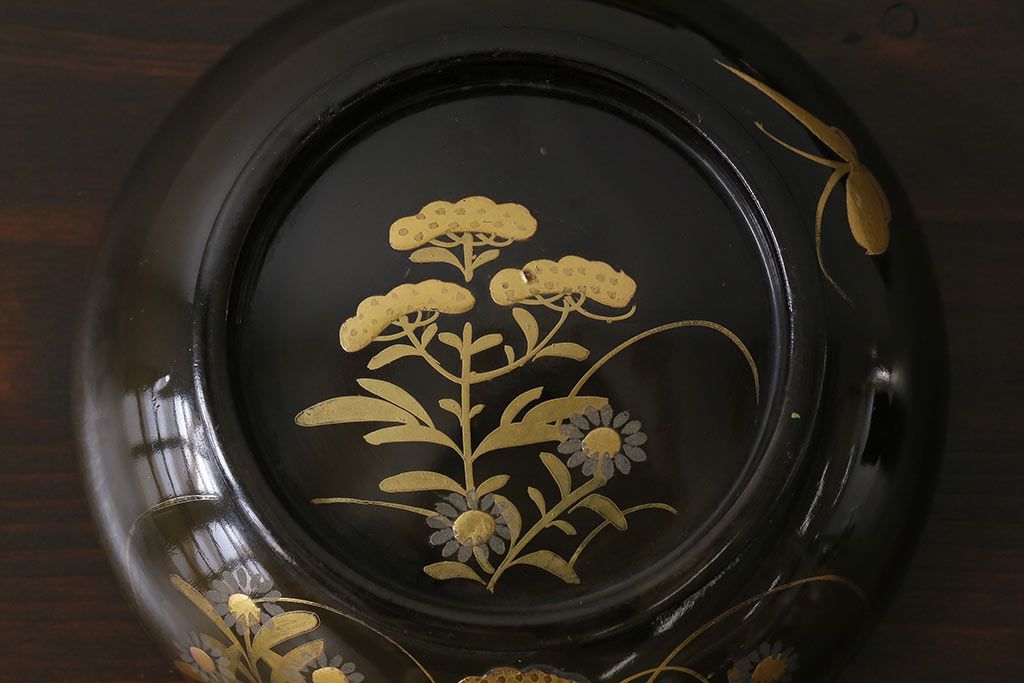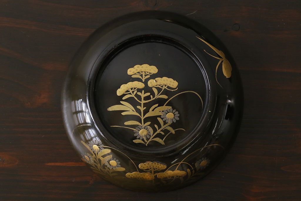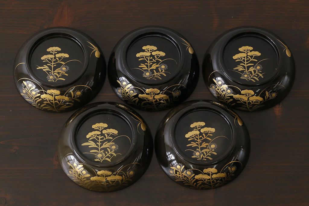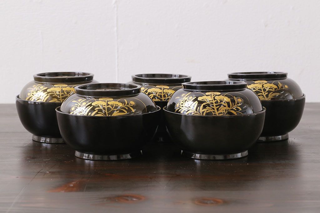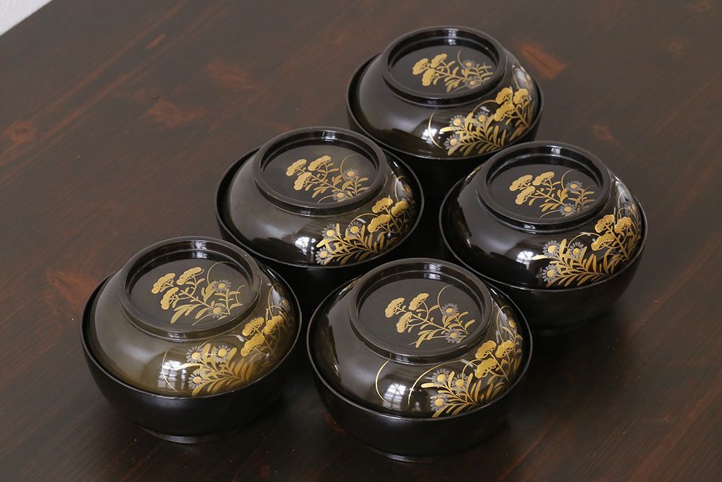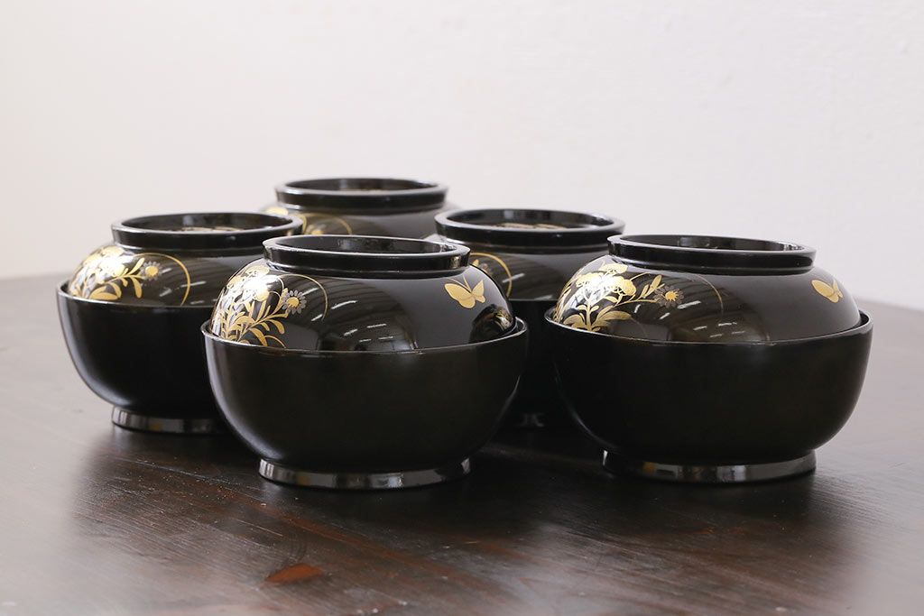 和製アンティーク 大正昭和初期 蝶や草花の蒔絵が品のある木製のお椀5客セット(漆器)
