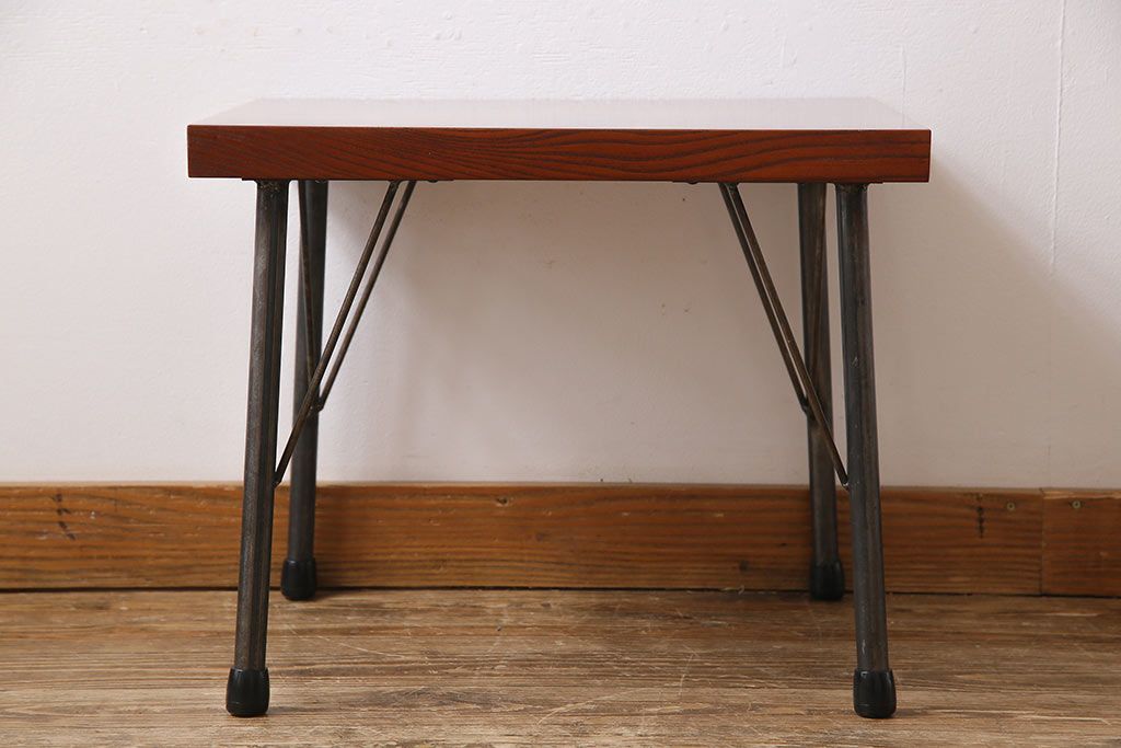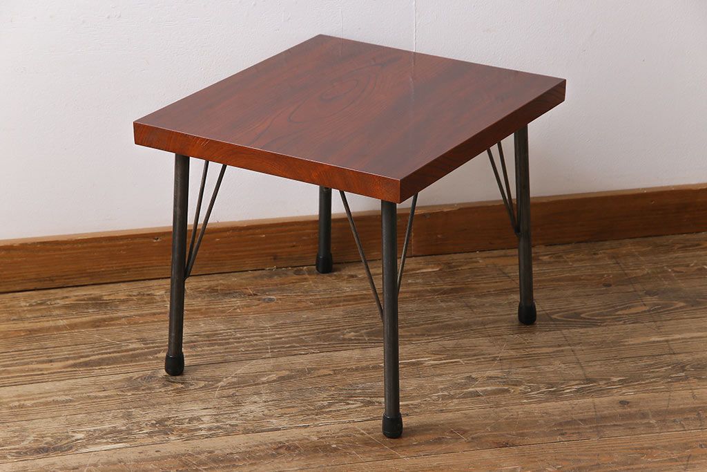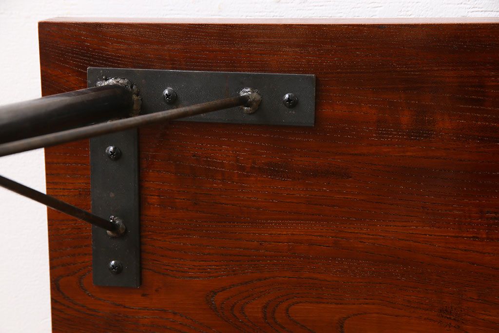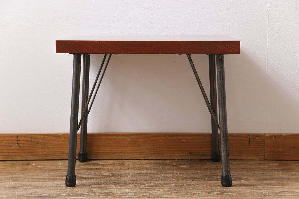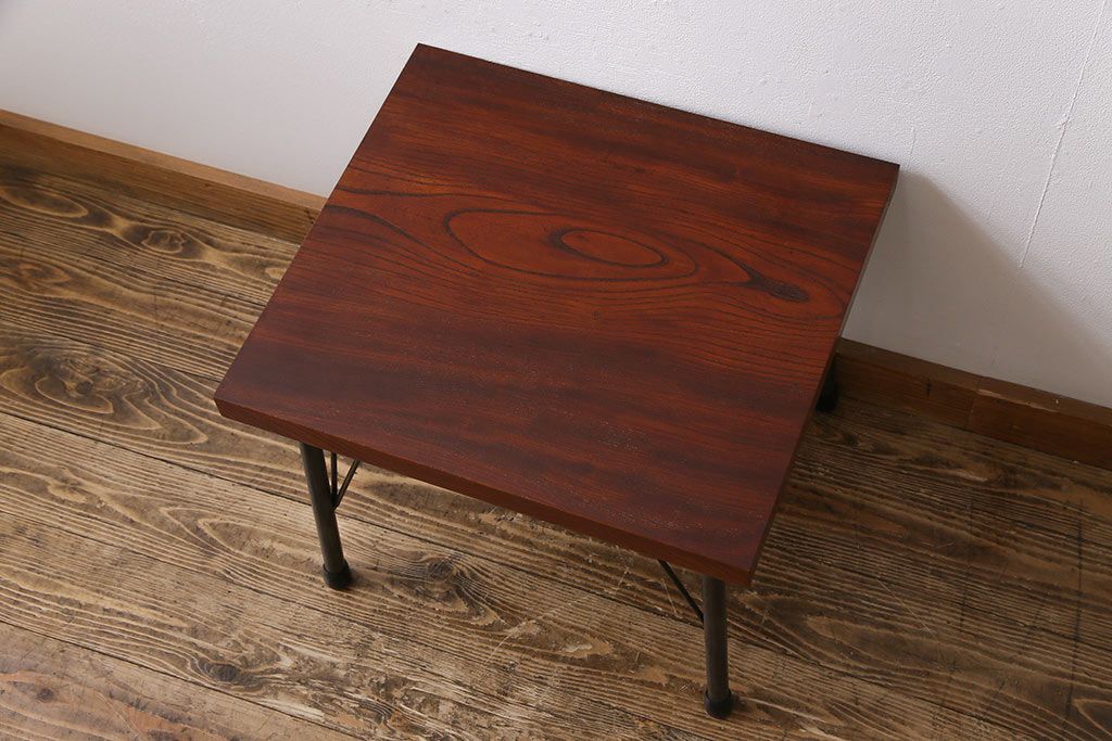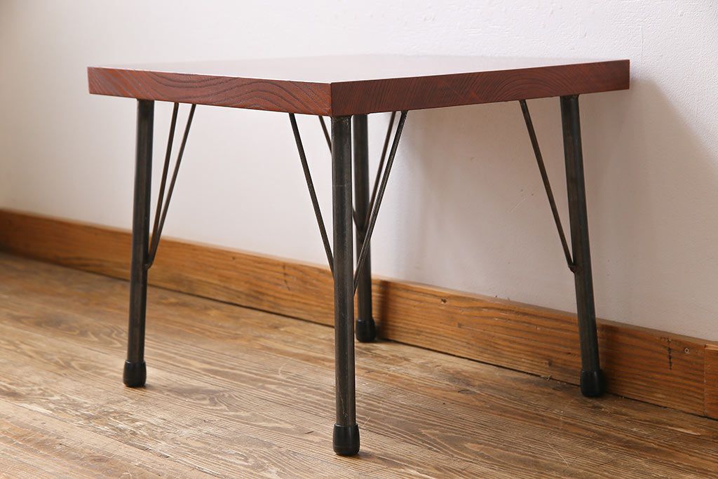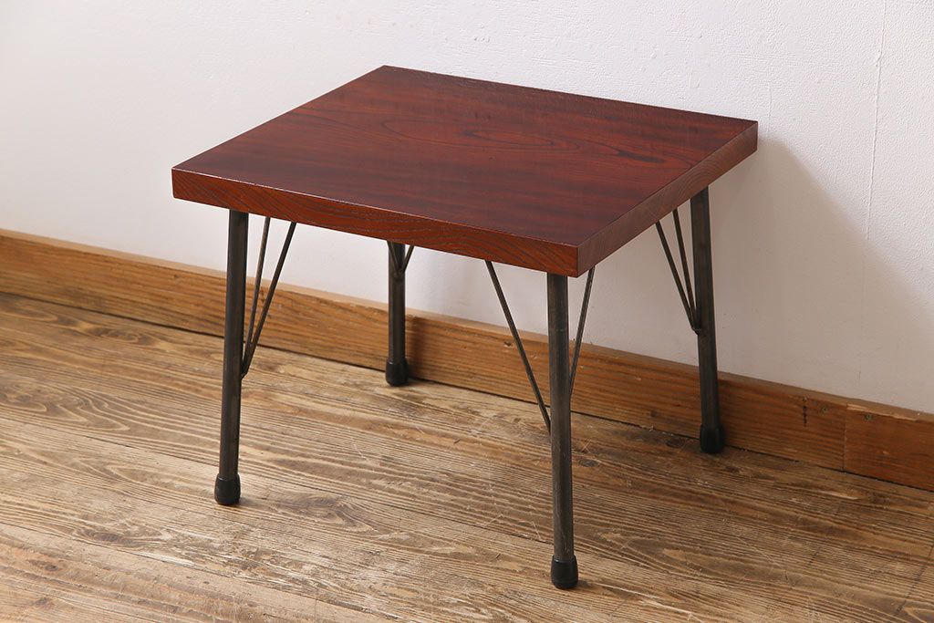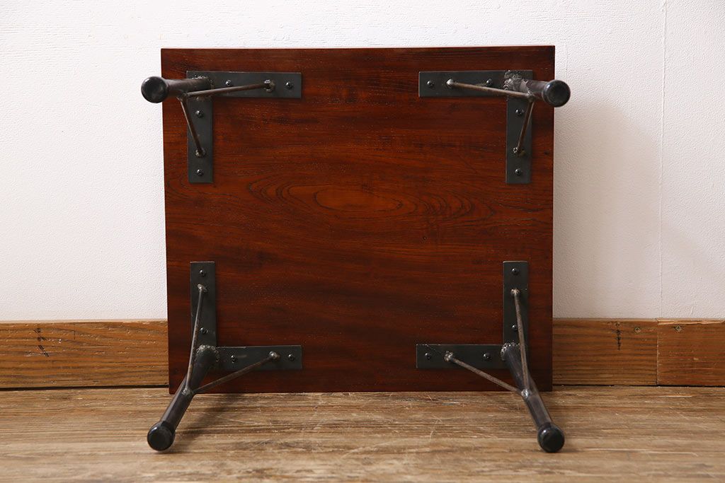 古材リメイク品 天板一枚板 漆塗り 上品な雰囲気漂うケヤキの杢目が美しい鉄脚ローテーブル(飾り台、サイドテーブル)