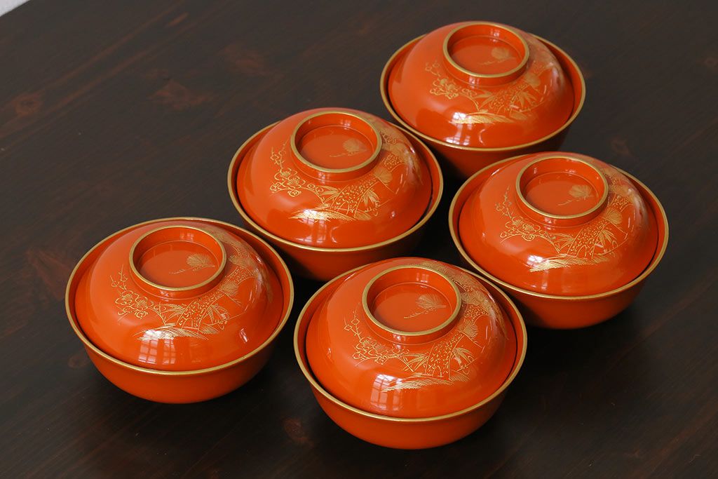 和製アンティーク 松竹梅 縁起の良い意匠の沈金朱塗椀5客セット(蓋付き椀、漆器、和食器)(1)