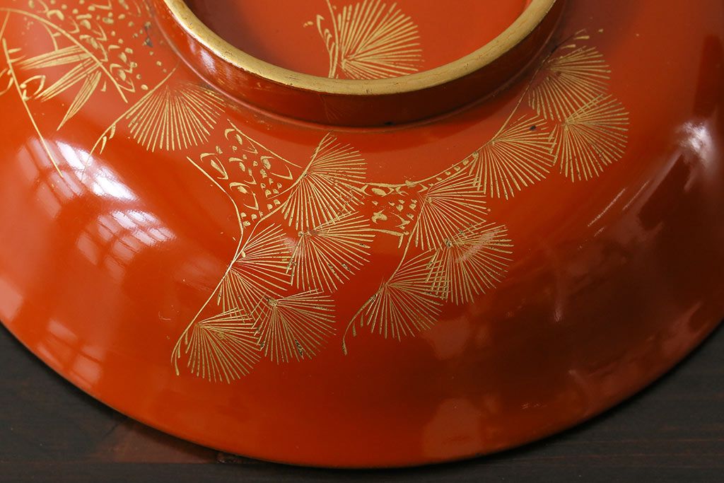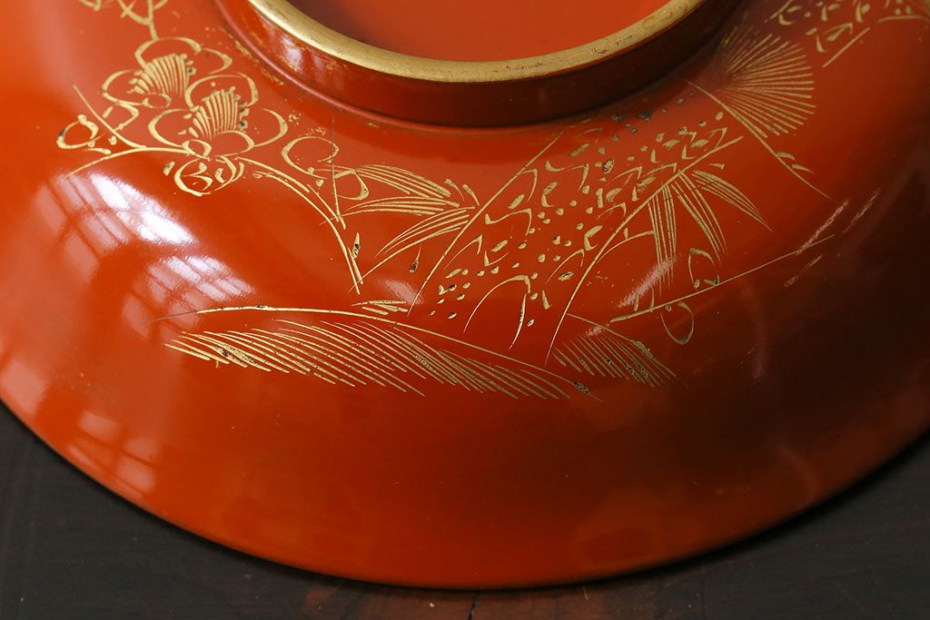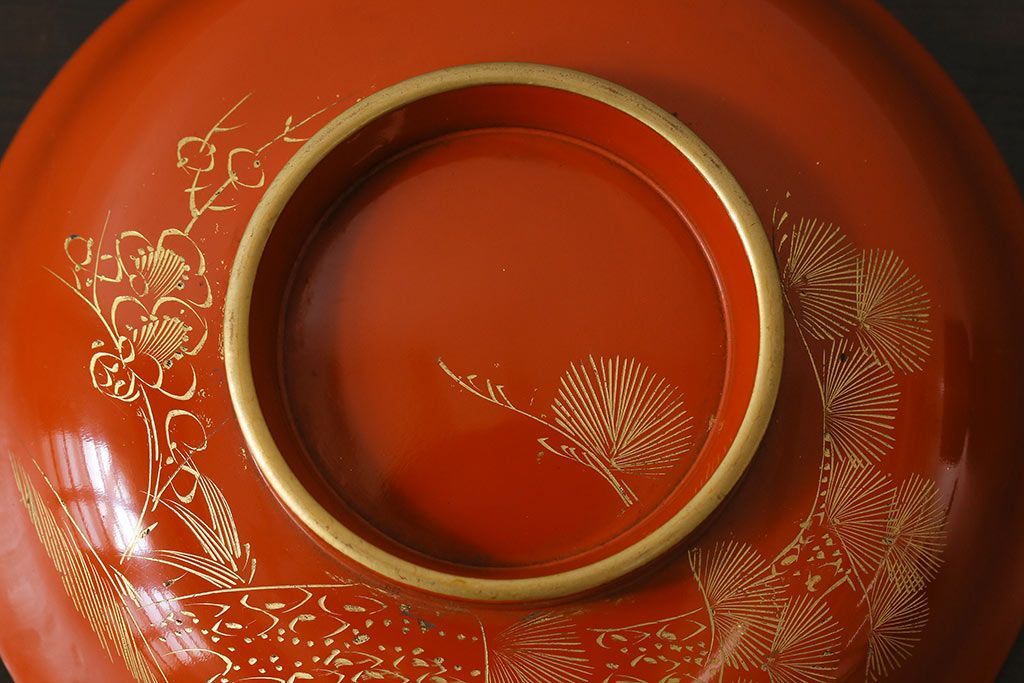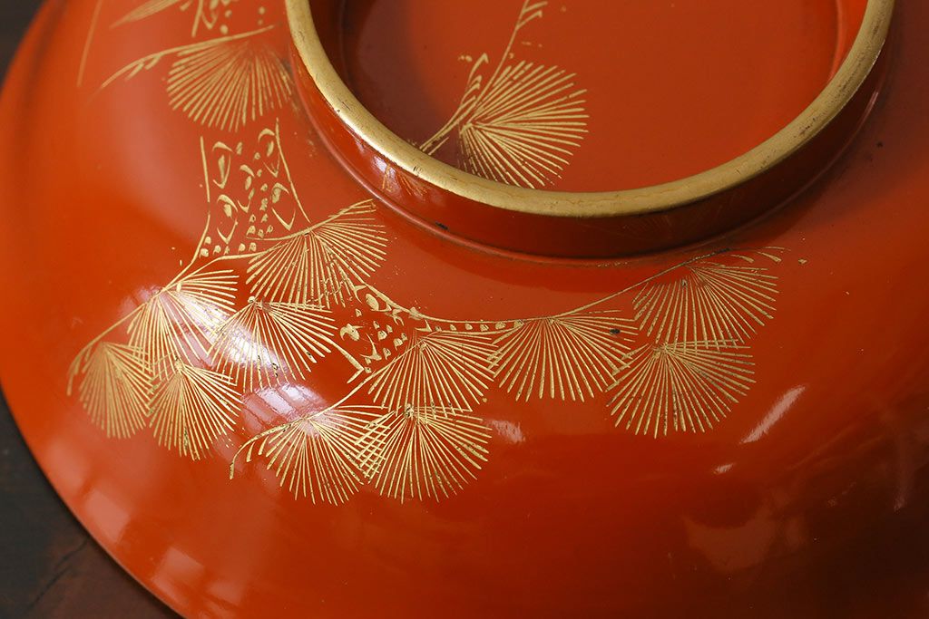 ラフジュ工房> 骨董・美術品> 骨董-漆器 > 和製アンティーク 松竹梅 縁起の良い意匠の沈金朱塗椀5客セット(蓋付き椀、漆器、和食器)(1)