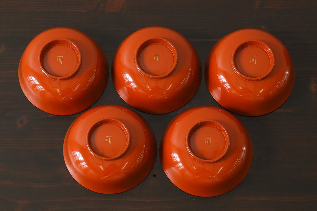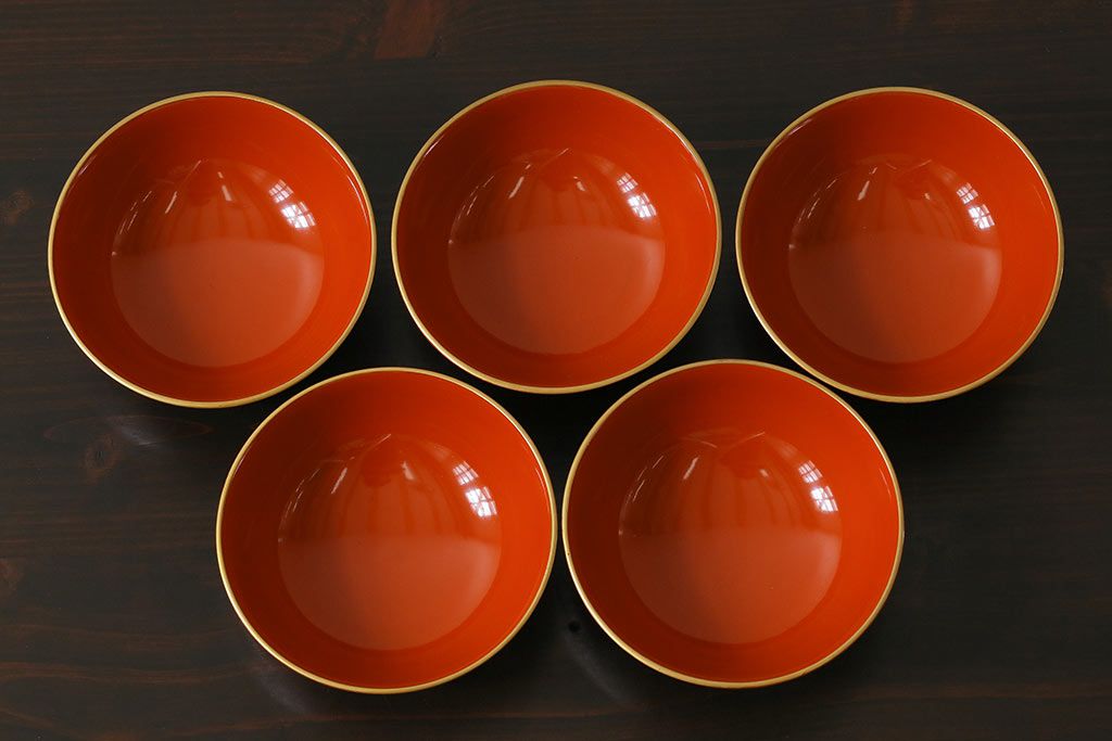 ラフジュ工房> 和食器・茶道具> お椀・茶碗 > 和製アンティーク 松竹梅 縁起の良い意匠の沈金朱塗椀5客セット(蓋付き椀、漆器、和食器)(1)