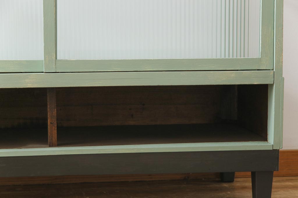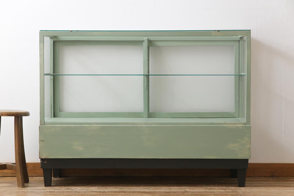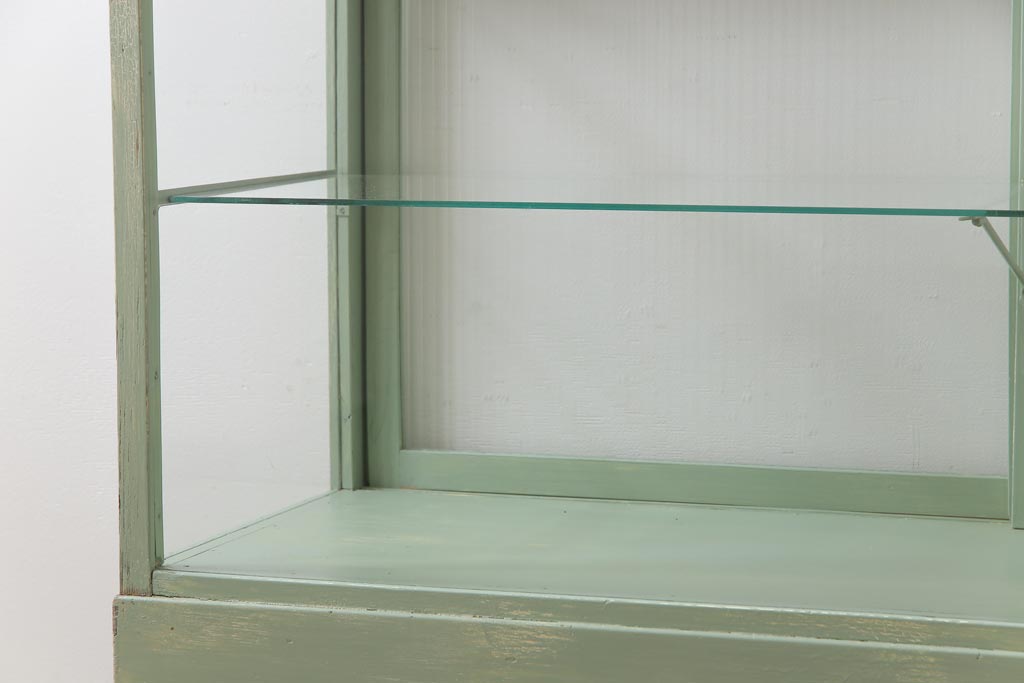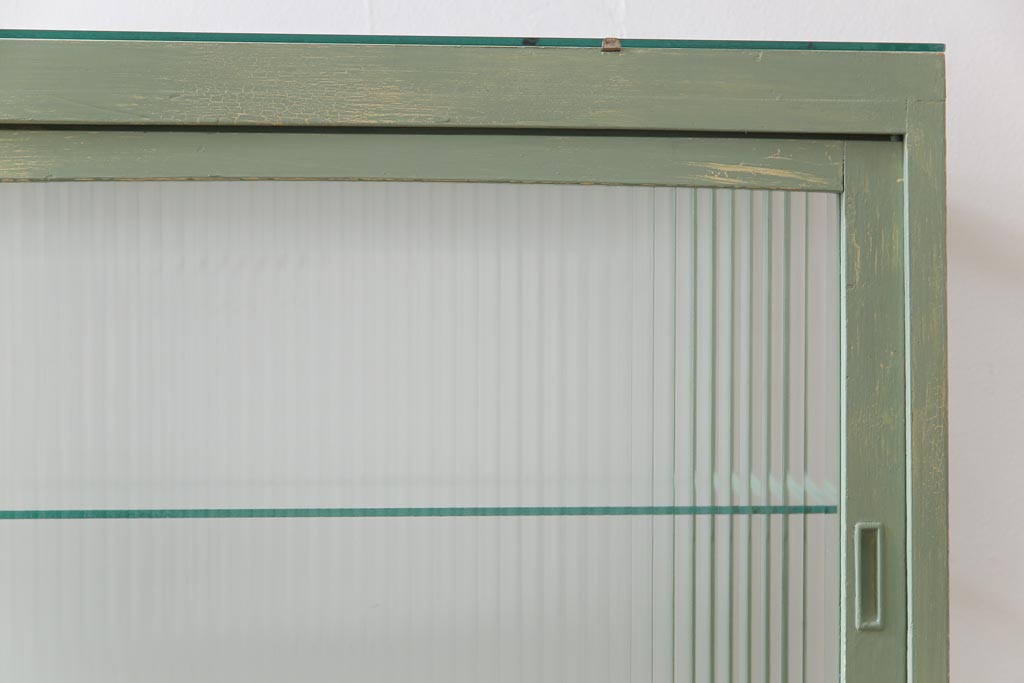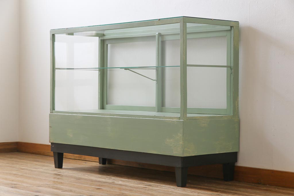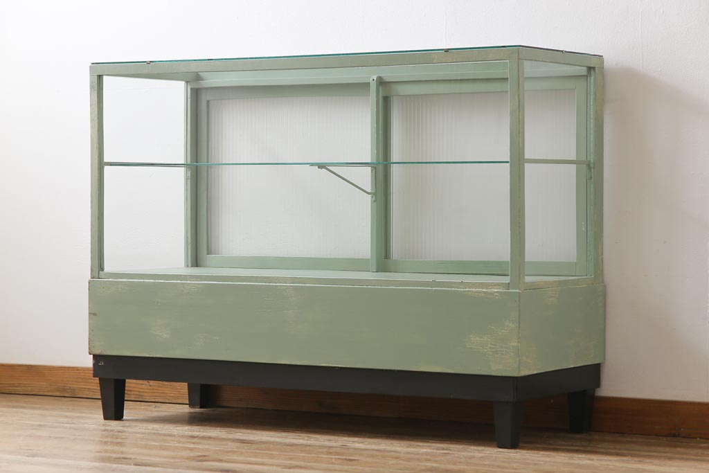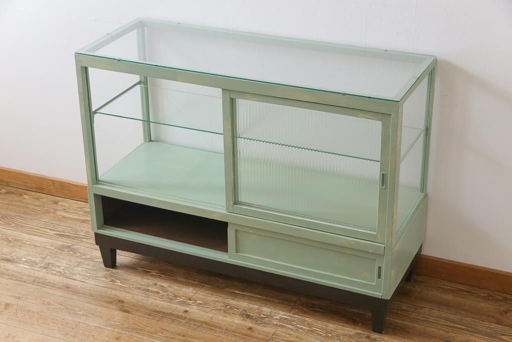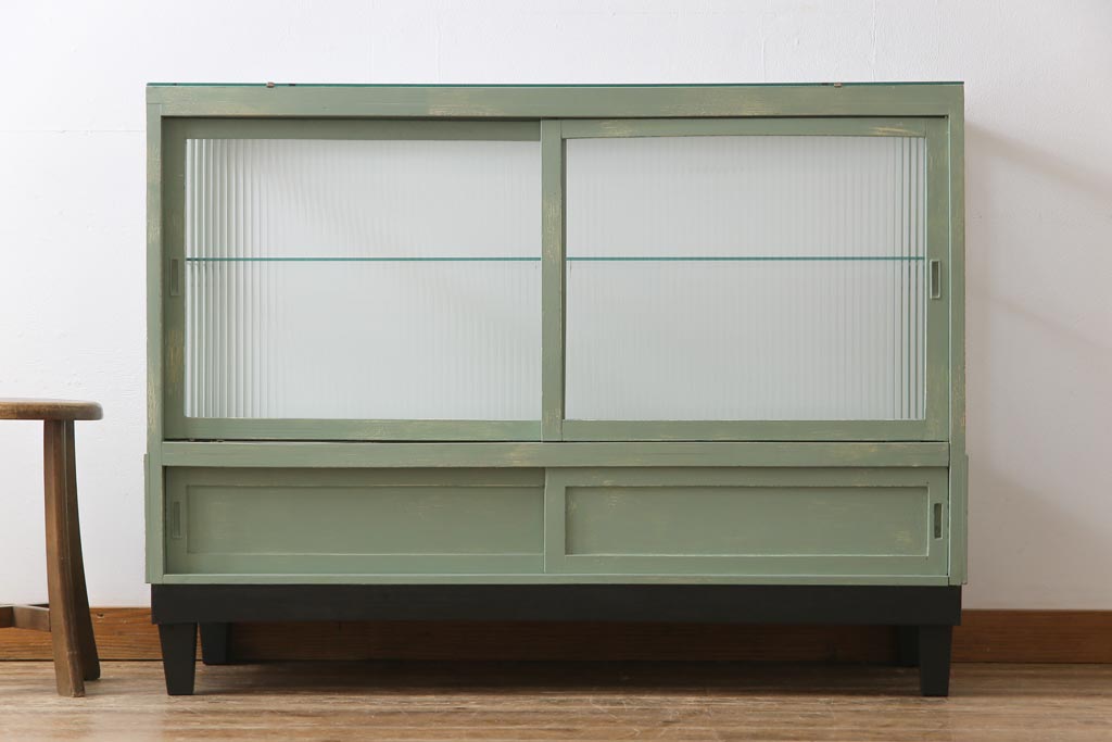 ペイント家具 モールガラス入り 引き戸収納付きレトロなガラスケース(ショーケース、陳列棚、飾り棚)