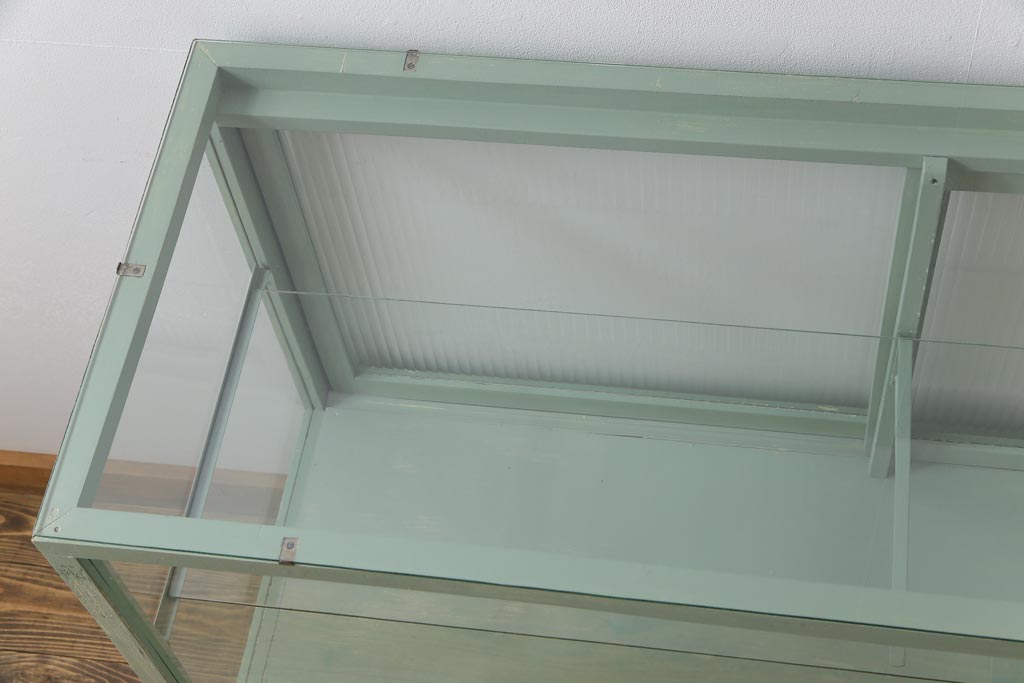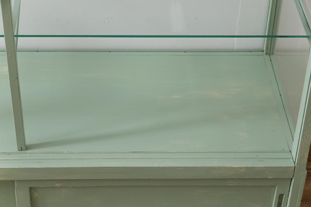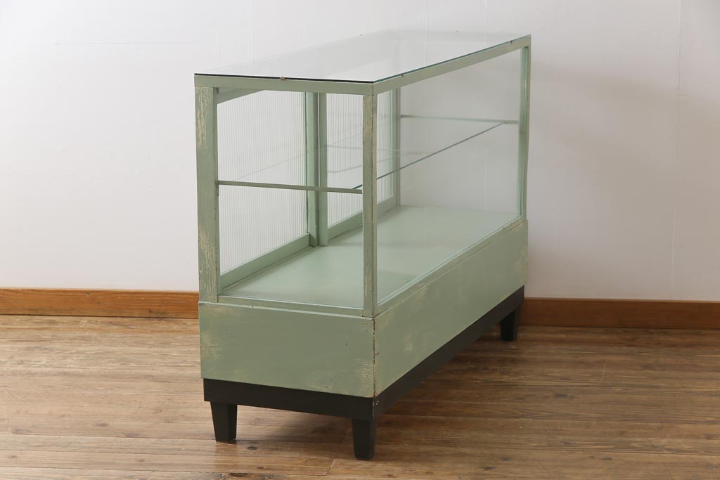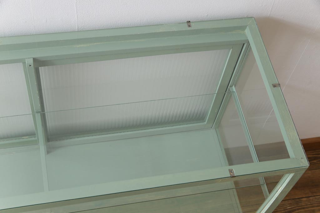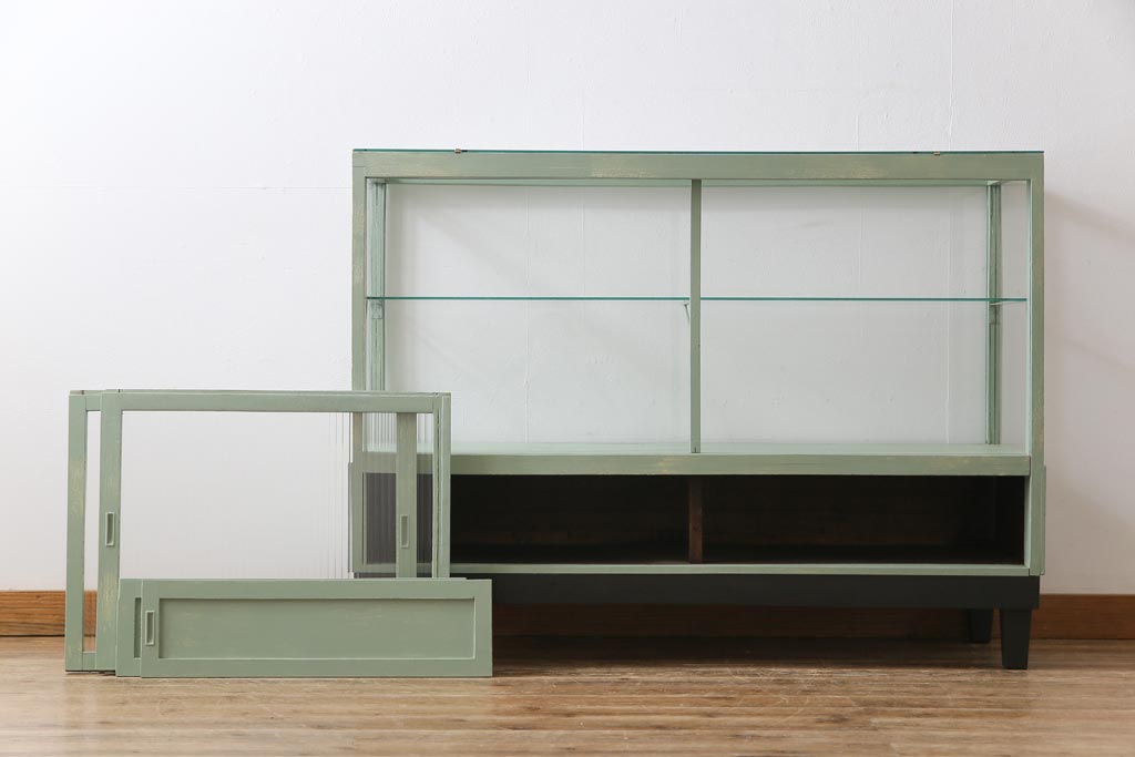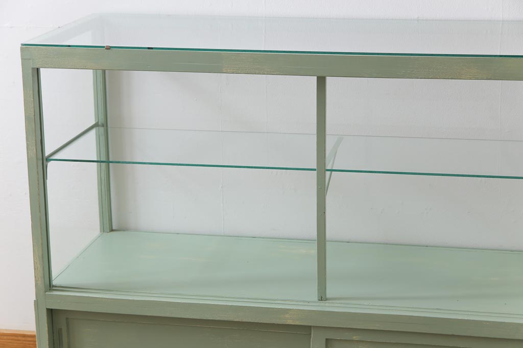 ラフジュ工房> 店舗什器 > ペイント家具 モールガラス入り 引き戸収納付きレトロなガラスケース(ショーケース、陳列棚、飾り棚)