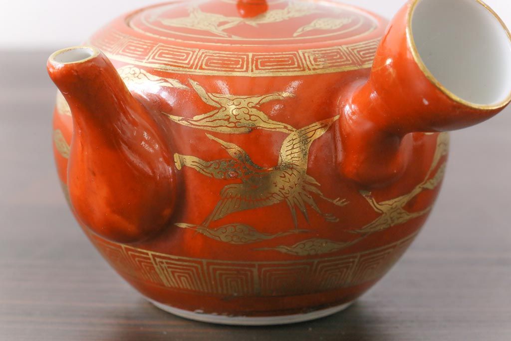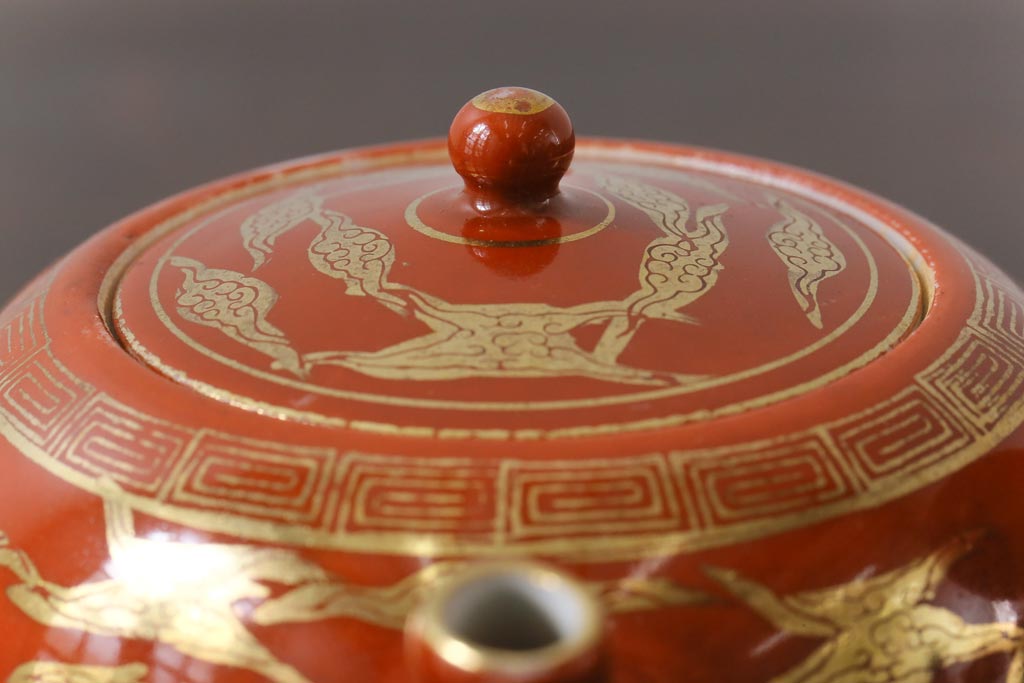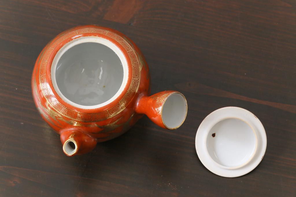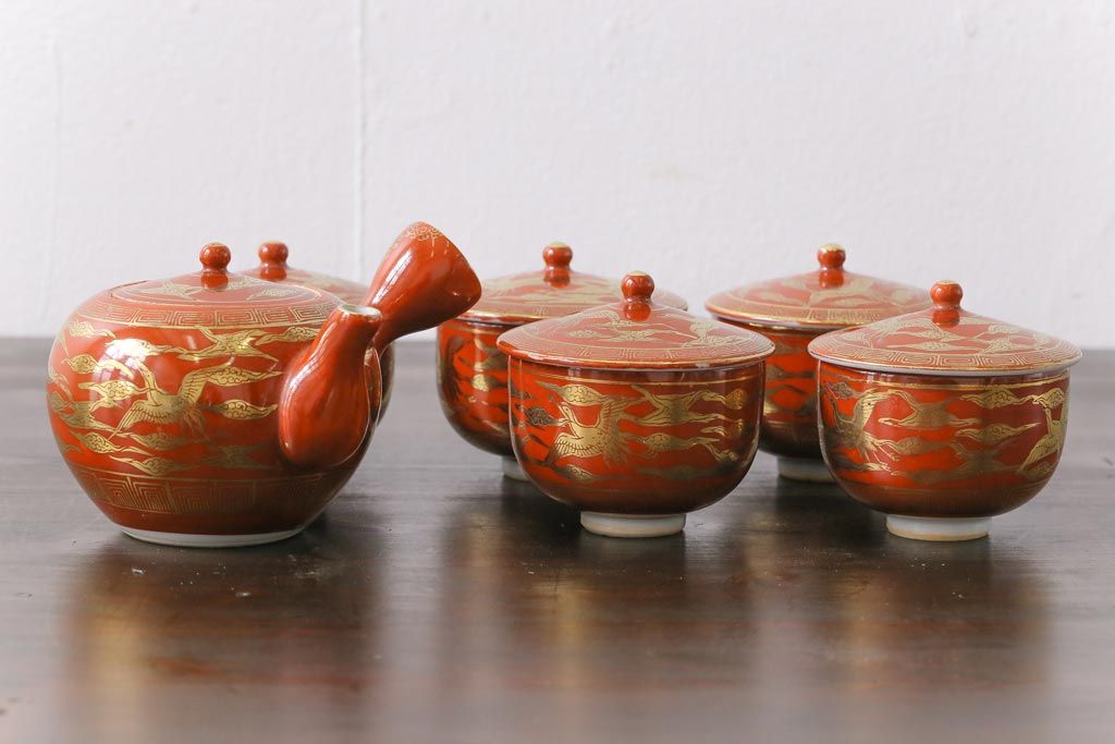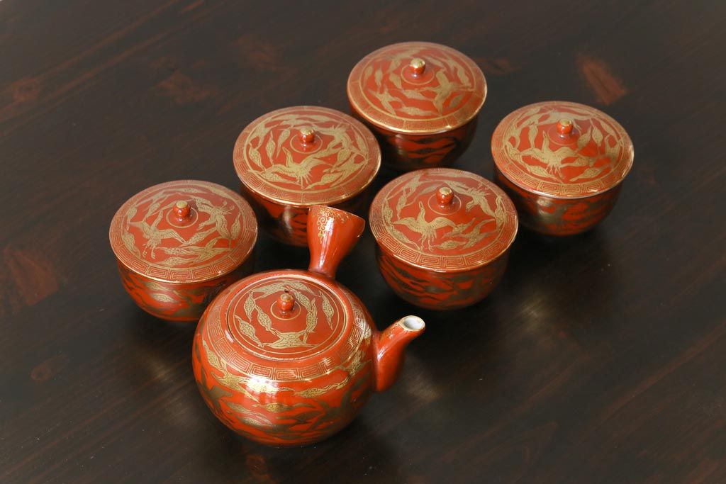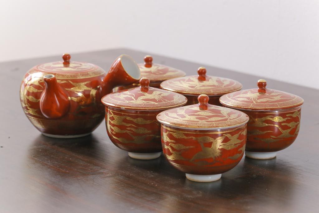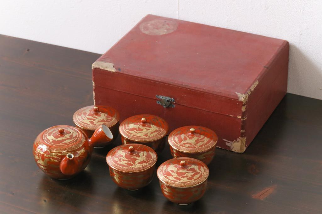 和製アンティーク 九谷赤絵 箱付き 急須・湯呑茶碗 茶器セット(九谷焼、和食器)
