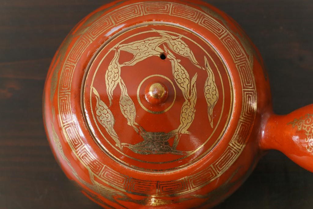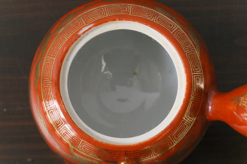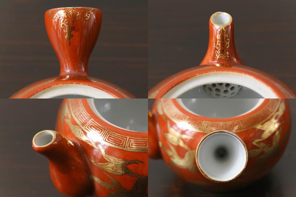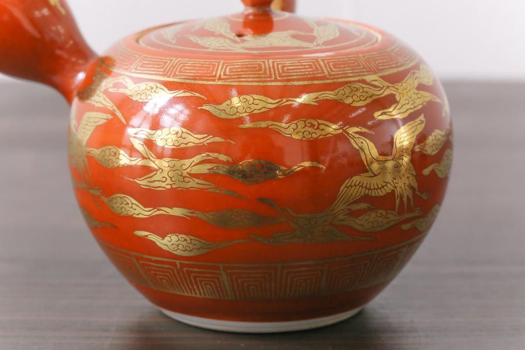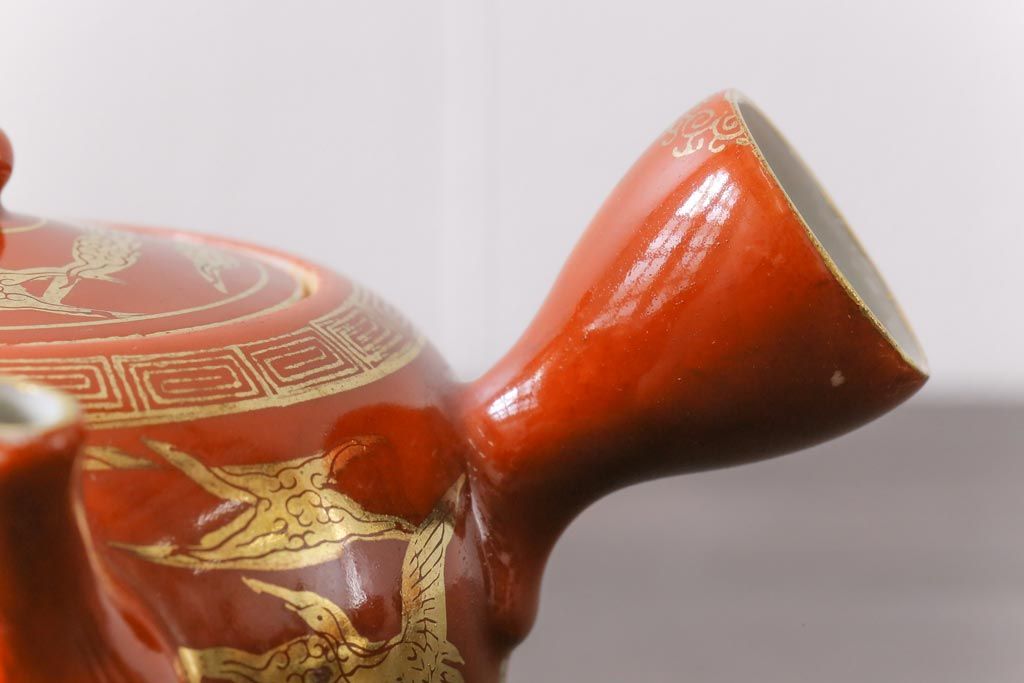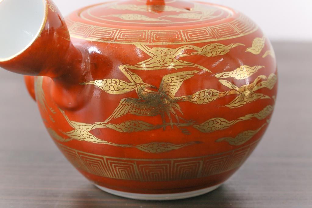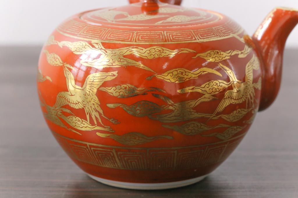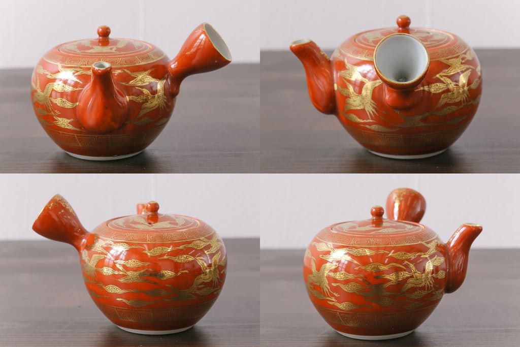 和製アンティーク 九谷赤絵 箱付き 急須・湯呑茶碗 茶器セット(九谷焼、和食器)
