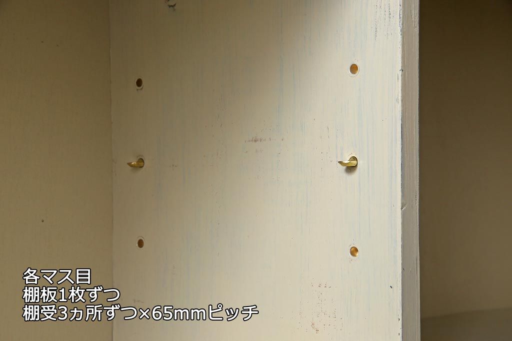 棚板は取り外しできます。棚板は、各マス目1枚あります。棚幅サイズのものが1枚の作りです。棚受けは3ヶ所、65mmピッチで調整できます。